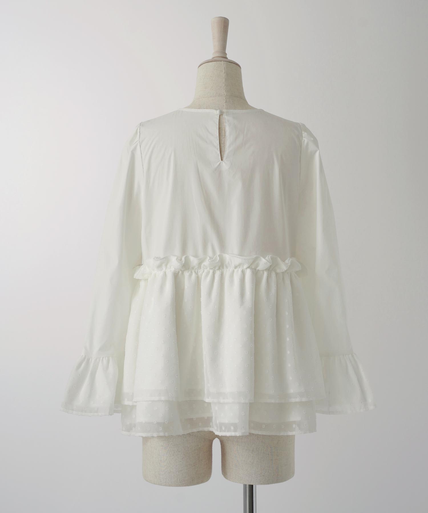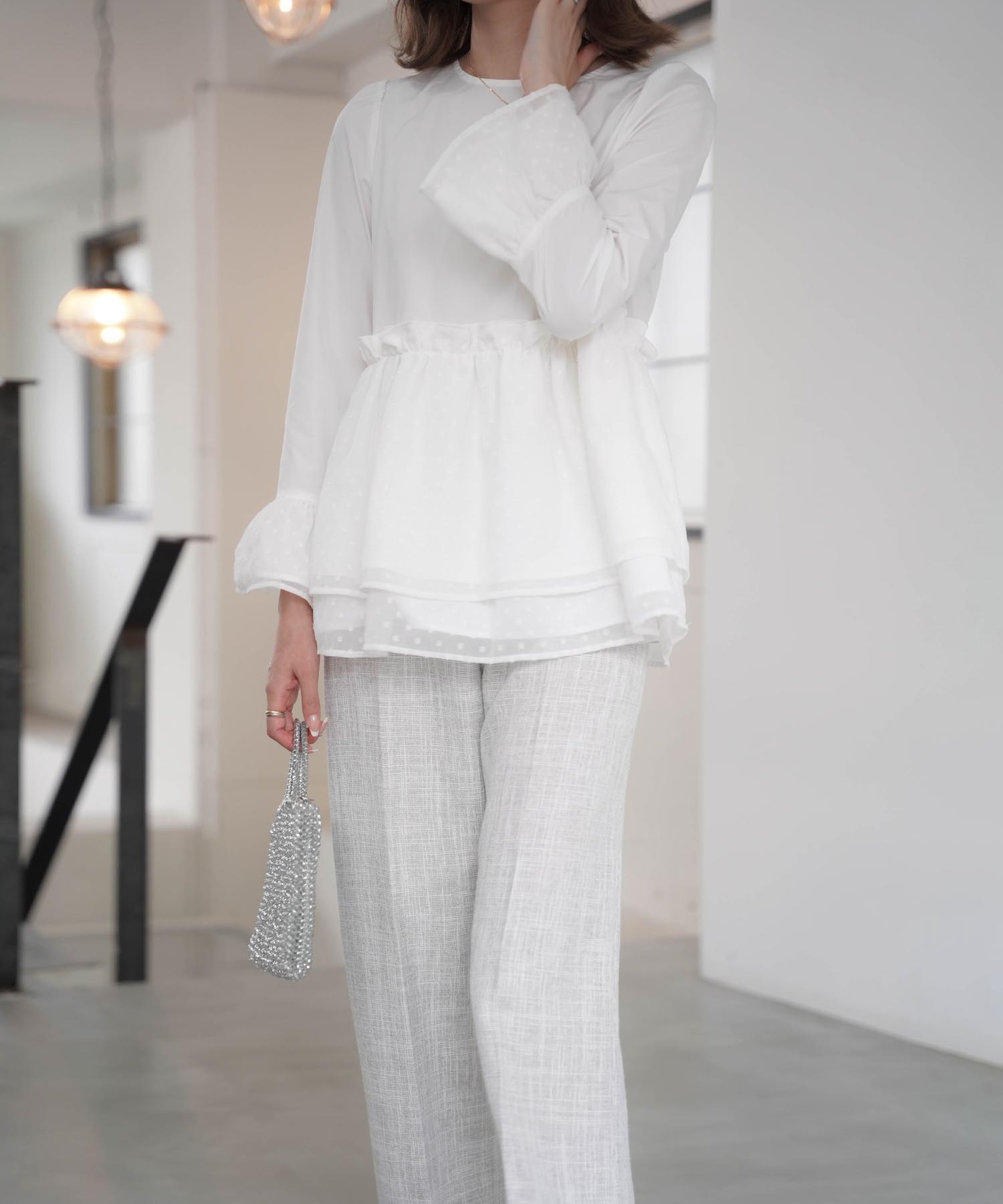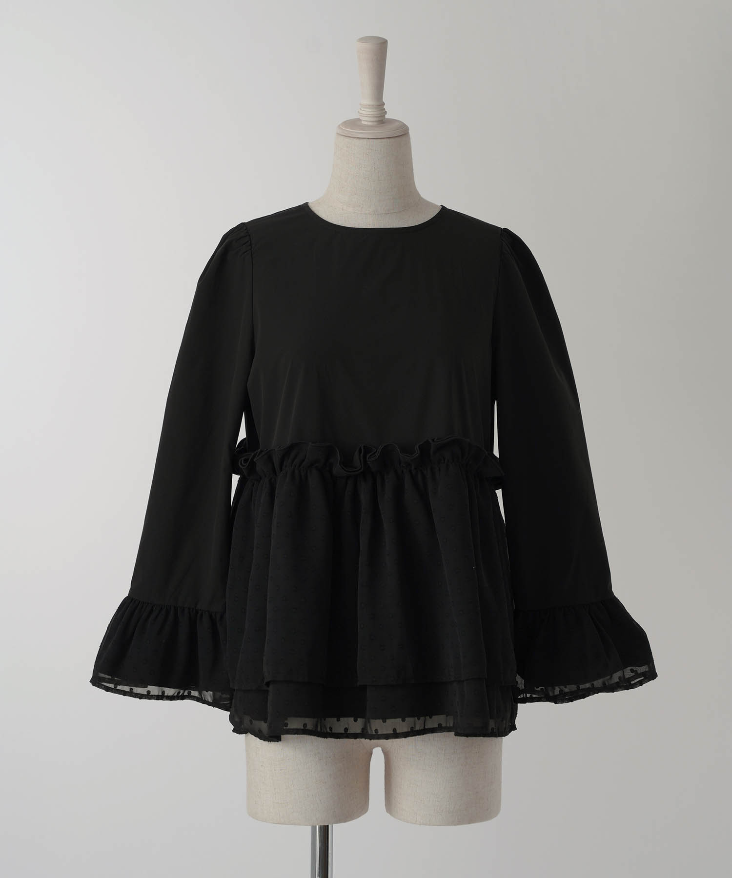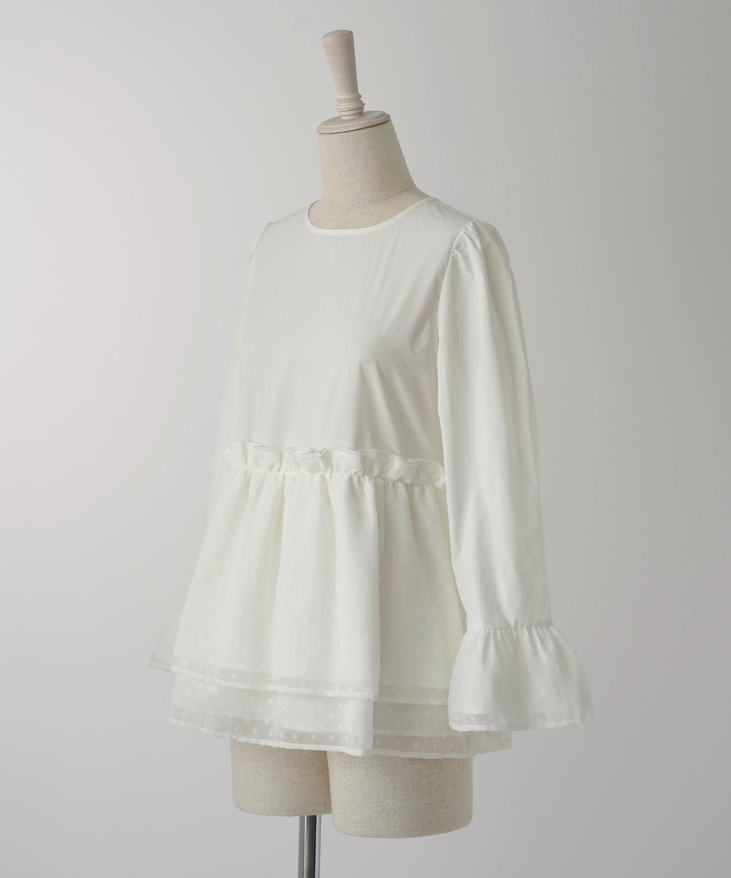 ドットのシフォンがアクセントの華やかなブラウス。歩くたびに揺れるシフォンが優雅でシンプルながら存在感のある一枚です。