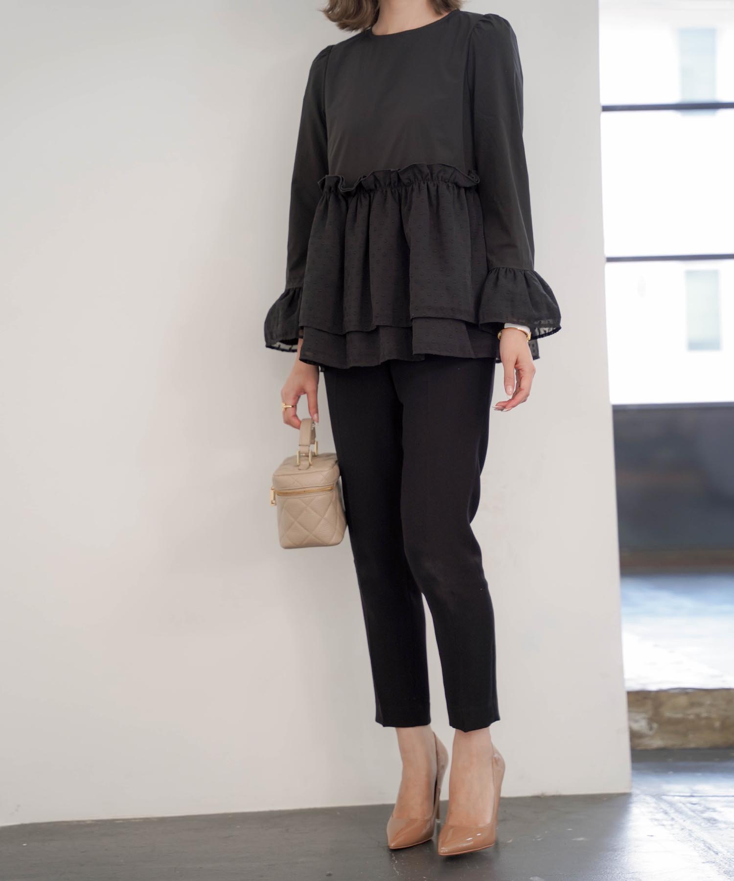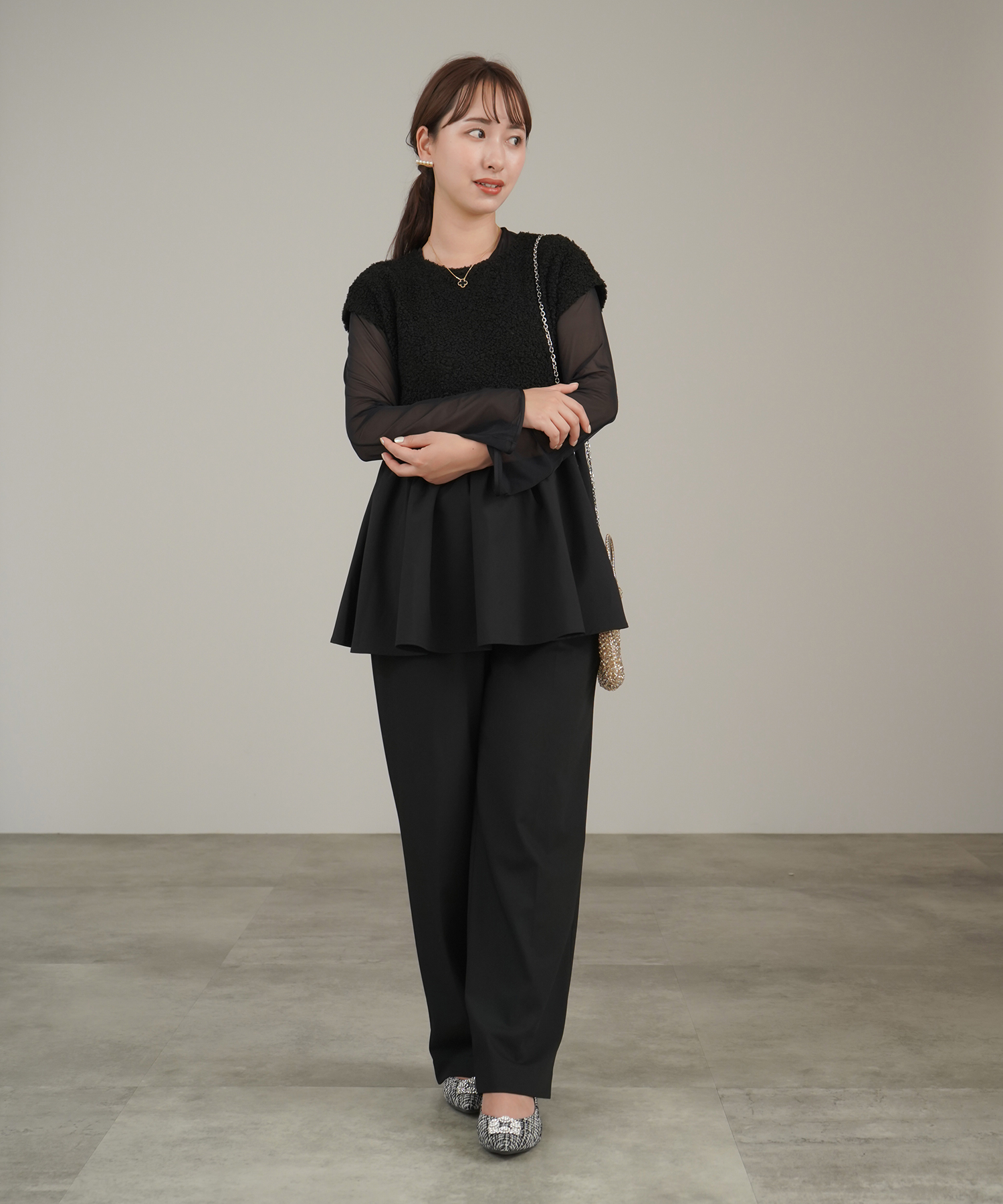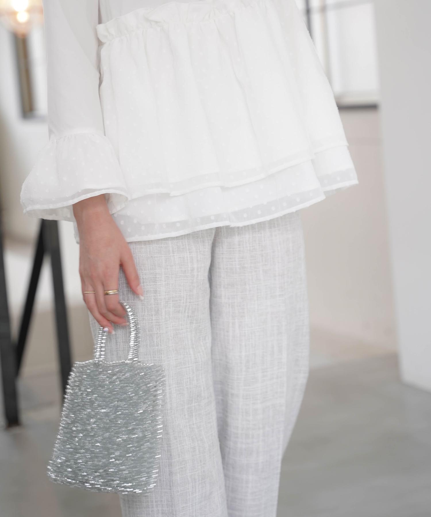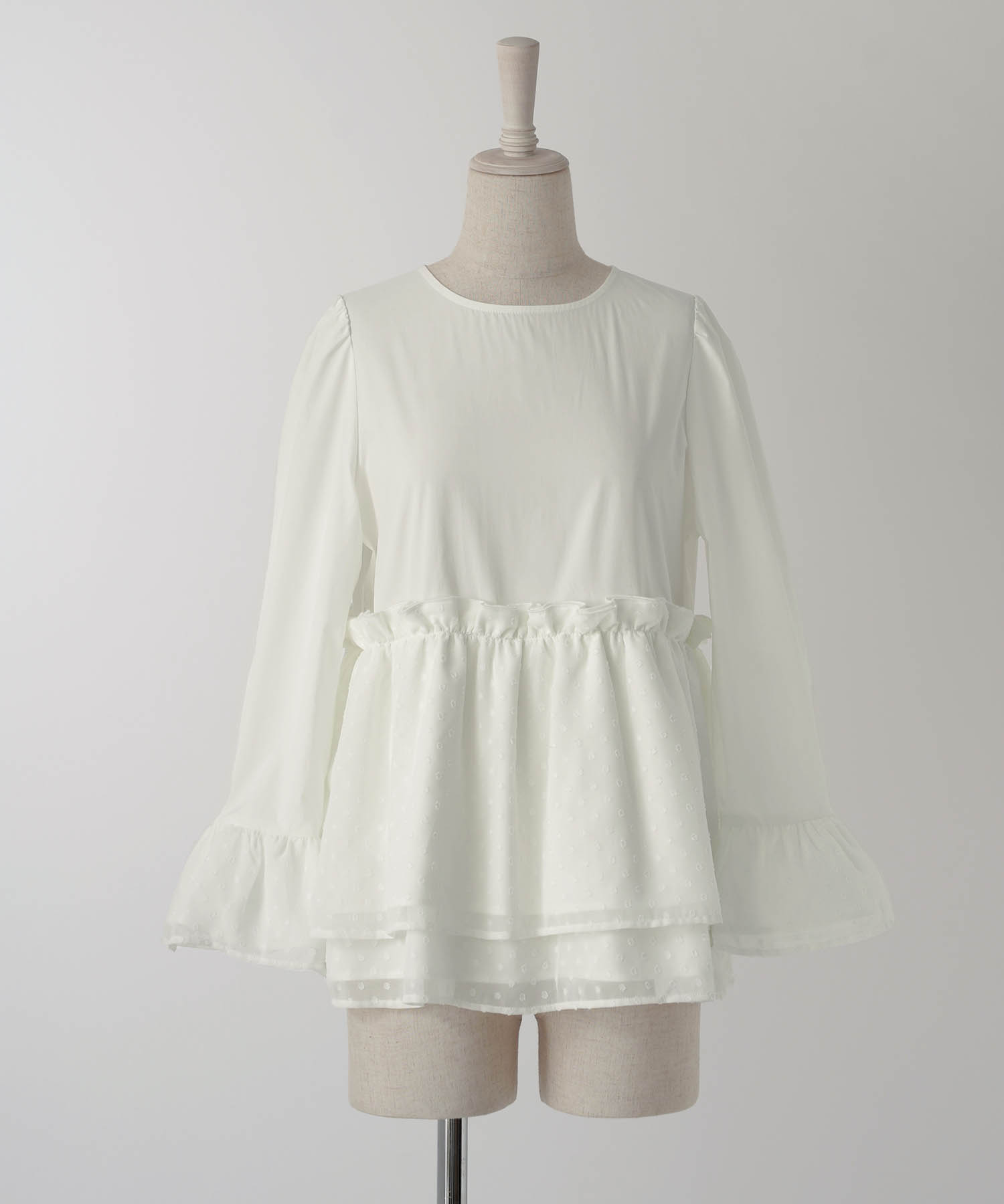 ドットのシフォンがアクセントの華やかなブラウス。歩くたびに揺れるシフォンが優雅でシンプルながら存在感のある一枚です。