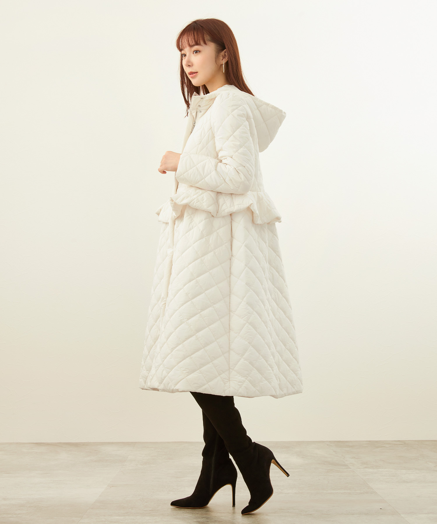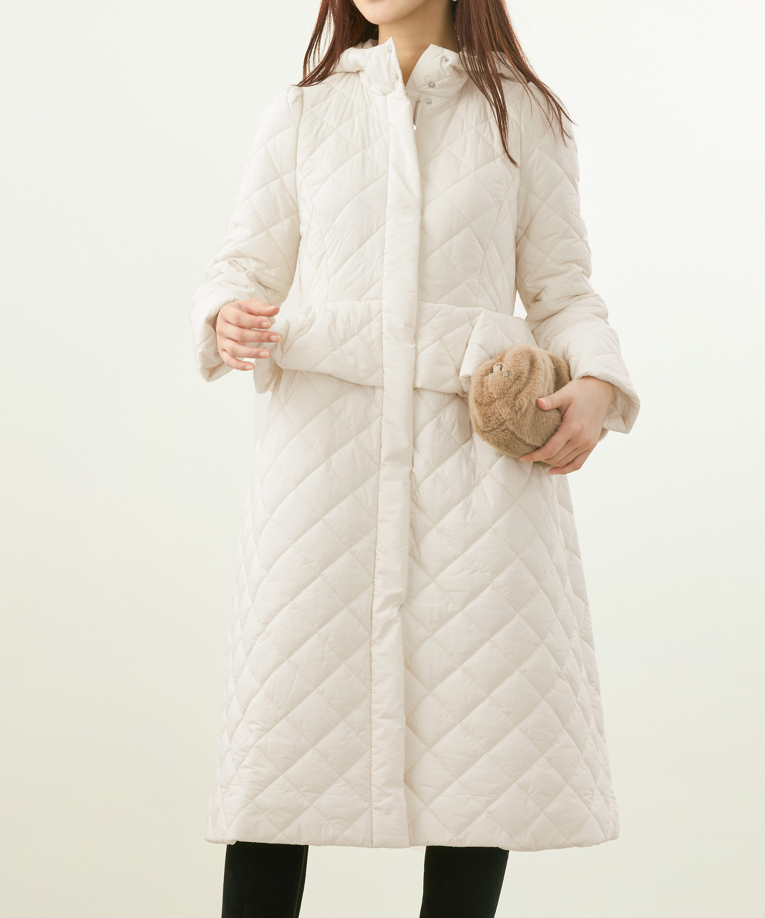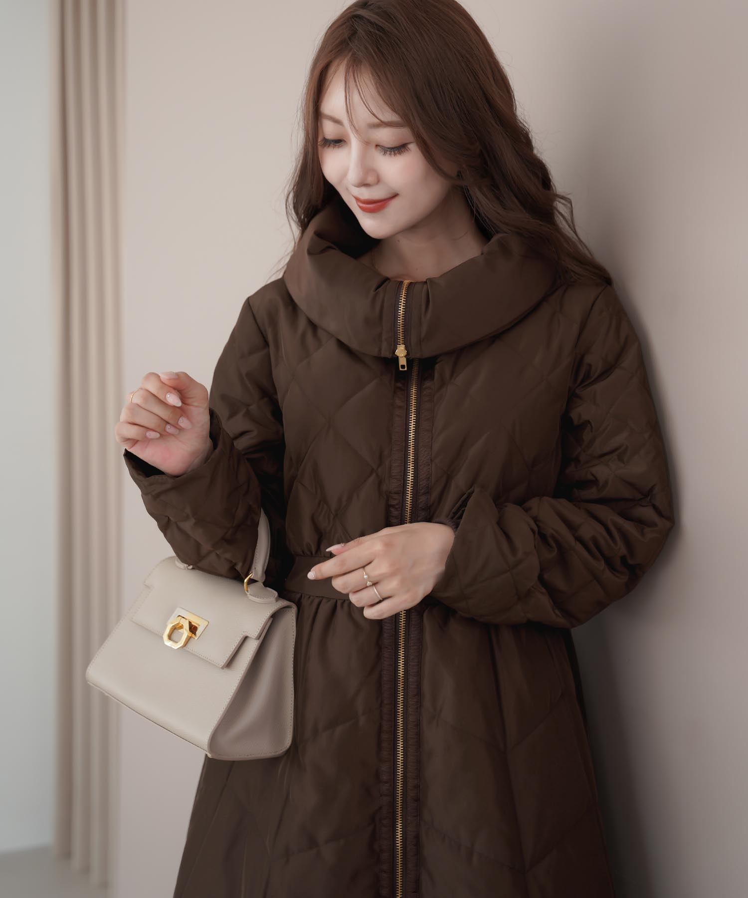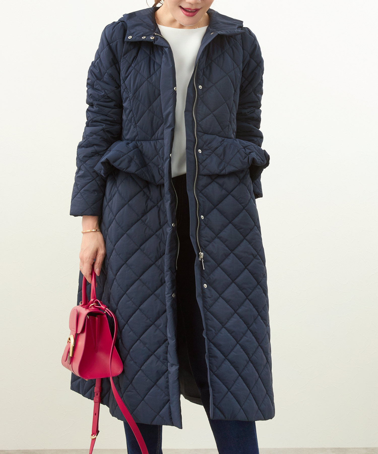 着膨れして見えやすいキルティングコートをフィットアンドフレアシルエットですっきり見せ。ドレスのようなシルエットでコートスタイルを女性らしく仕上げてくれます。フェザー入りダウンで保温性に優れ真冬のオシャレをコートが牽引。