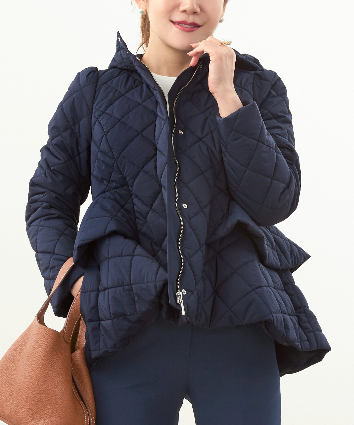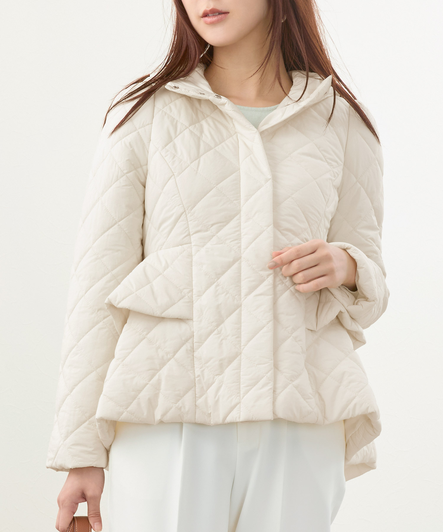 ペプラムシルエットが大人可愛いファッショナブルなキルティングアウター。マットな光沢感が大人っぽくデイリーに使いたくなる一枚です。もちろん防風・防寒対策もバッチリで、首元のスナップをしっかり上まで留めることで冷気が入るのを防ぎ保温効果を発揮してくれます。