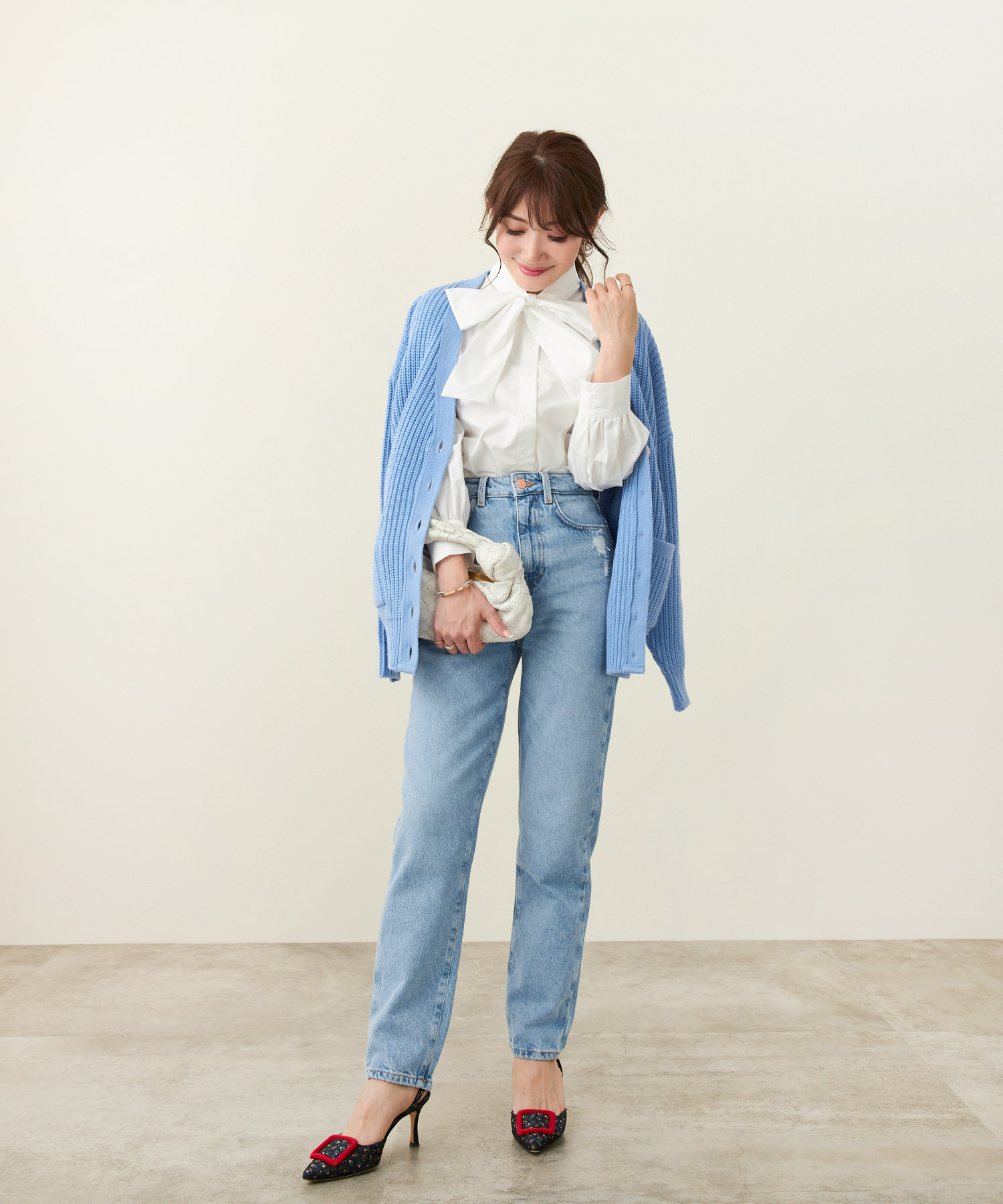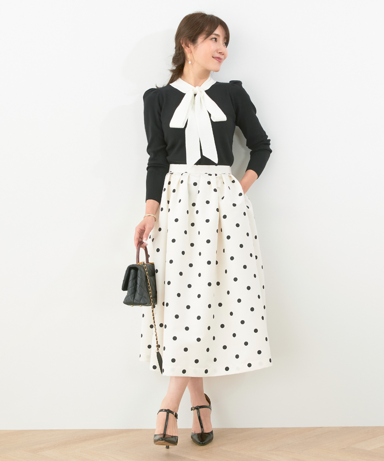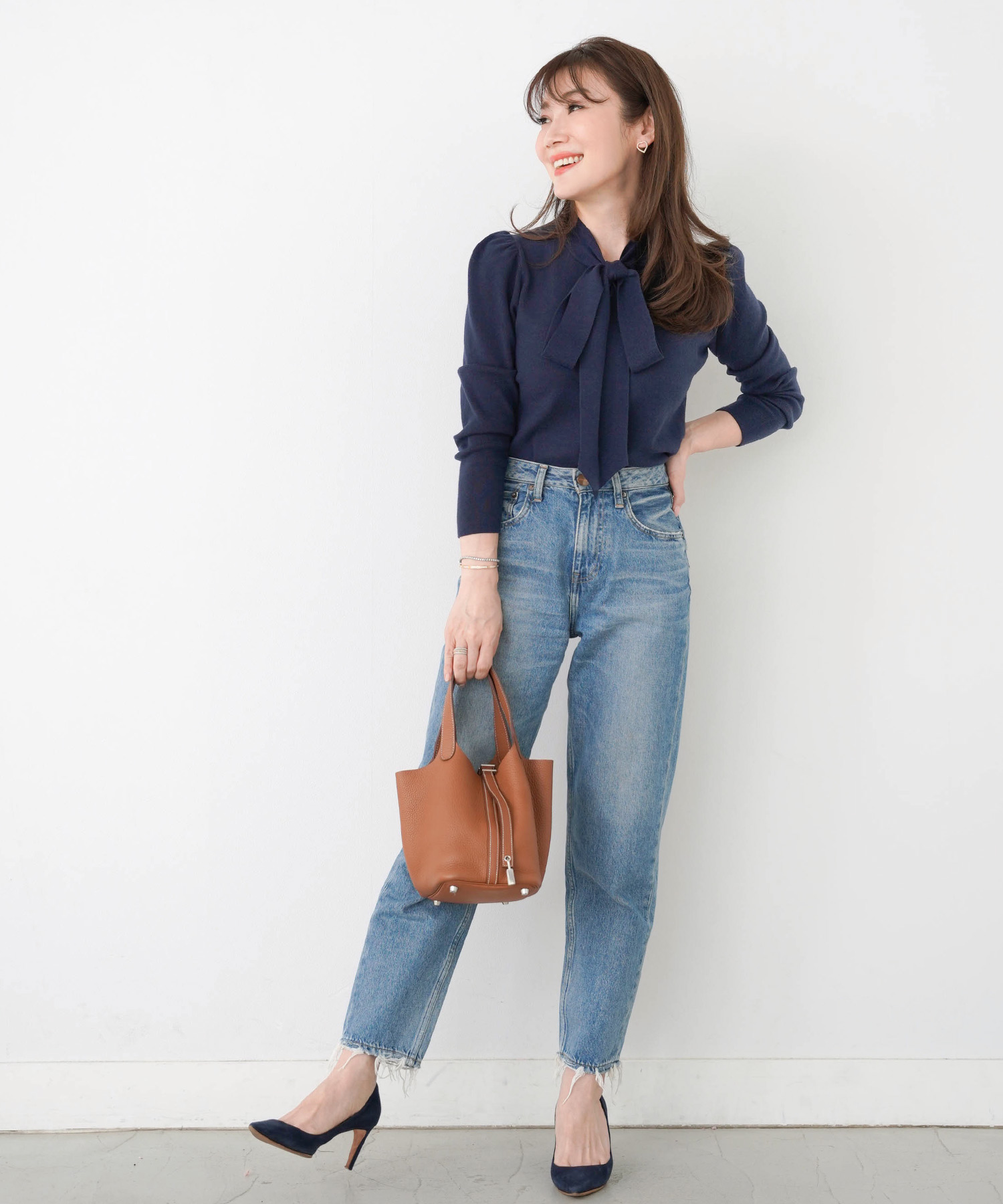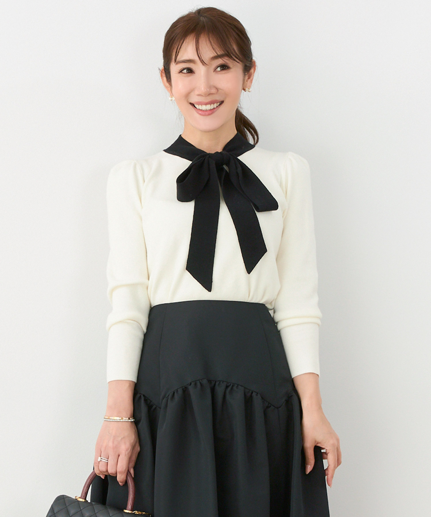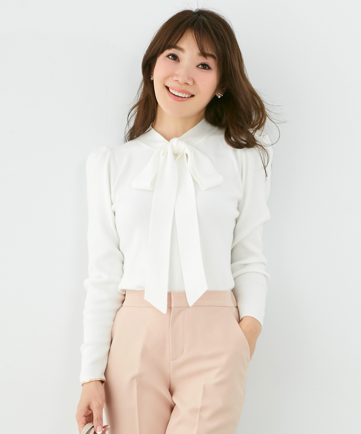 ニットもボウタイ付きなら新鮮な表情に。コートの下に着ても華やかに仕上がります。色展開が豊富なので色違いで揃えてもオッケー!