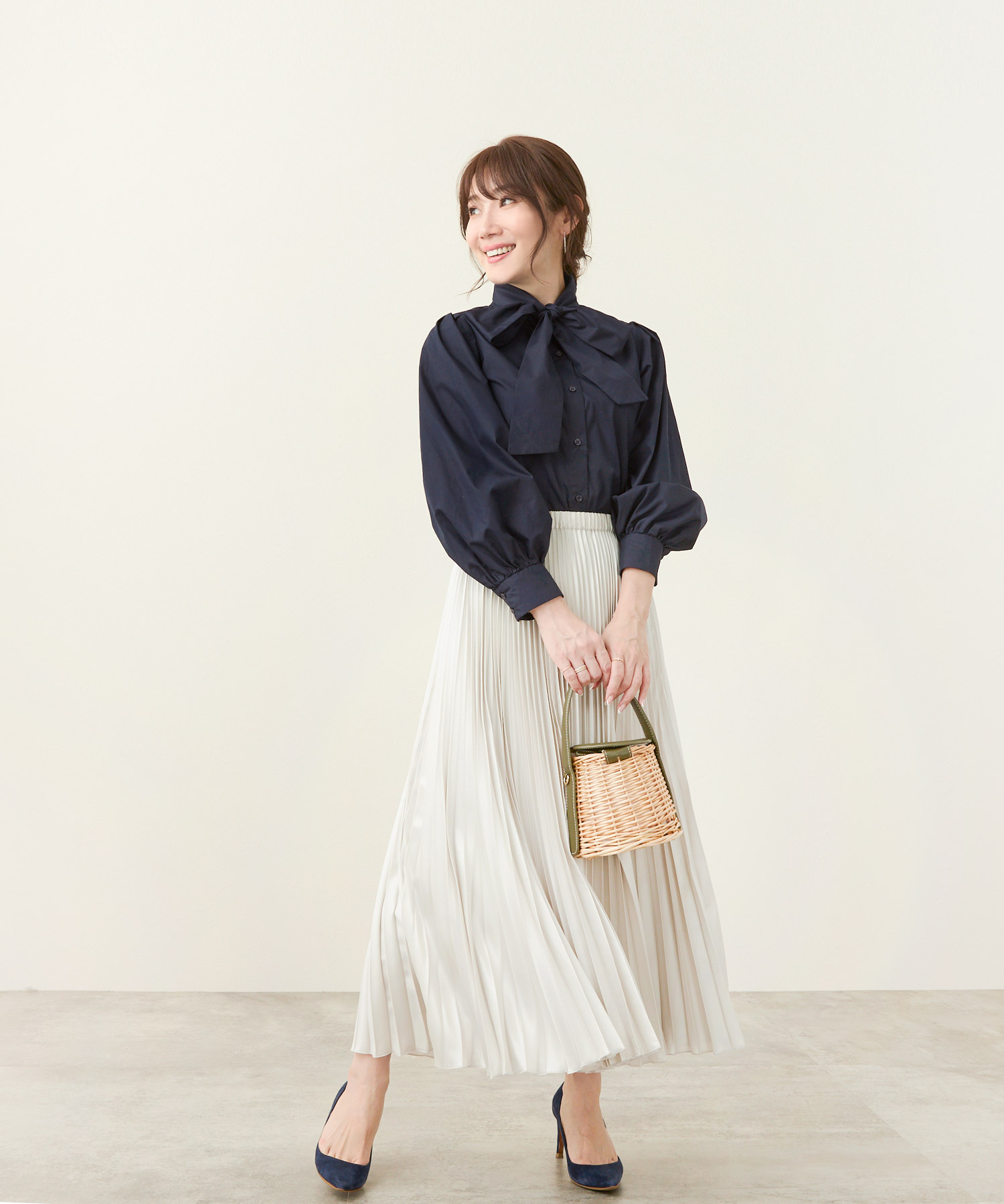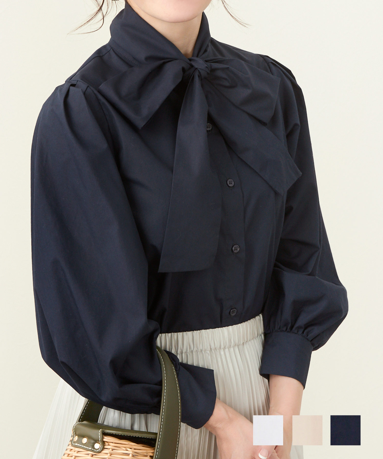 昨年からじわじわ人気を集めているボウタイブラウス。カーディガンやジャケットのインナー代わりとしてこれからの季節に重宝しそう。リボンは取り外すことができ、シンプルなスタンドカラーブラウスとして活躍してくれる2way。