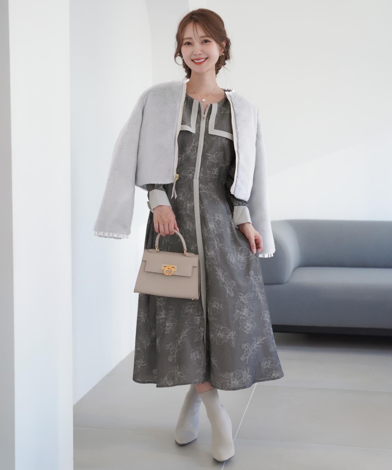 シックな花柄ワンピースにベロアのボウタイを加えることでよりエレガントに。ホテルでのランチや女子会にぴったりのアイテムです。