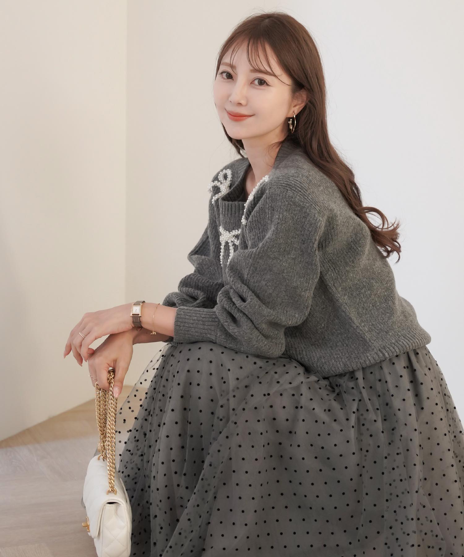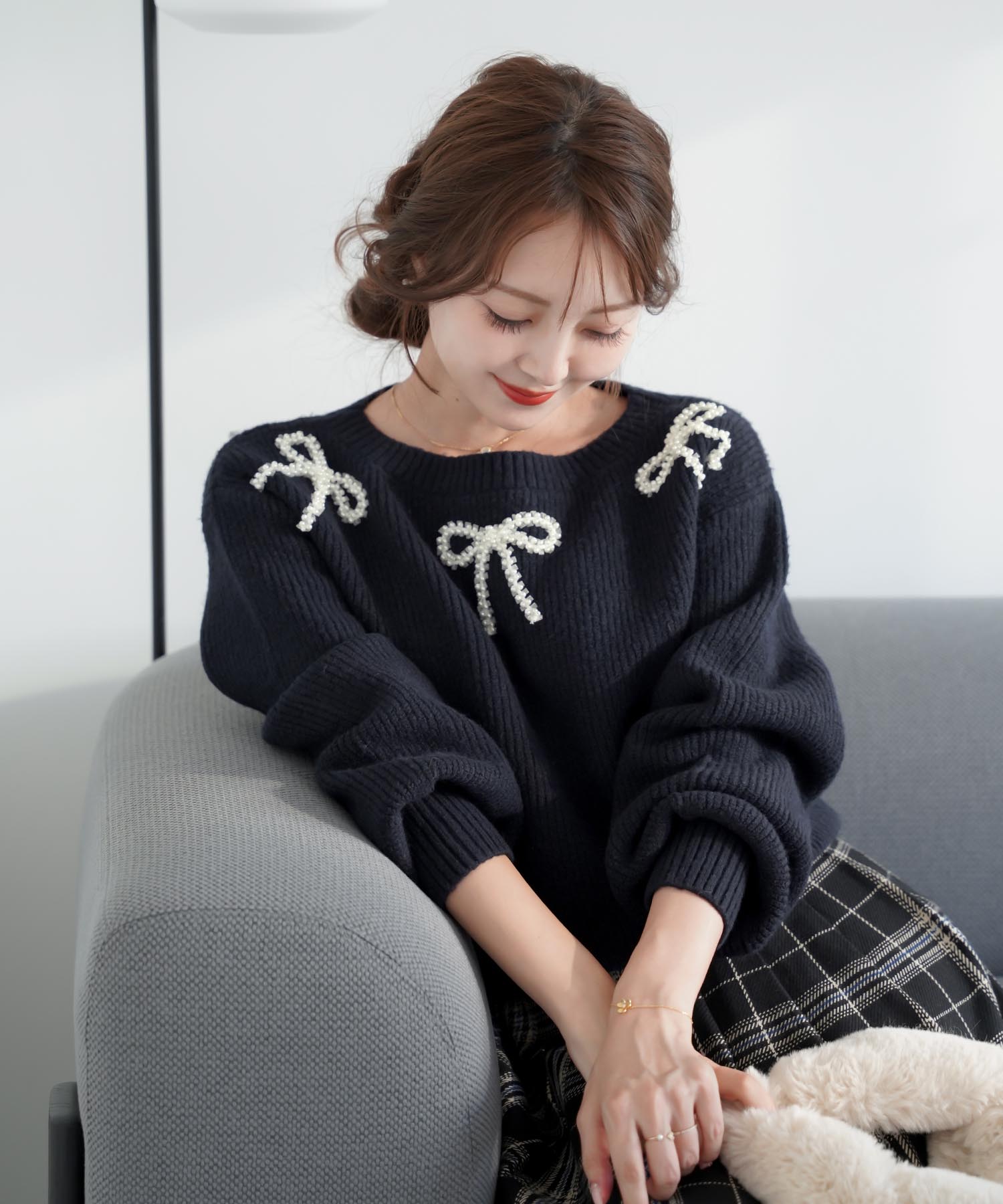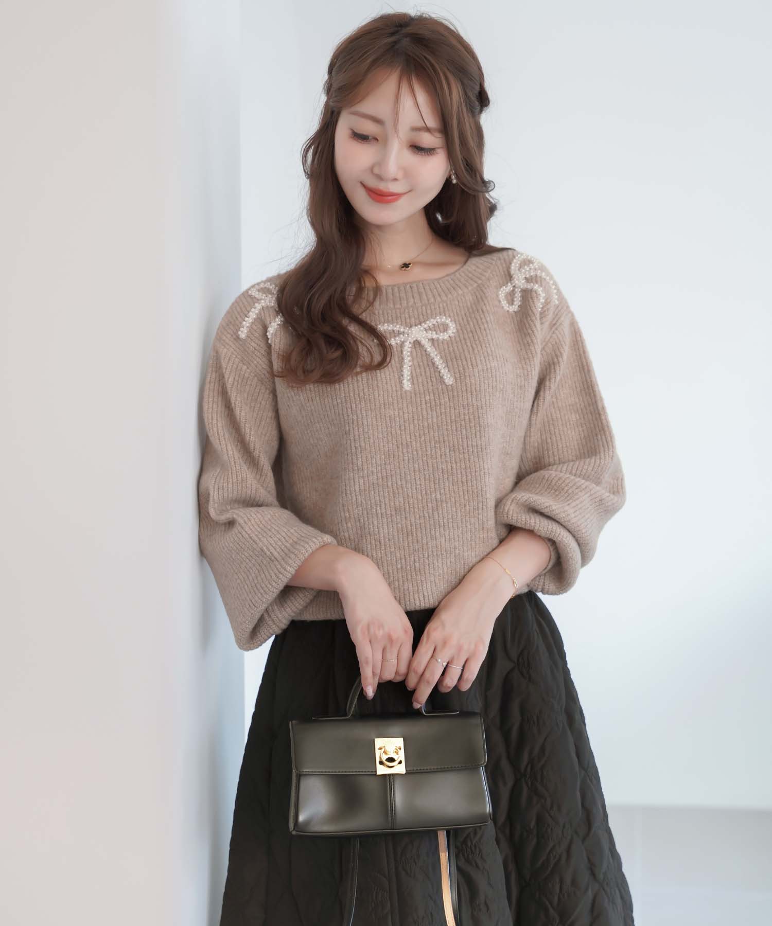 乙女心をくすぐるパールとレースで仕上げたリボンモチーフ。着映えするデザインで一辺倒になりがちなニットスタイルを一気にアップデート!