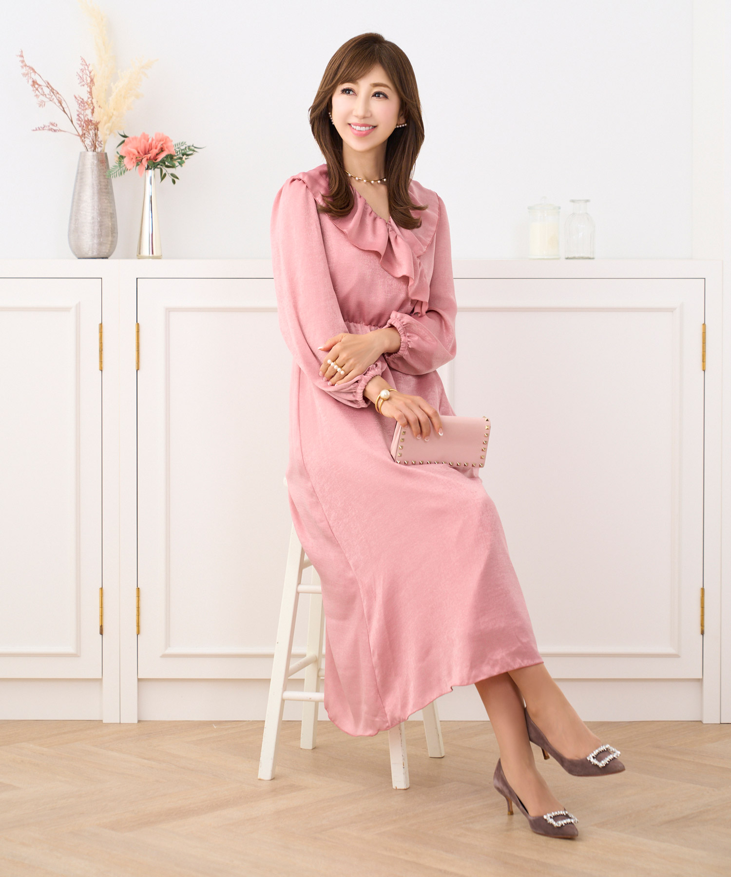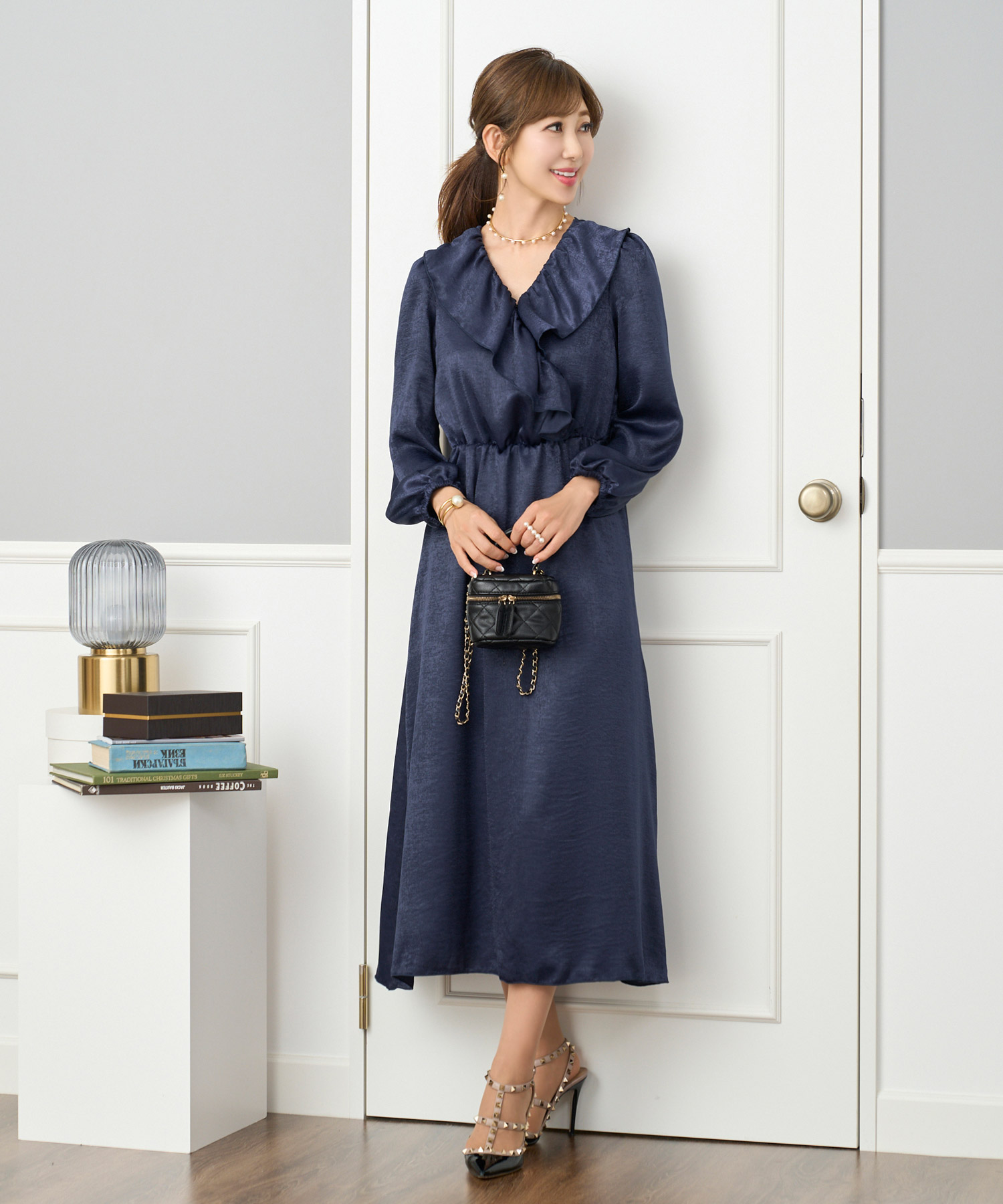秋のディナーデートには、落ち着いた色合いと夜の雰囲気にぴったりなドレッシーなデザインを選びたいところ。シックなネイビーのサテンワンピースは、艶やかでありながら、フリルカシュクールがエレガントに華を添えます。ウエストはゴム仕様で、メリハリのあるシルエットが美しく、着心地も抜群。上品さとリラクシーさを兼ね備えたこのワンピースで、特別なディナーデートを心から楽しんでください。