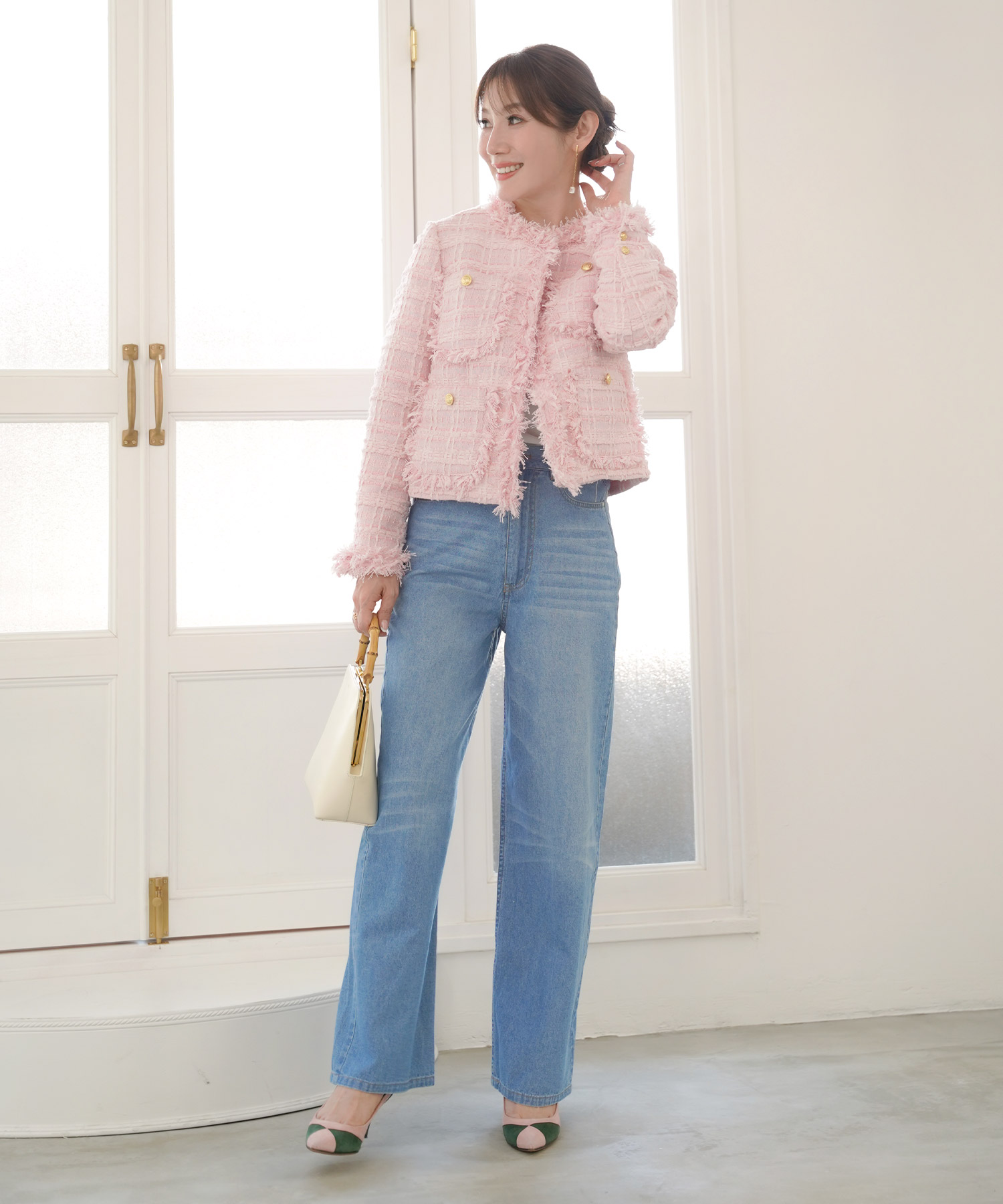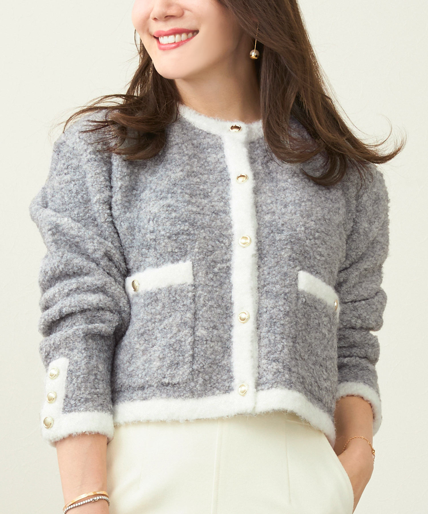 少し肌寒い季節の変わり目には、カーディガンのように軽く羽織れるツイード風ニットジャケットが大活躍。上品な編地はきちんと感を保ちながら、ニットならではの柔らかさと動きやすさで、通勤スタイルも快適に演出します。フロント部分とポケットには金ボタンをあしらい、洗練された大人の女性らしさを引き上げます。授業参観やお宮参りなど、特別な行事にも対応できるため、オフィスから行事まで幅広く着回せる万能アイテム。季節の変わり目に1枚持っておくと重宝すること間違いなしです。