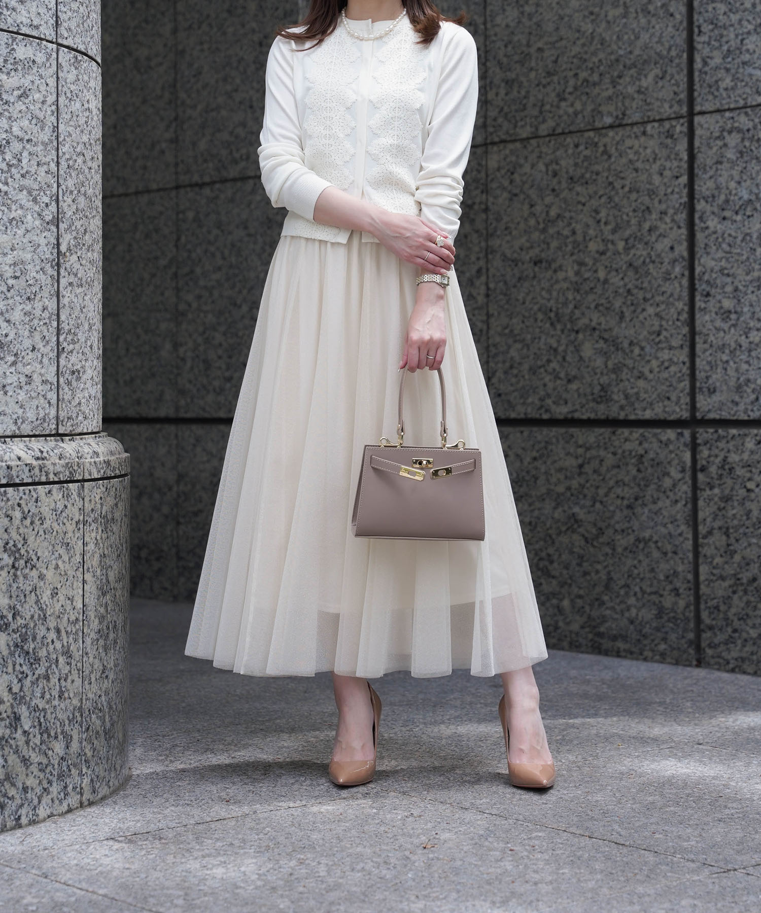 クラシックコンサートの装いには、シンプルさの中に少し華やかさをプラスしたいもの。ダブルフリル付きニットカーディガンは、ソフトな触感のチュールとニットのフリルが顔周りを明るく彩り、上品な印象を与えます。緩やかなVネックが鎖骨を美しく引き立て、フリルのボリューム感とは対照的に首元をすっきりと見せてくれます。落ち着いたベージュカラーで甘さを控えめにし、ホワイトスカートとのナチュラルなカラーコーデで、洗練された大人のスタイルが完成します。この華やかなカーディガンで、優雅なコンサートのひとときを楽しみましょう。