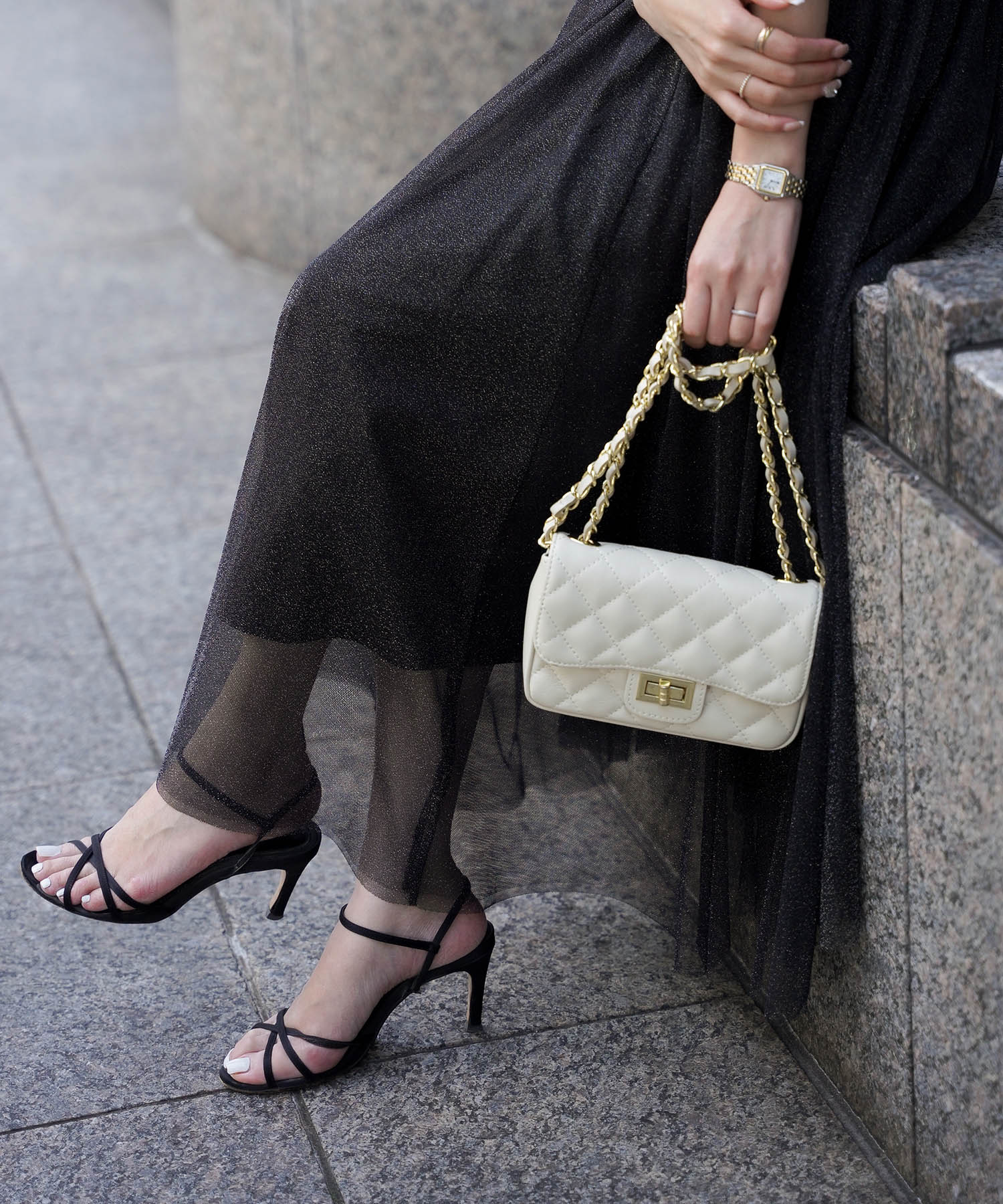 秋冬トレンドの「バレエコア」から、ラメ入りチュールスカートをチョイス。華やかさを持ちながらも、上品な光沢と柔らかい質感を重ねたボリューム感で、大人フェミニンな印象に仕上げました。映画館内は空調で寒いことがあるので、肩掛けできるカーディガンを持参すると安心です。カラーはシックなモノトーンやニュートラル系でまとめて、甘さを抑えつつトレンド感をプラス。気温差に対応しながらも、エレガントで快適なデートスタイルを楽しみましょう!