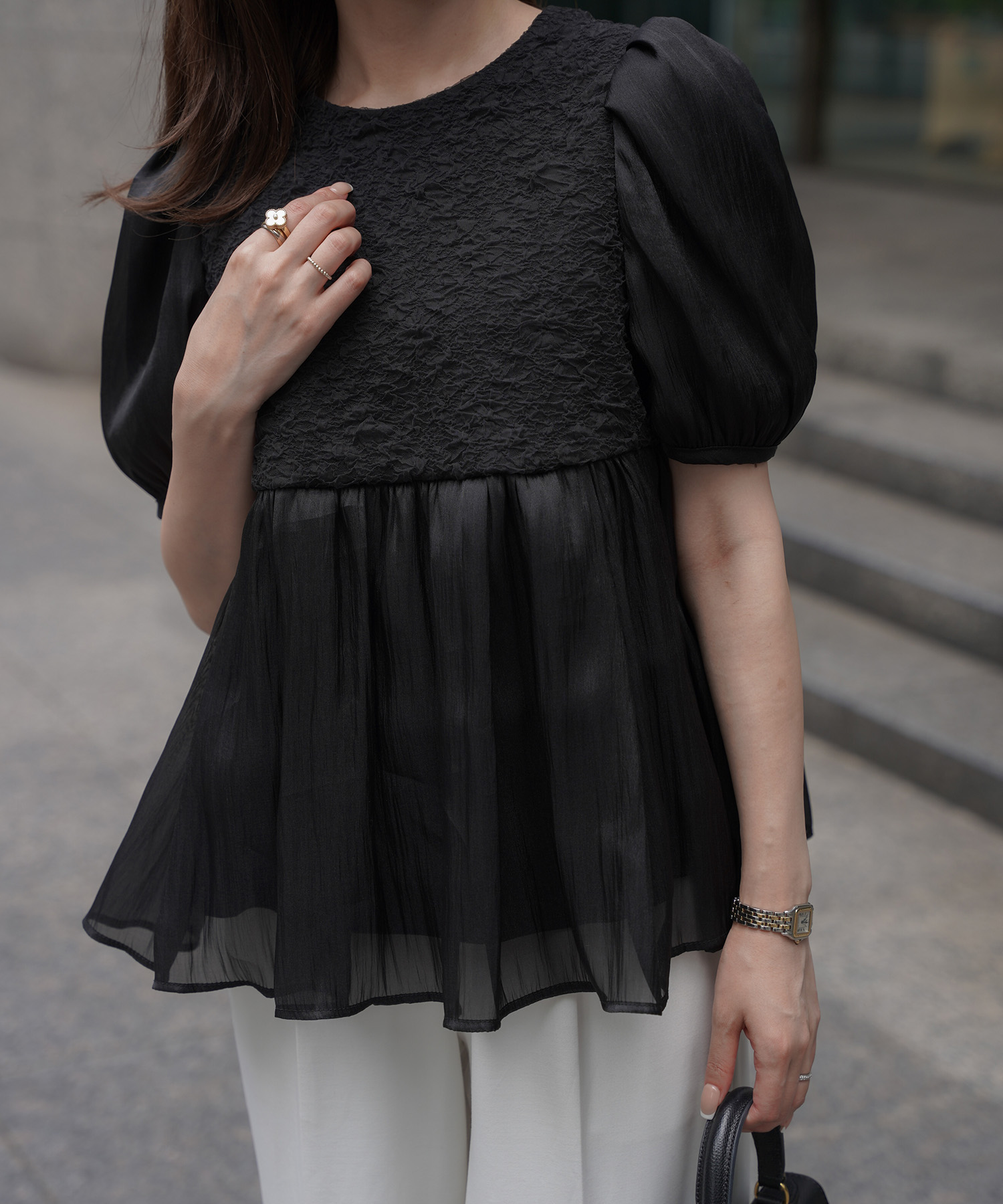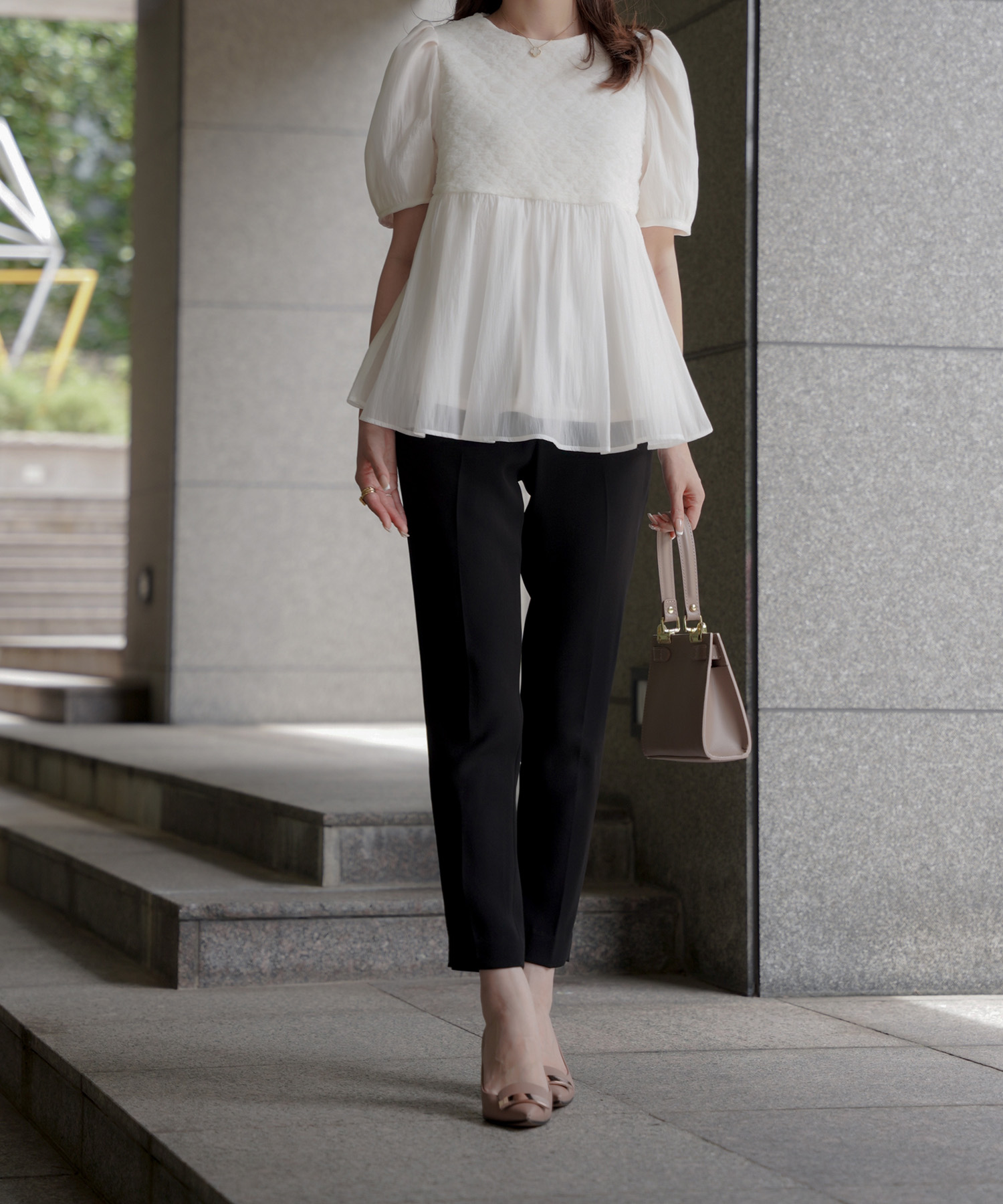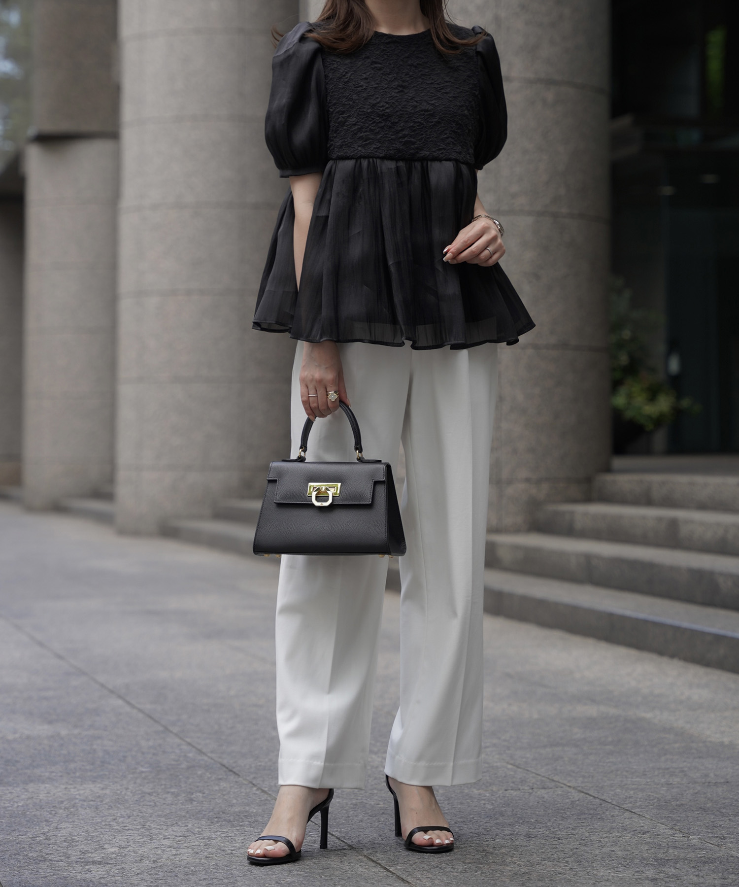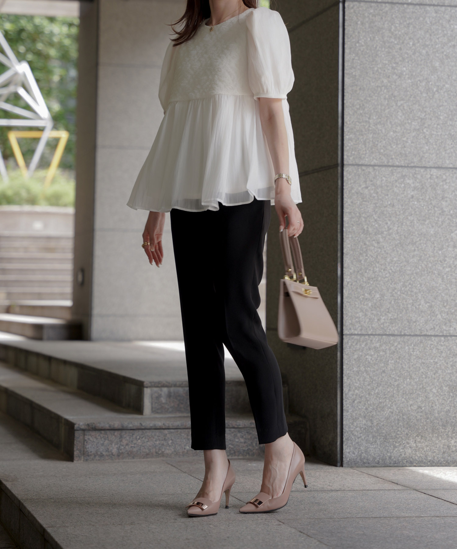 シンプルで上品な装いがベストのクライアントとのミーティングの日。暑い中でも爽やかさを感じさせるシアーなオーガンジーをベースに胸元は凹凸生地に切替え、シンプルながら地味見えしないトップスをセレクト。辛口なパンツスタイルにトップスで柔らかさを加え、上品で穏やかな装いに。胸元の切り替えにより目線が上に集まるので、スタイルアップを狙いたい低身長さんにもおすすめです。爽やかで女性らしい着こなしで、取引先からの印象がアップする、ワンランク上の着こなしを目指しましょう。