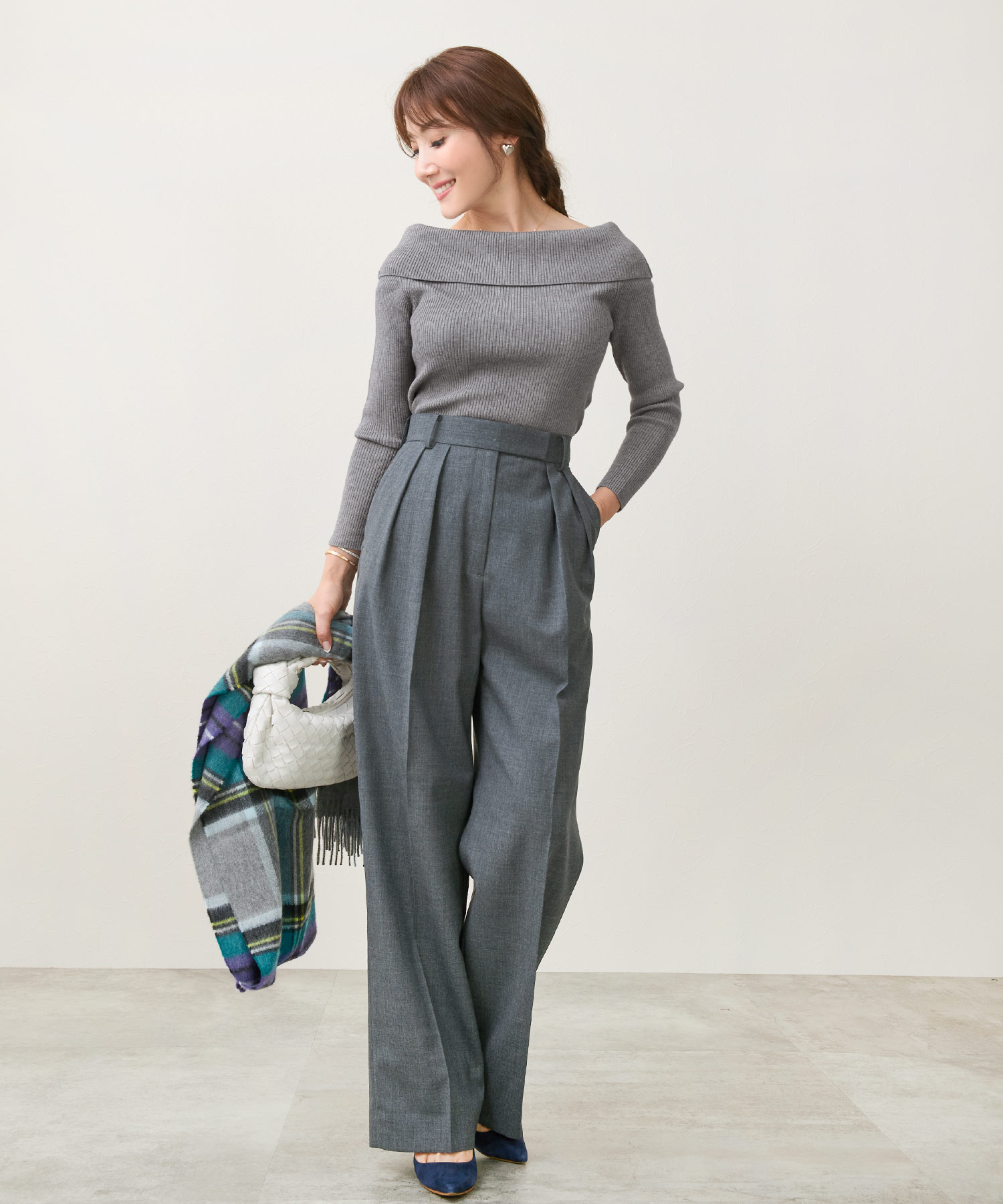 ドライブデートの日は、動きやすく実用的なパンツスタイルがおすすめです。車のドアに裾を挟む心配がなくスタイリッシュな印象を与えます。トップスには女性らしいオフショルニットを選び、さりげなく鎖骨を見せることで抜け感と華やかさを演出。2024年秋冬のトレンドカラーであるグレーを取り入れると知的で落ち着いた雰囲気を醸し出し、肌見せコーデでも大人っぽさをキープできます。