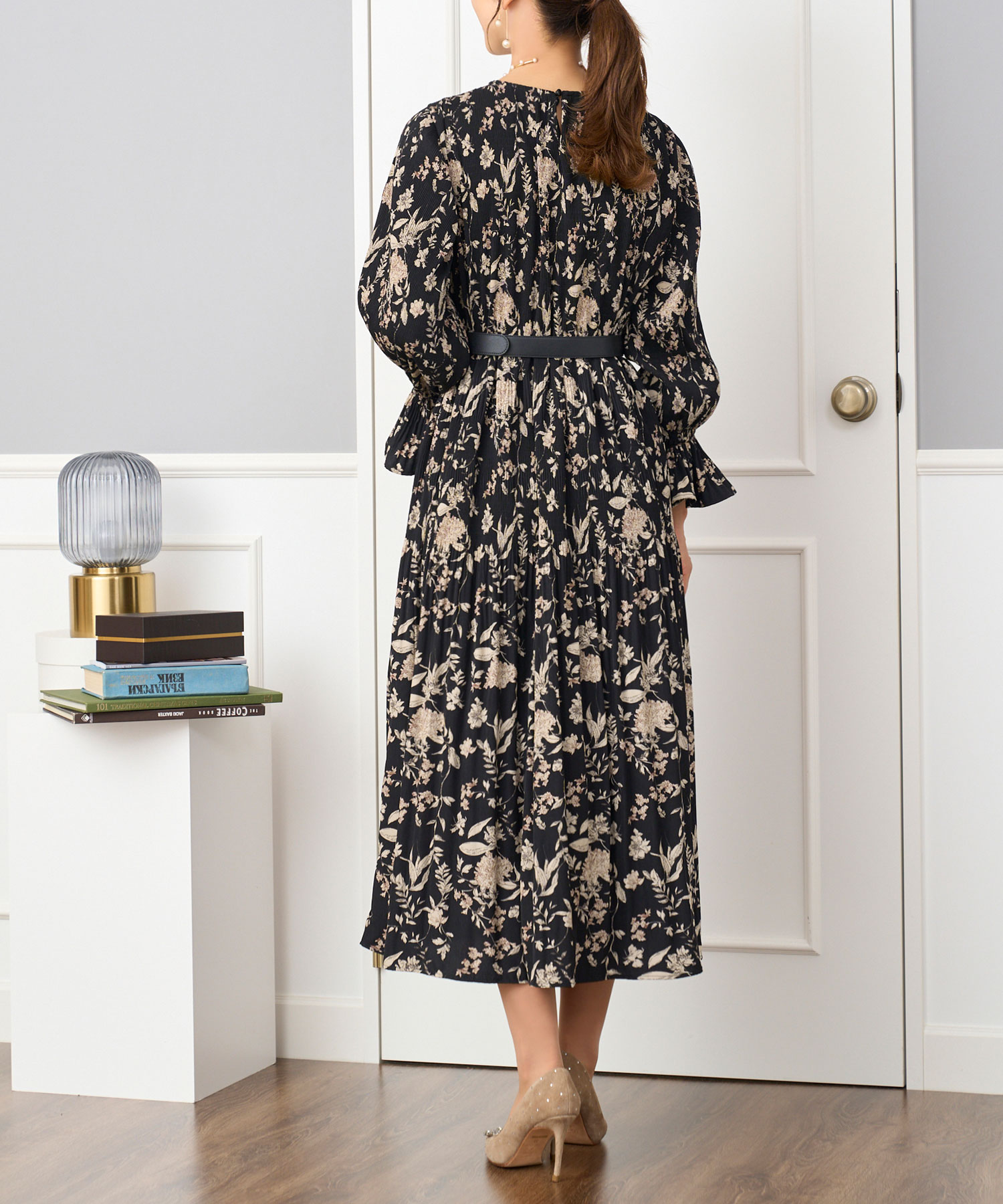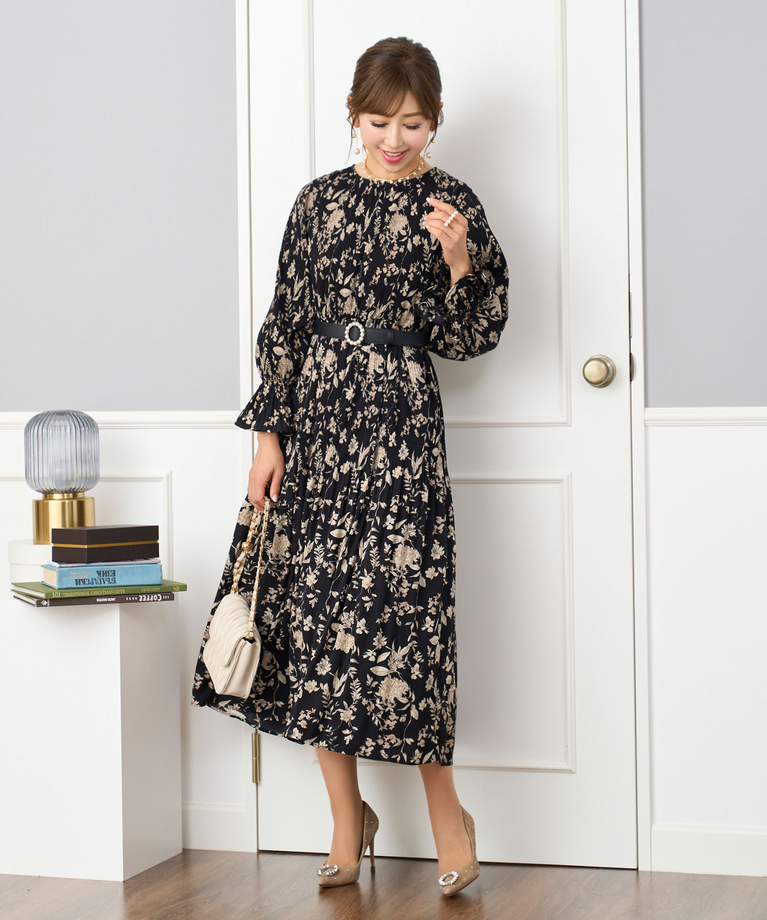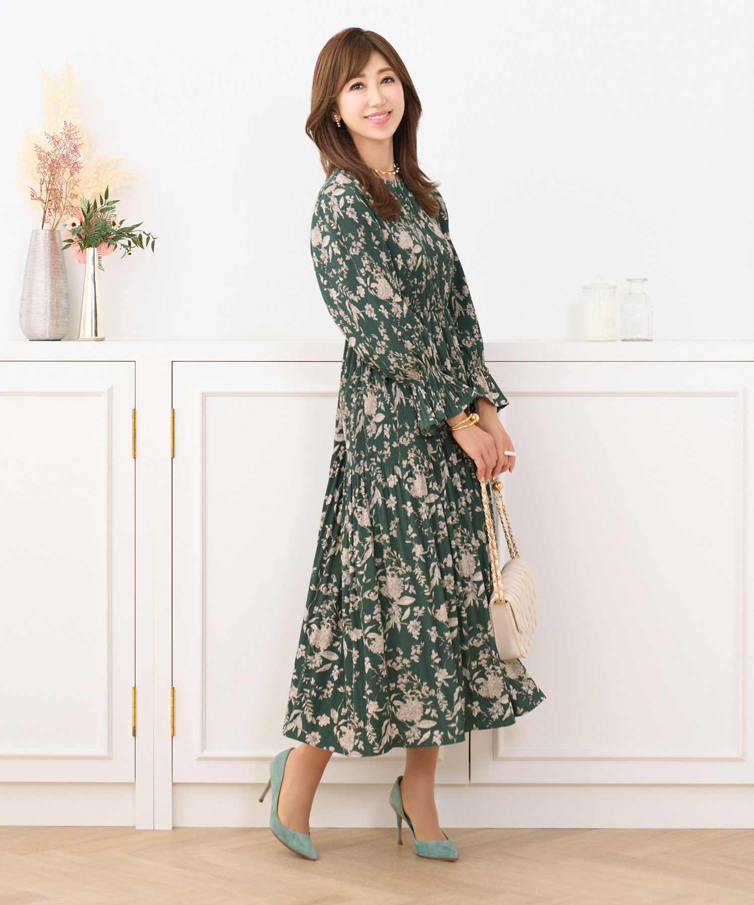 秋らしさを感じるホテルブランチには、トレンド感を取り入れた優雅でリラックスした装いが最適。この秋注目のモスグリーンのワンピースは、落ち着いたベージュのフラワー柄が大人の品格を引き立てます。デシン生地の細かなプリーツが優美さをプラスし、ファーベストやティペットを合わせることで、さらにリッチな印象に。秋のトレンドカラーで、洗練されたブランチスタイルを楽しんでください。