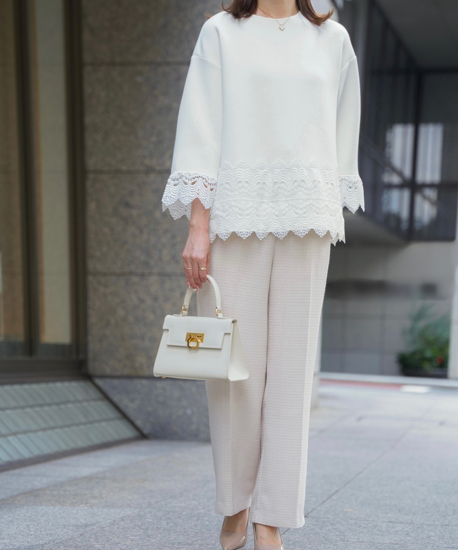9月下旬は気温が落ち着き、お宮参りには最適な時期です。そんな大切な日には、清楚でドレッシーな総レースブラウスがおすすめ。袖口はベルスリーブデザインで、手元を華やかに演出しつつ、動きやすさも兼ね備えています。レース素材は軽やかで上品な印象を与え、お子さんとの大切な記念日をより特別なものにしてくれるでしょう。スカートやワイドパンツと合わせて、全体をシックにまとめると、さらに洗練されたコーディネートに仕上がります。