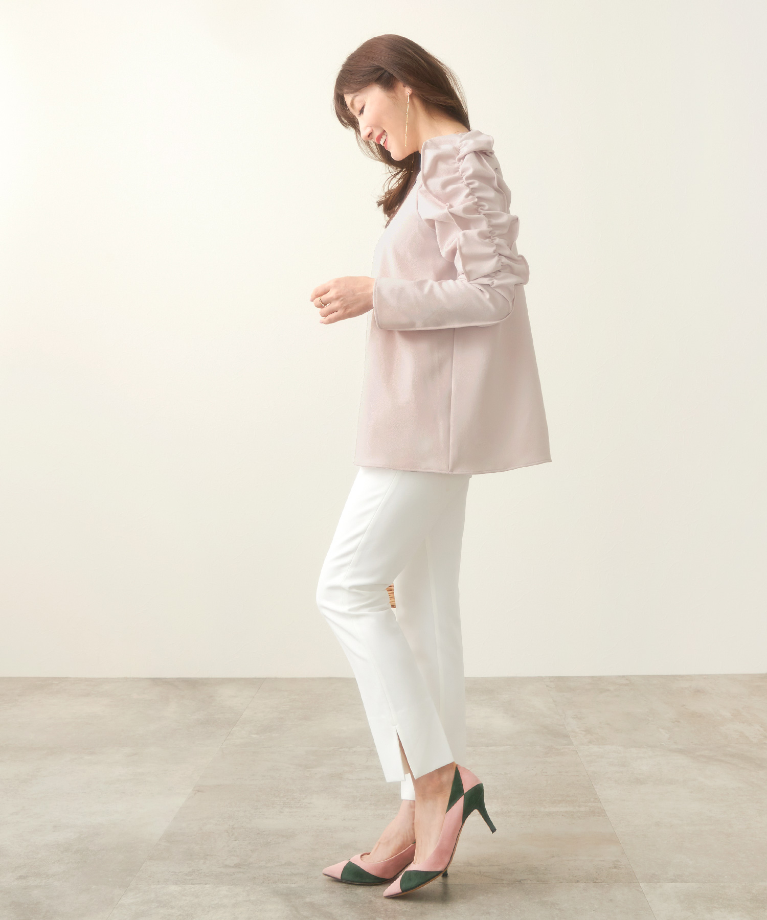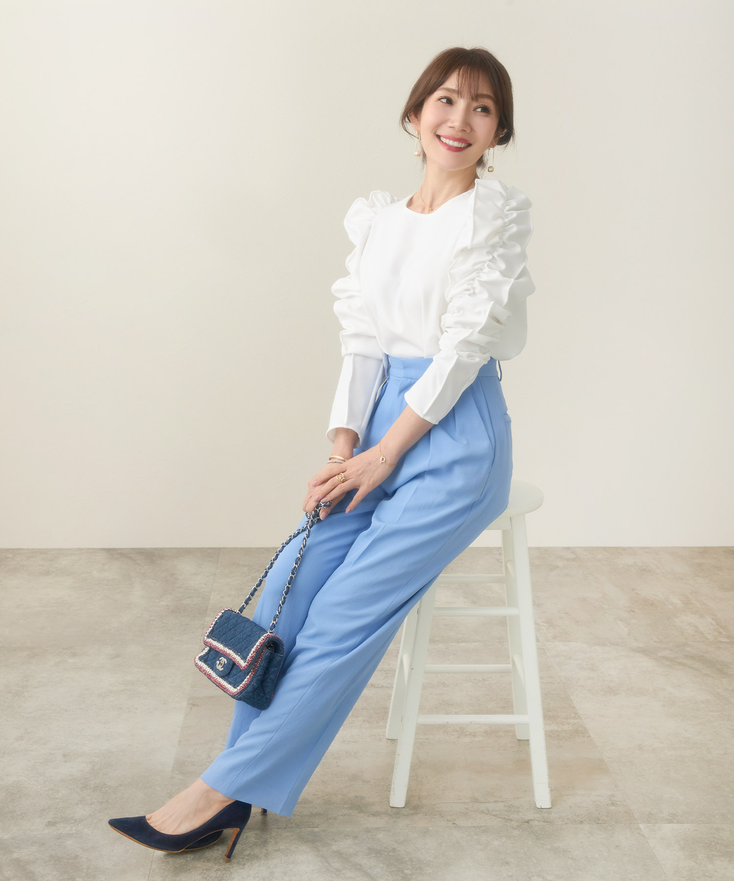 9月のドライブデートには、華やかな袖ギャザーブラウスとパンツスタイルがぴったりです。ブラウスの袖は2枚仕立てで立体感があり、ギャザーがアクセントとなって華やかさをプラスしています。クルーネックのシンプルなデザインながら、袖のデザインが印象的です。さらりとしたパンツとの組み合わせで、カジュアルながらも大人の落ち着いた雰囲気を演出。快適さとおしゃれさを両立したコーディネートが楽しめます。