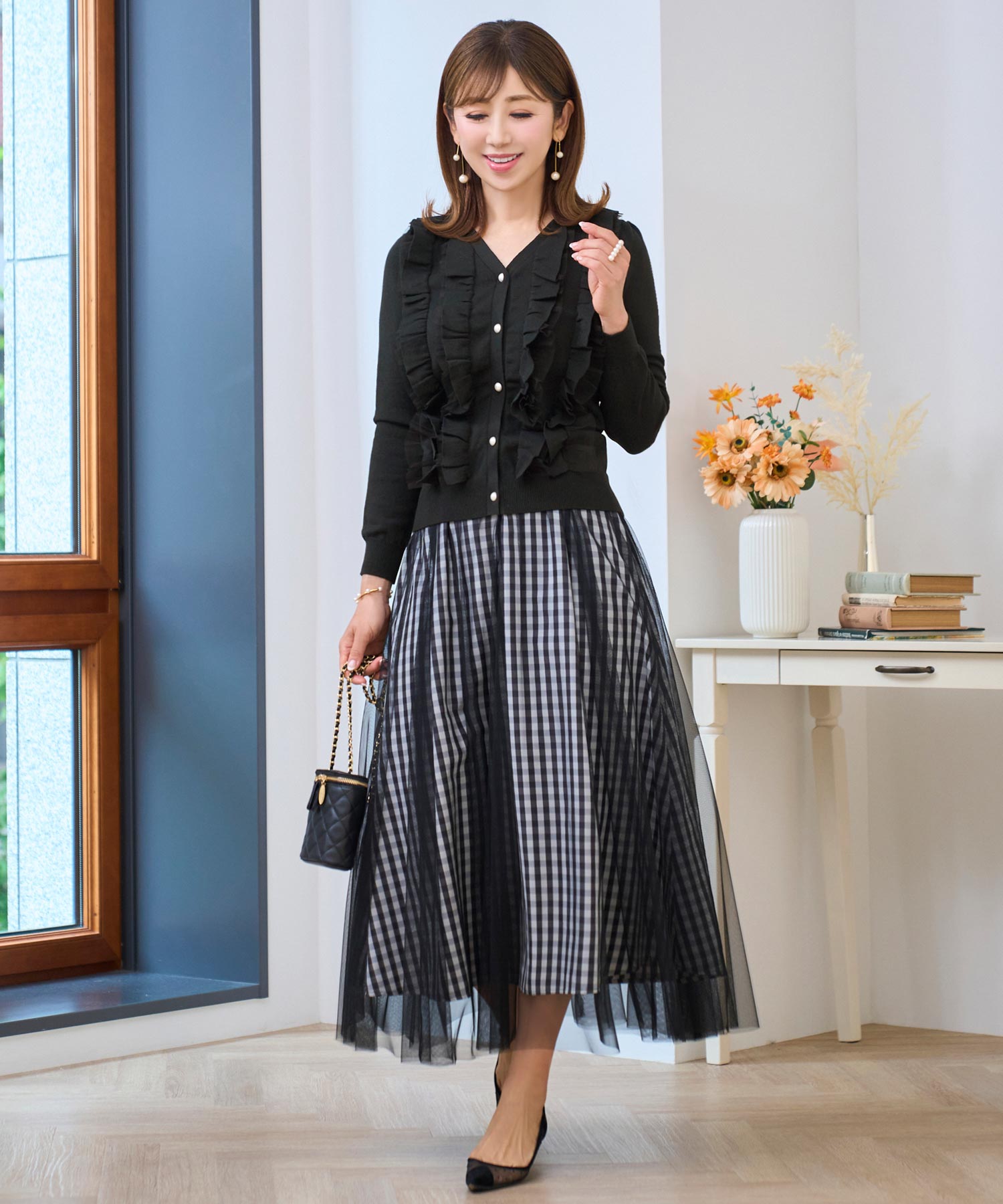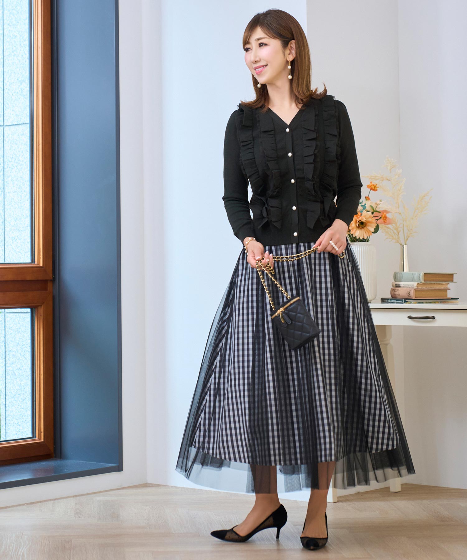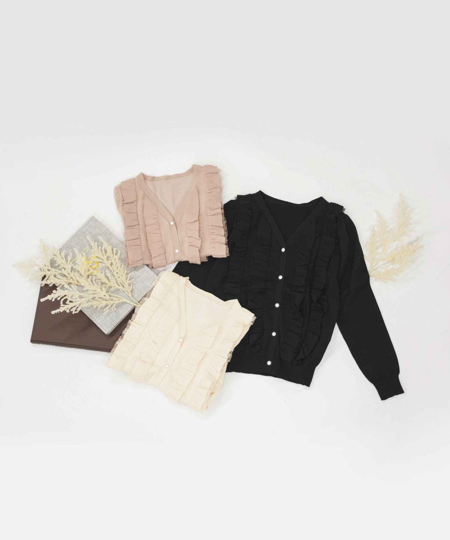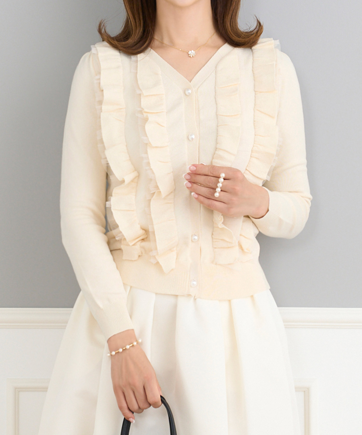 チュール挟み込み ダブルフリル ニット カーディガン 長袖(Prima Scherrer)¥11,000(税込)