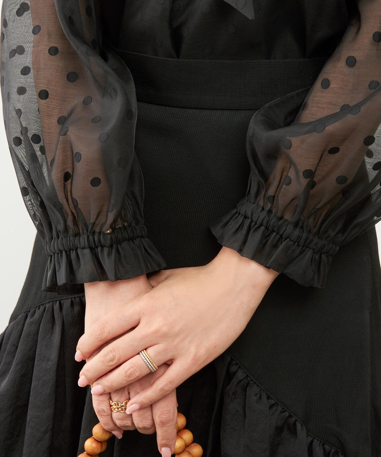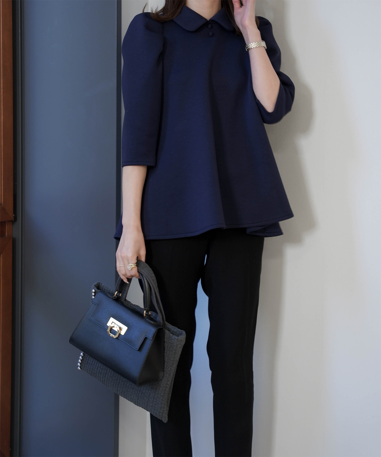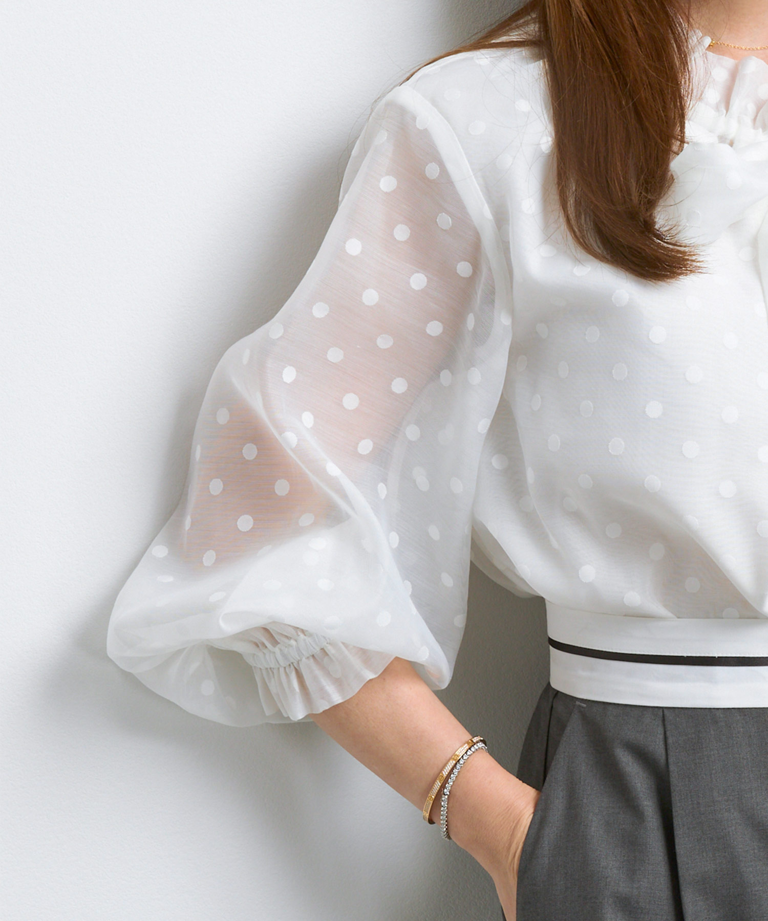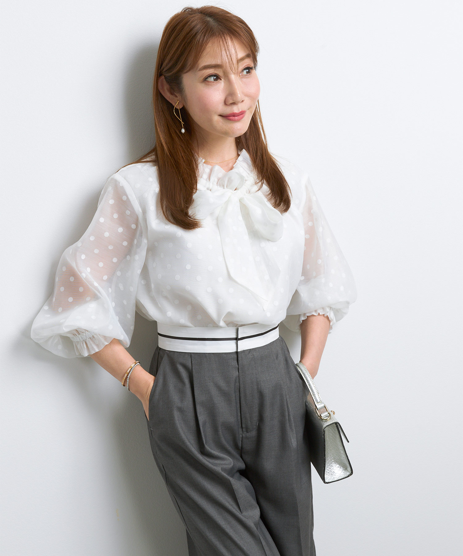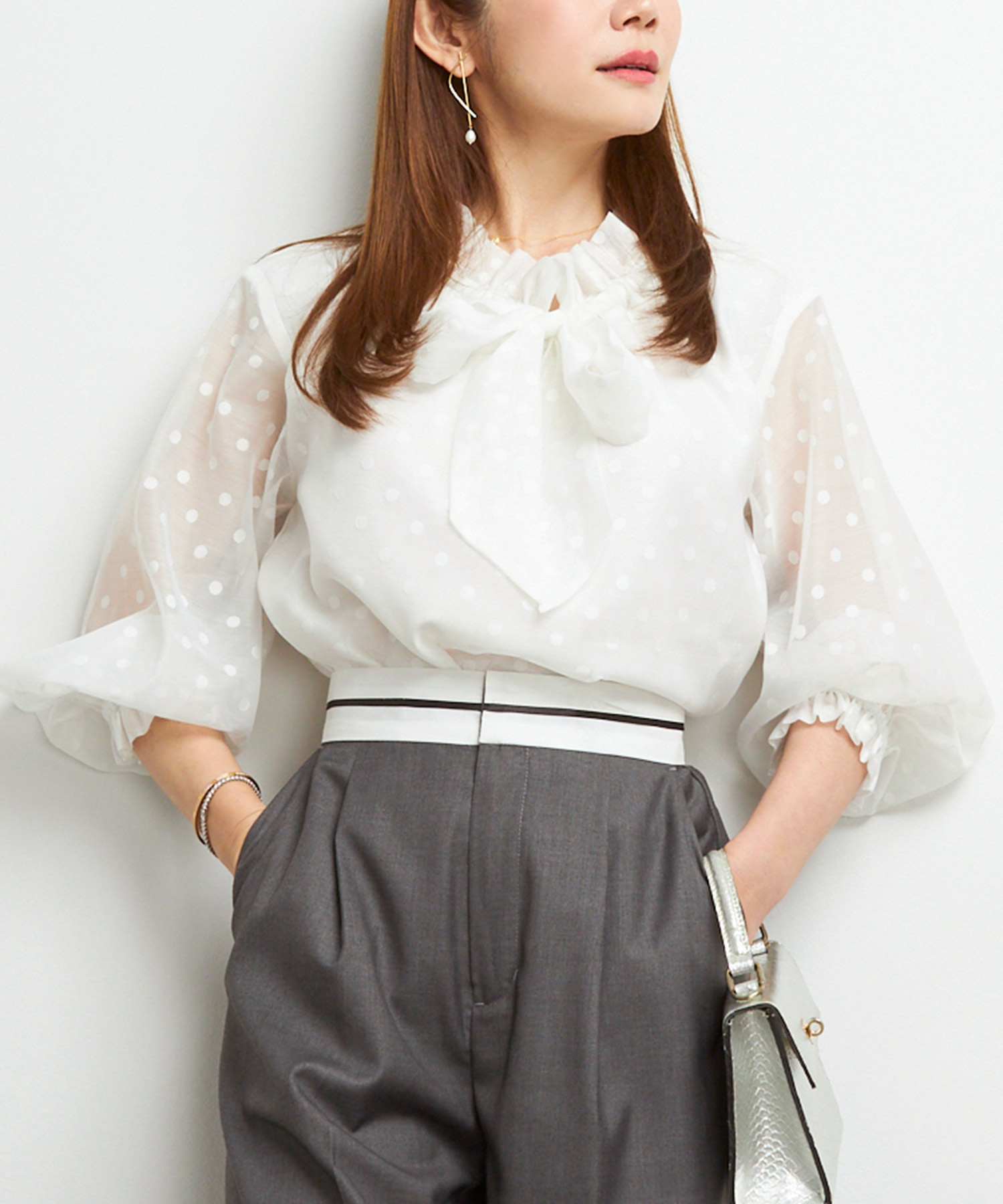 ロールカラー 袖ドロスト ブラウス|きちんと感と華やかさを両立
