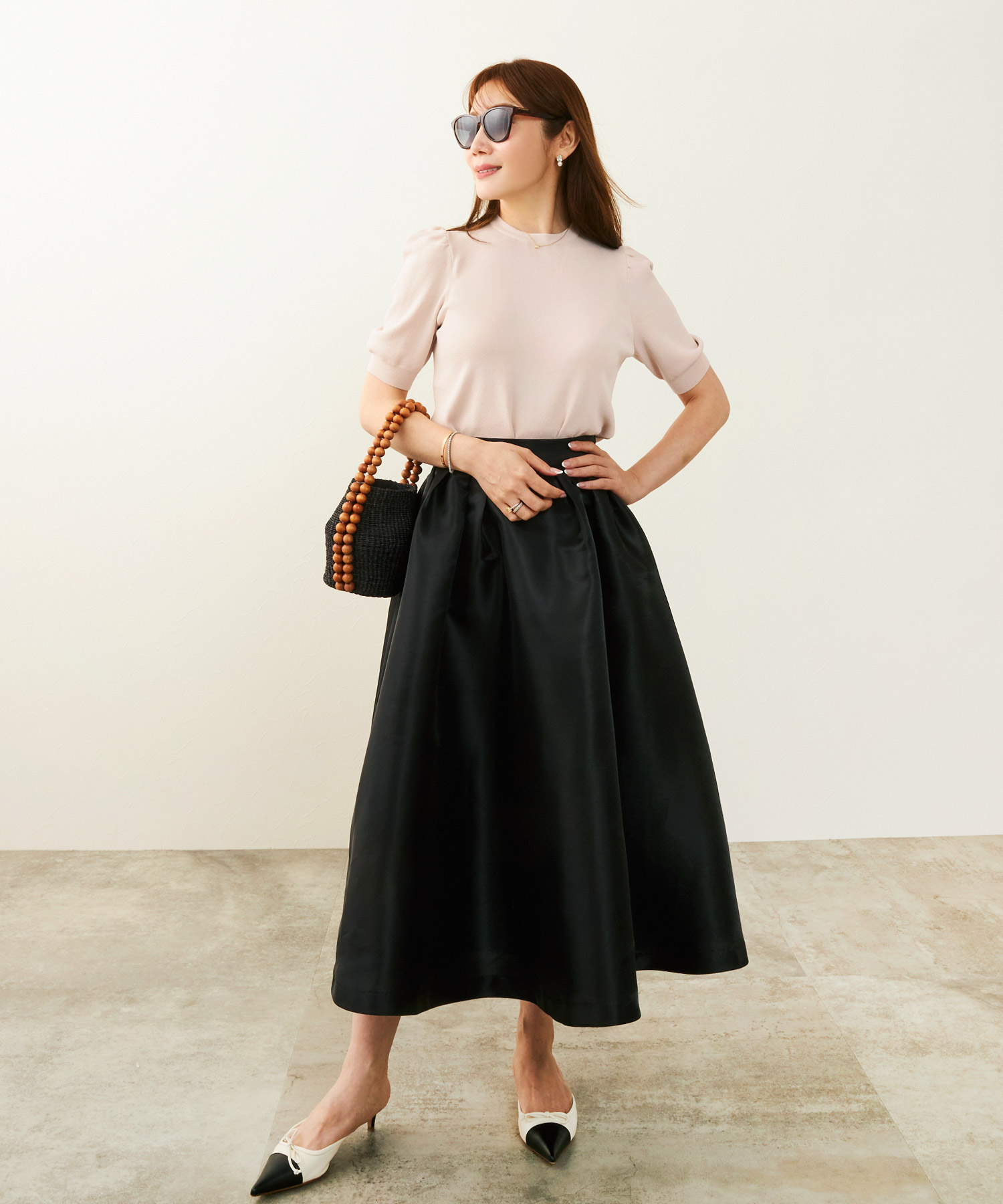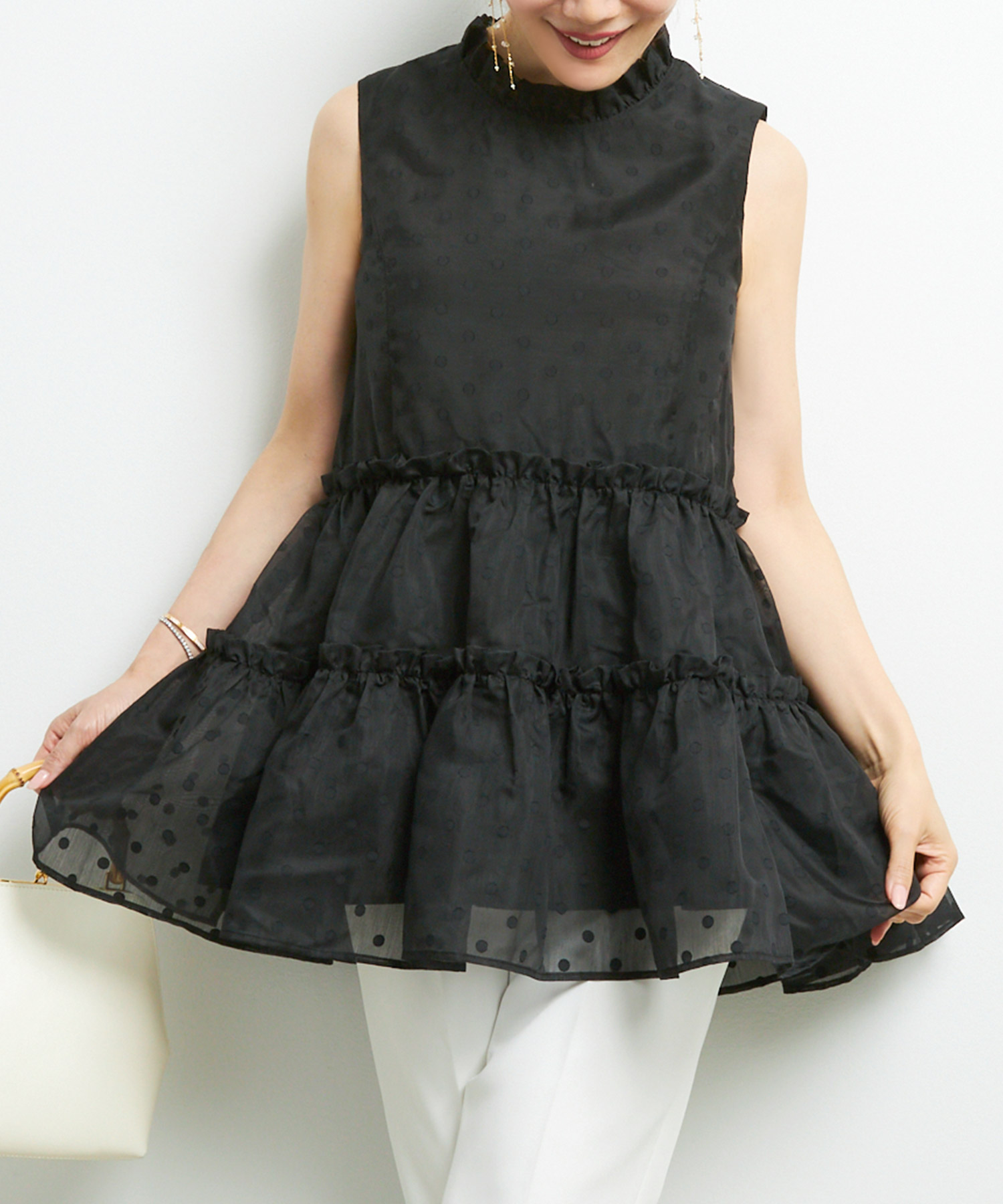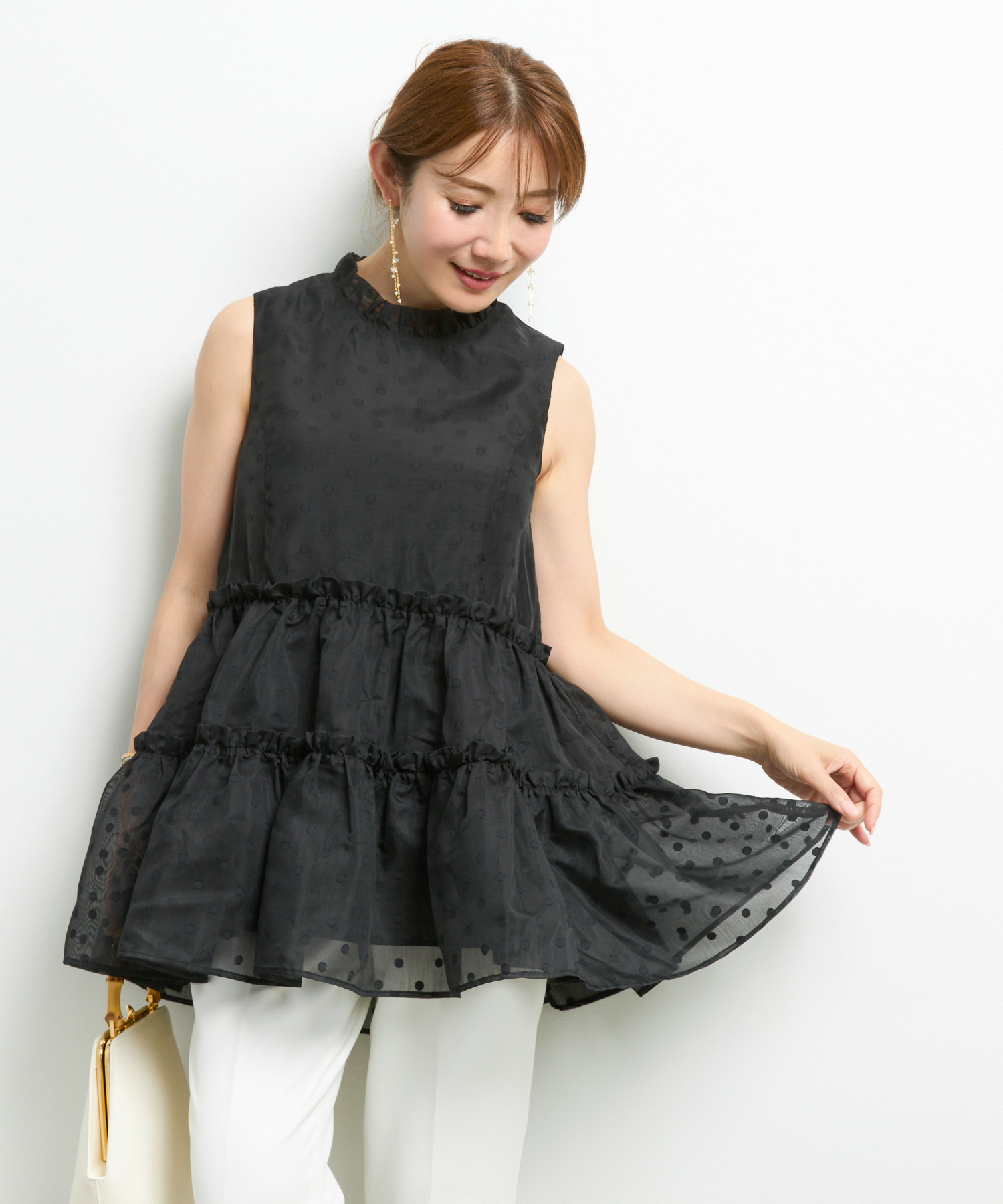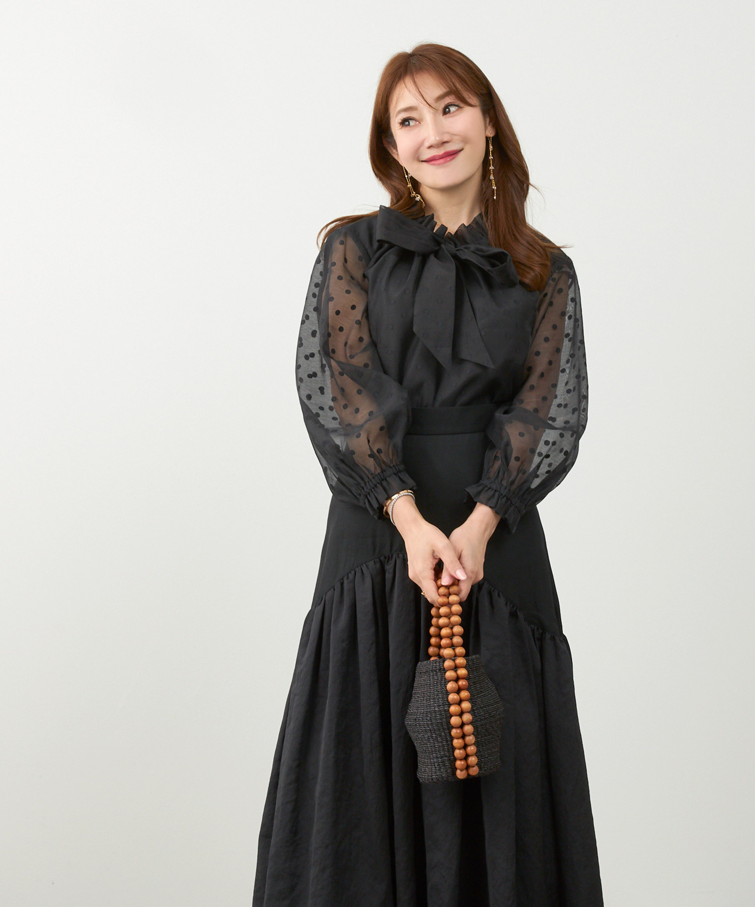 観劇など落ち着いたシーンには、ティアード ワンピースを。微光沢のあるサテン生地が華やかさを添え、落ち感のあるティアードデザインで上品にまとまります。動くたび揺れるシルエットがエレガントで、観劇後のディナーにも映える一枚です。
