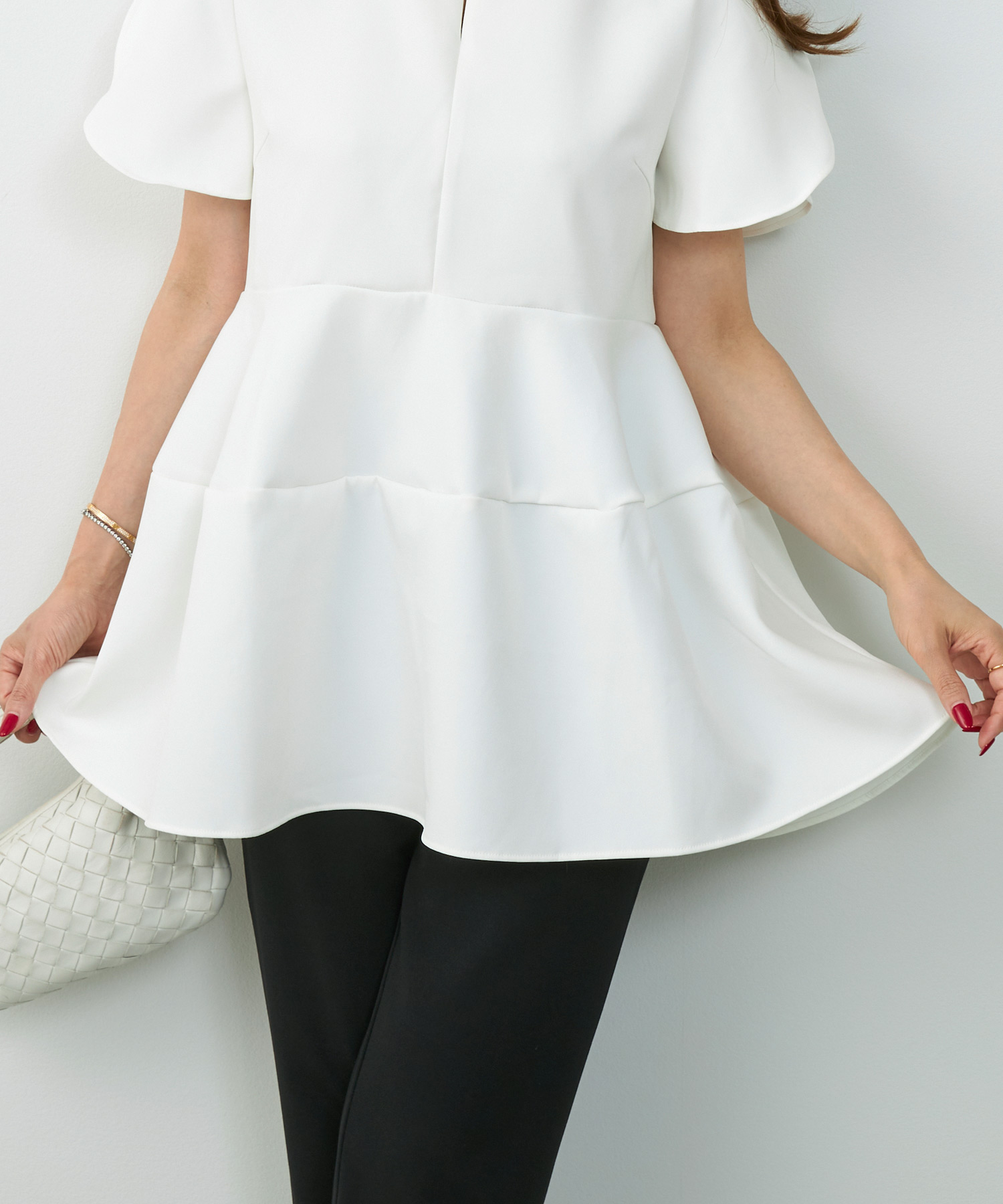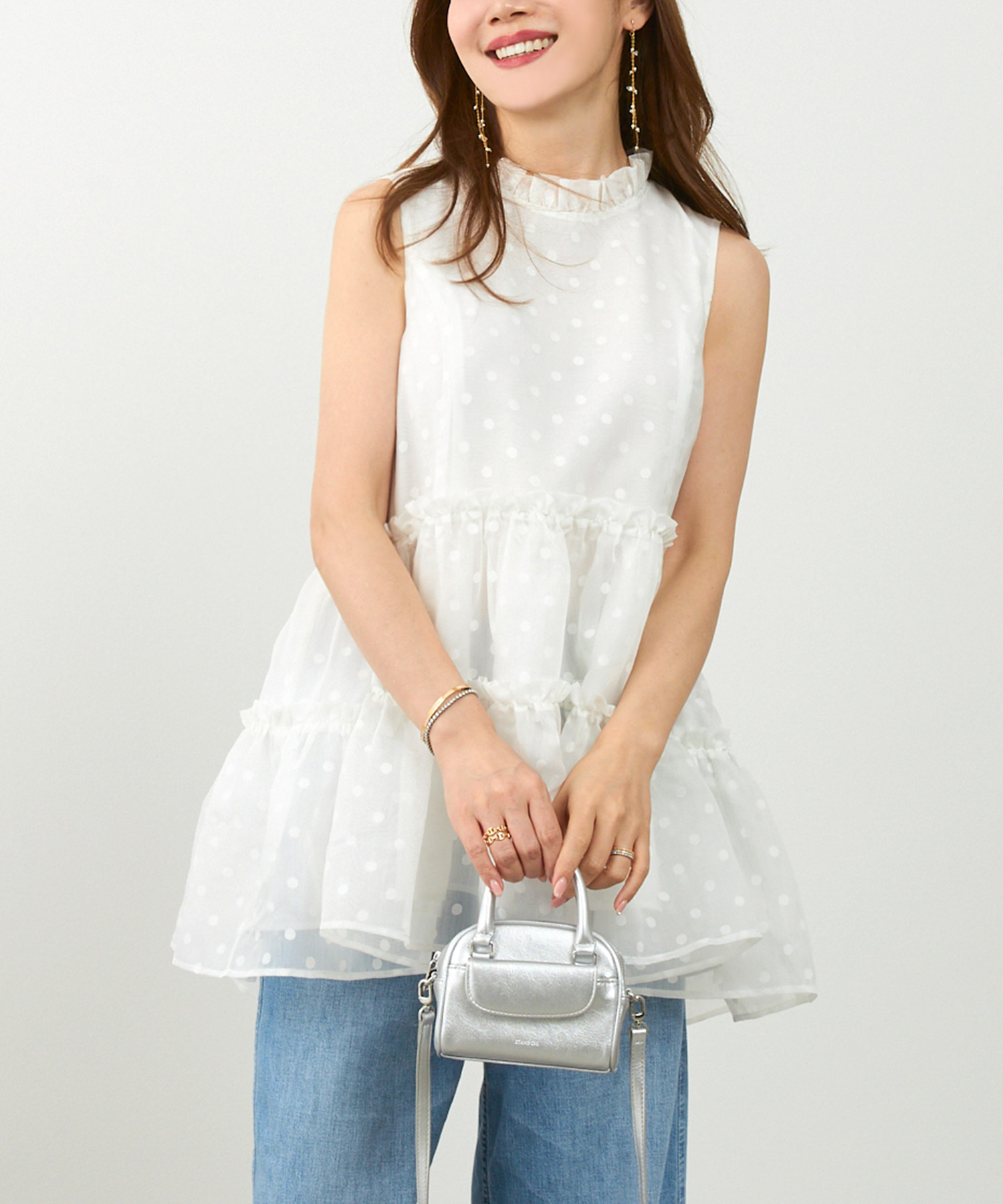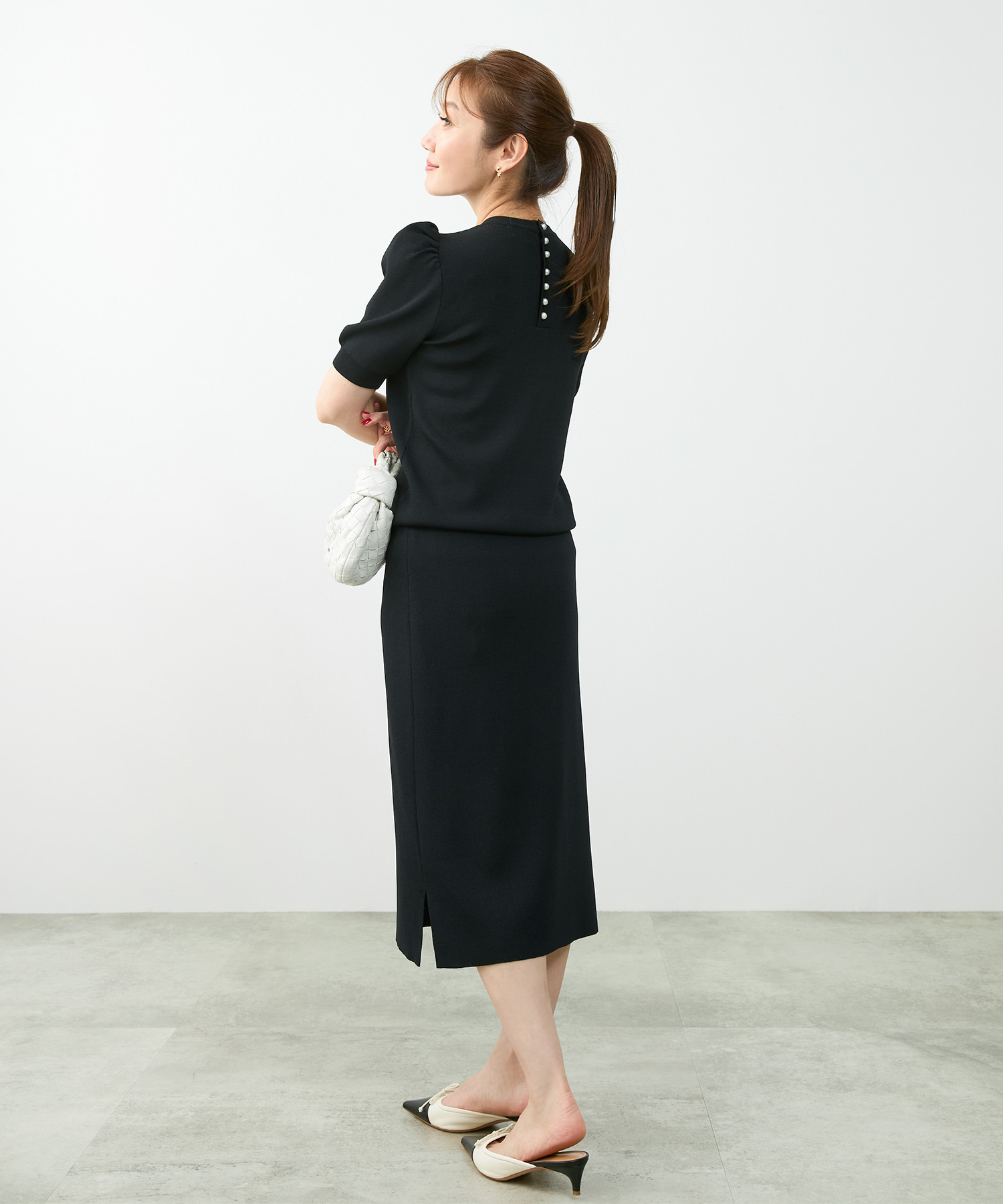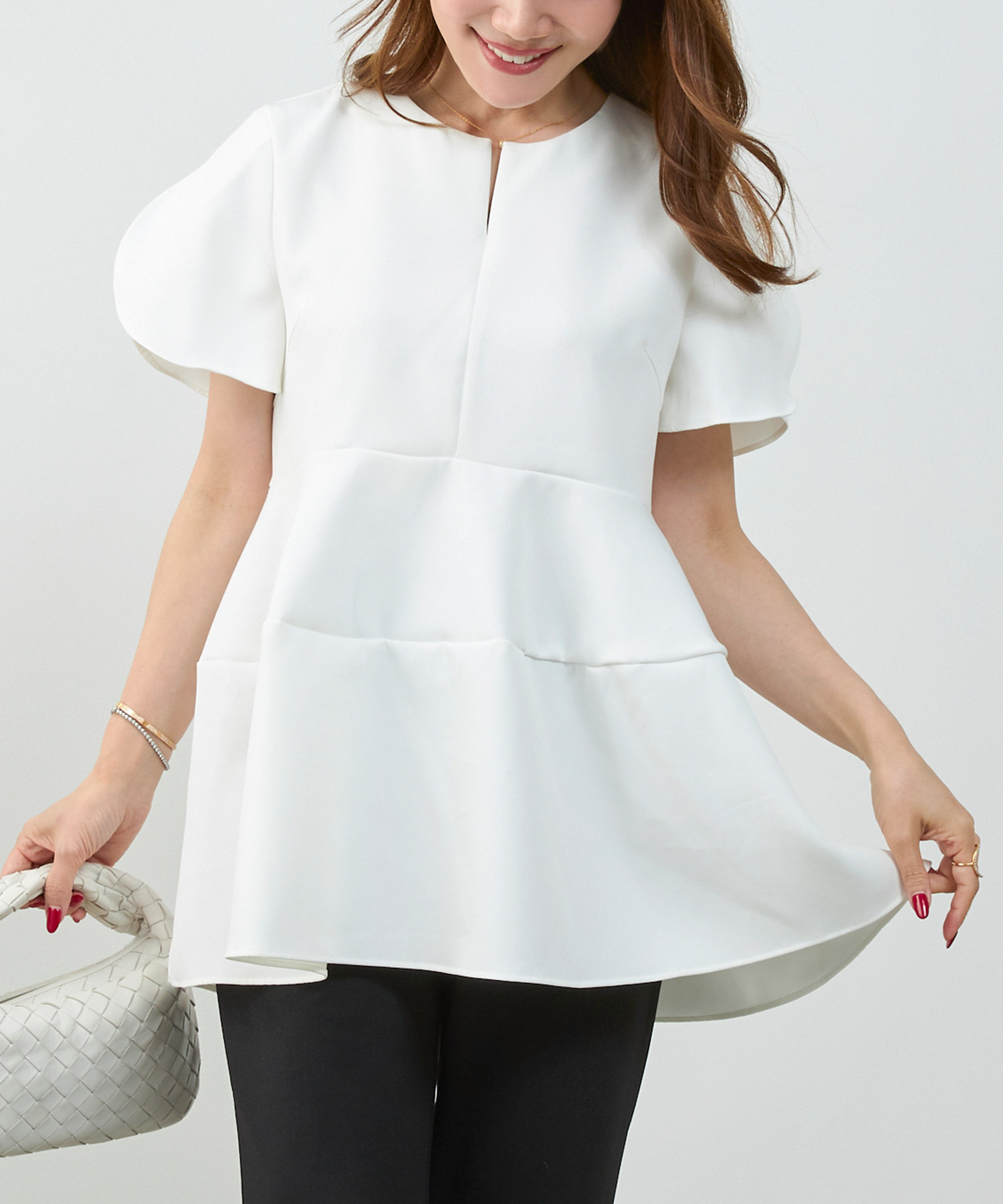 観劇など落ち着いたシーンには、ティアード ワンピースを。微光沢のあるサテン生地が華やかさを添え、落ち感のあるティアードデザインで上品にまとまります。動くたび揺れるシルエットがエレガントで、観劇後のディナーにも映える一枚です。