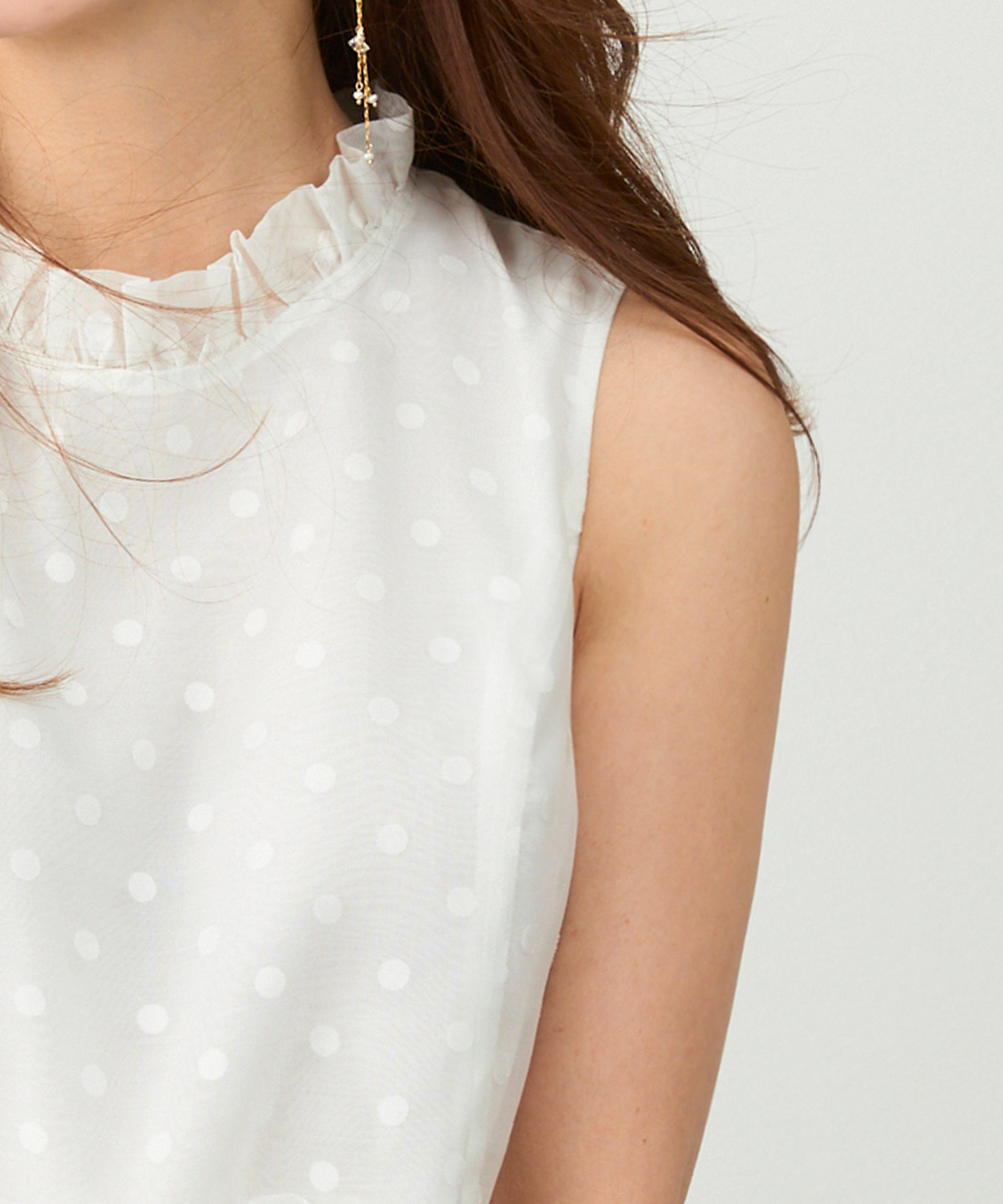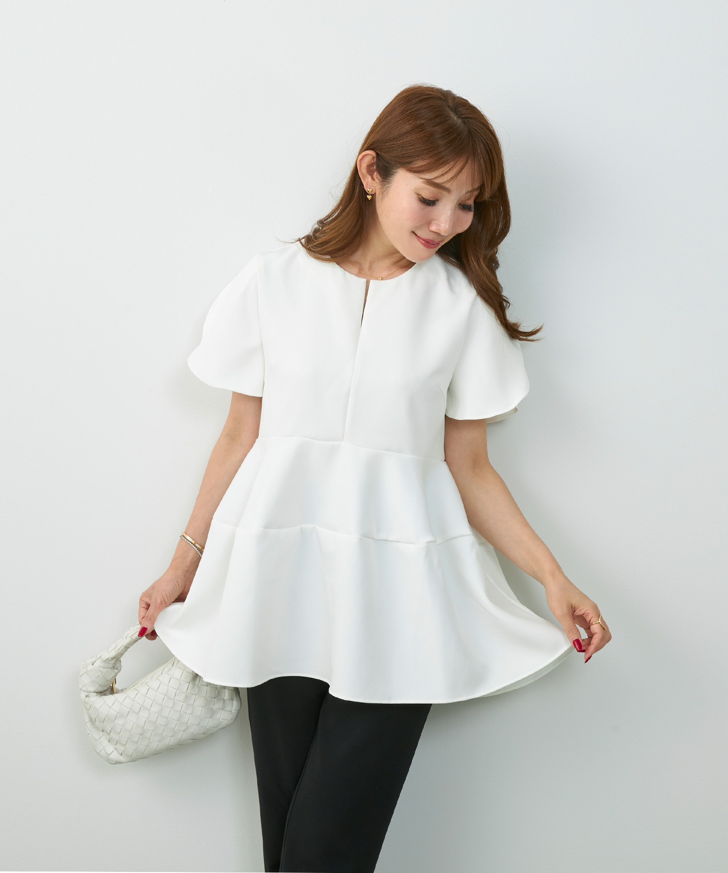 落ち感のあるドレープが動くたびに美しく揺れ、顔まわりをすっきり見せるブラウス。さらっとした素材感で残暑の通勤も快適。ジャケットのインナーにしても映える一枚です。