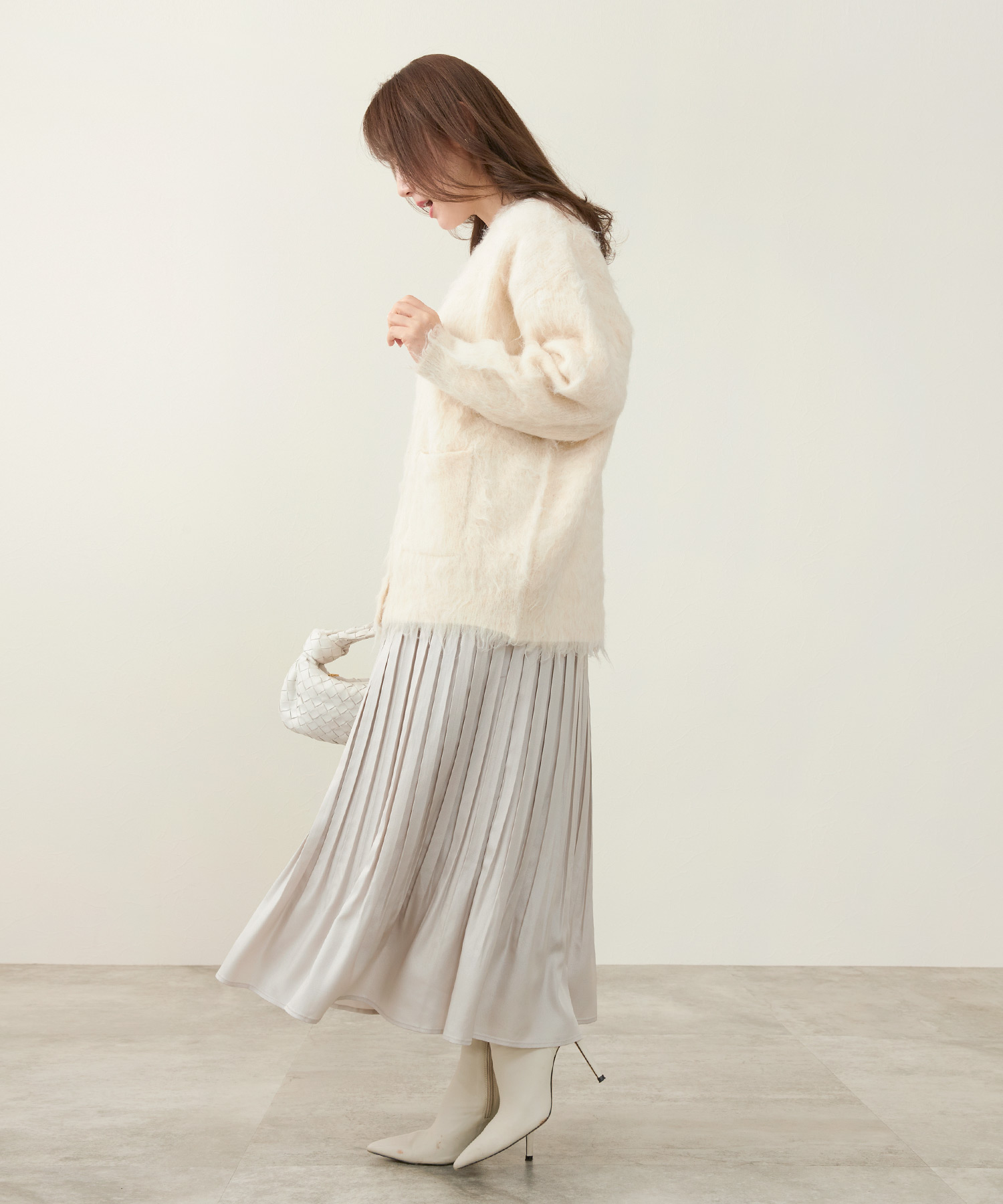 ふちフリンジがさりげなく華やぎ、羽織るだけで「きちんと感」が完成。軽いのにしっかり暖かく、15℃前後の帰り道もノーカラー×ストールで品よく温度調整できます。スカートにもパンツにも馴染むシルエットで、オンもオフもおまかせです。