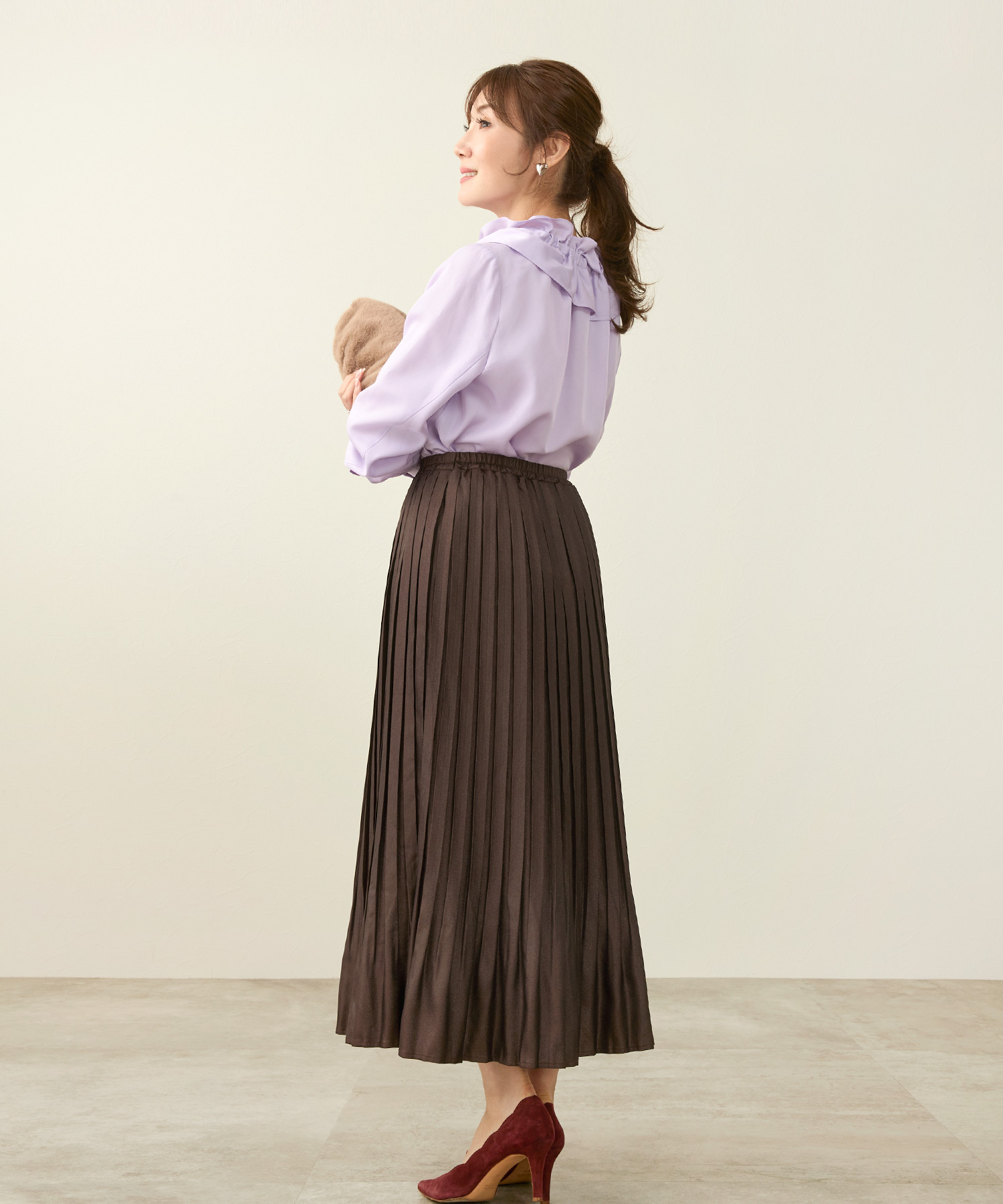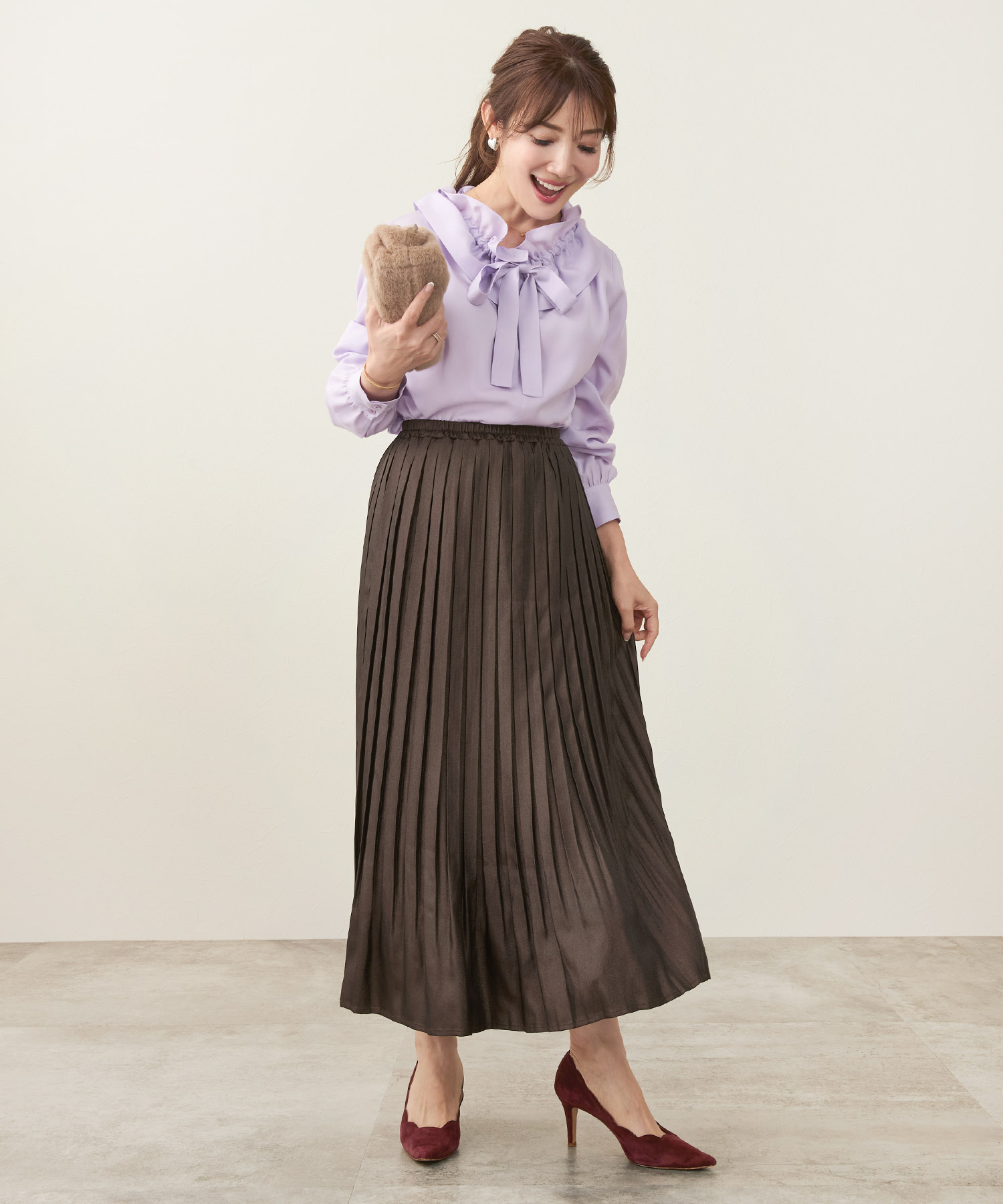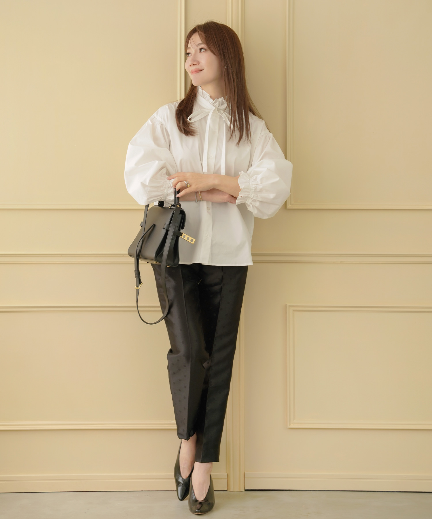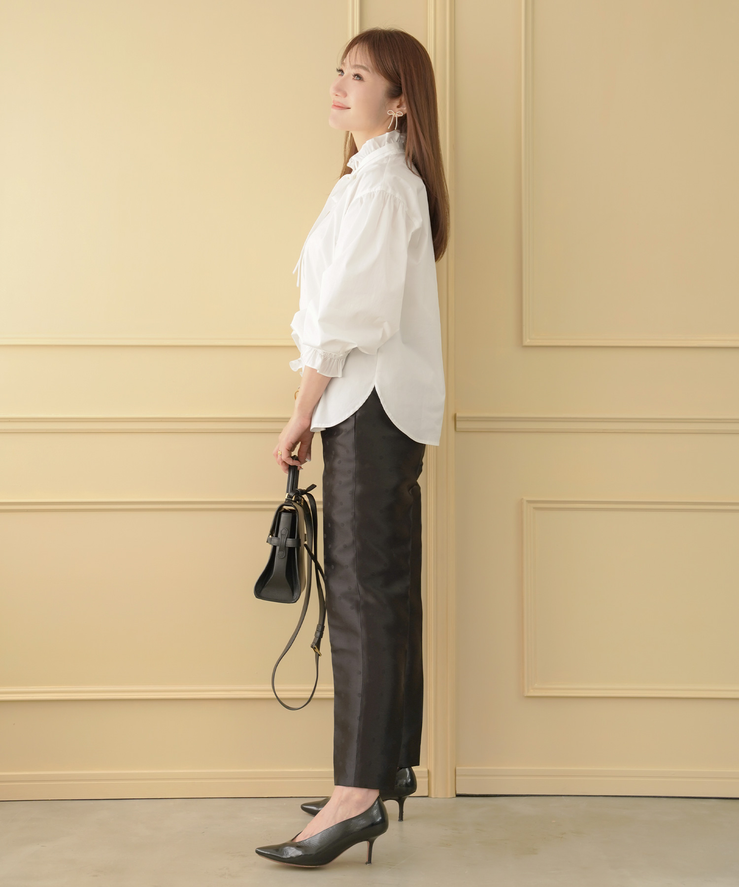 薄手で重ねてももたつかず、襟元のボウタイで一瞬にして「きちんと見え」。日中は一枚で快適、朝晩や会議室の冷えには軽い羽織を重ねればちょうどよく整います。秋色ボトムと合わせれば、通勤から打ち合わせまで上品にまとまります。