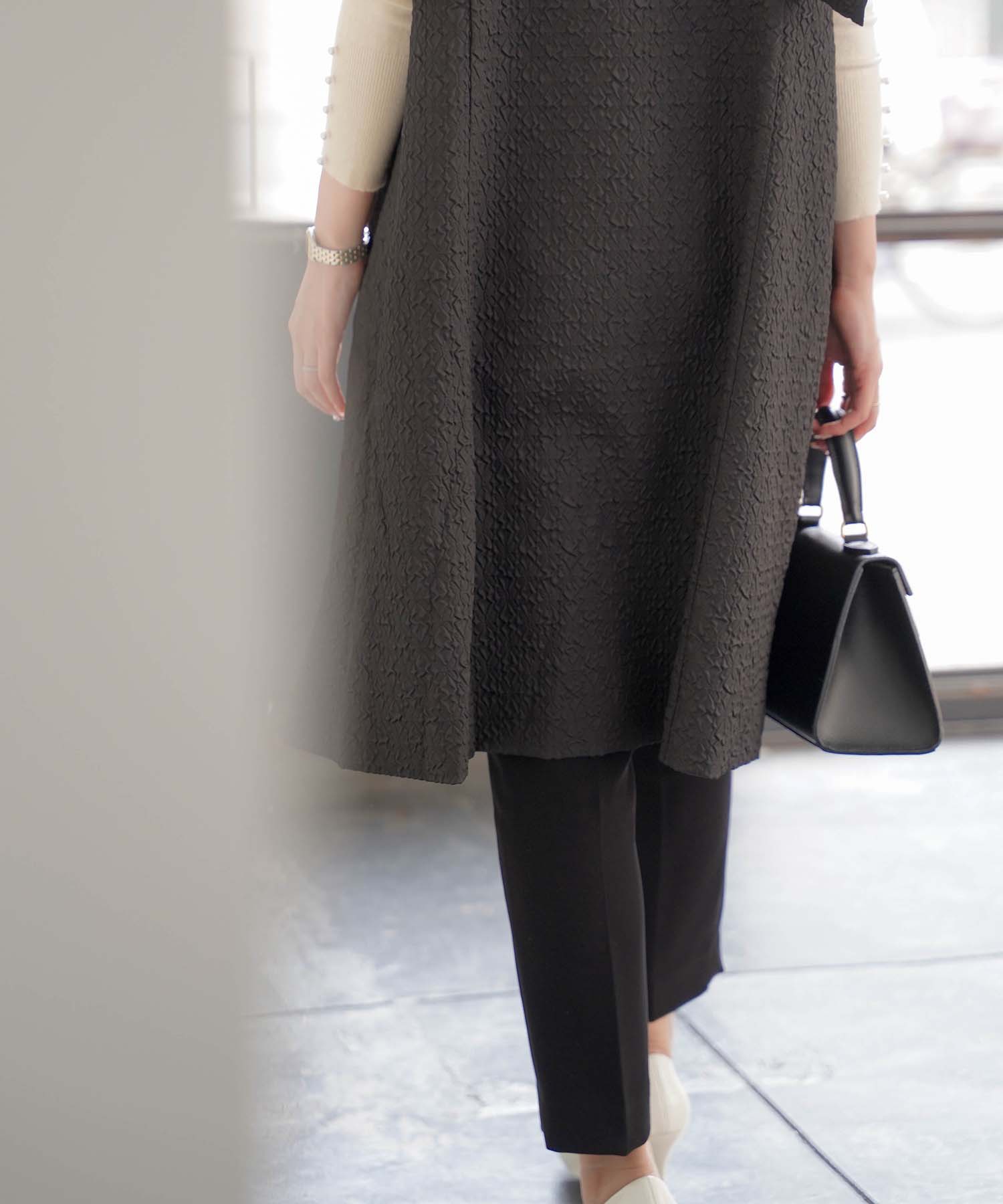直線的なシルエットが縦のラインを強調し、重ねても着膨れしにくいジレです。長袖カットソーや薄手ニットに重ねるだけで温度差に対応でき、通勤から外回りまで印象をきれいに整えます。軽量でしわ戻りも良く、持ち運びしやすいのも嬉しいポイント。