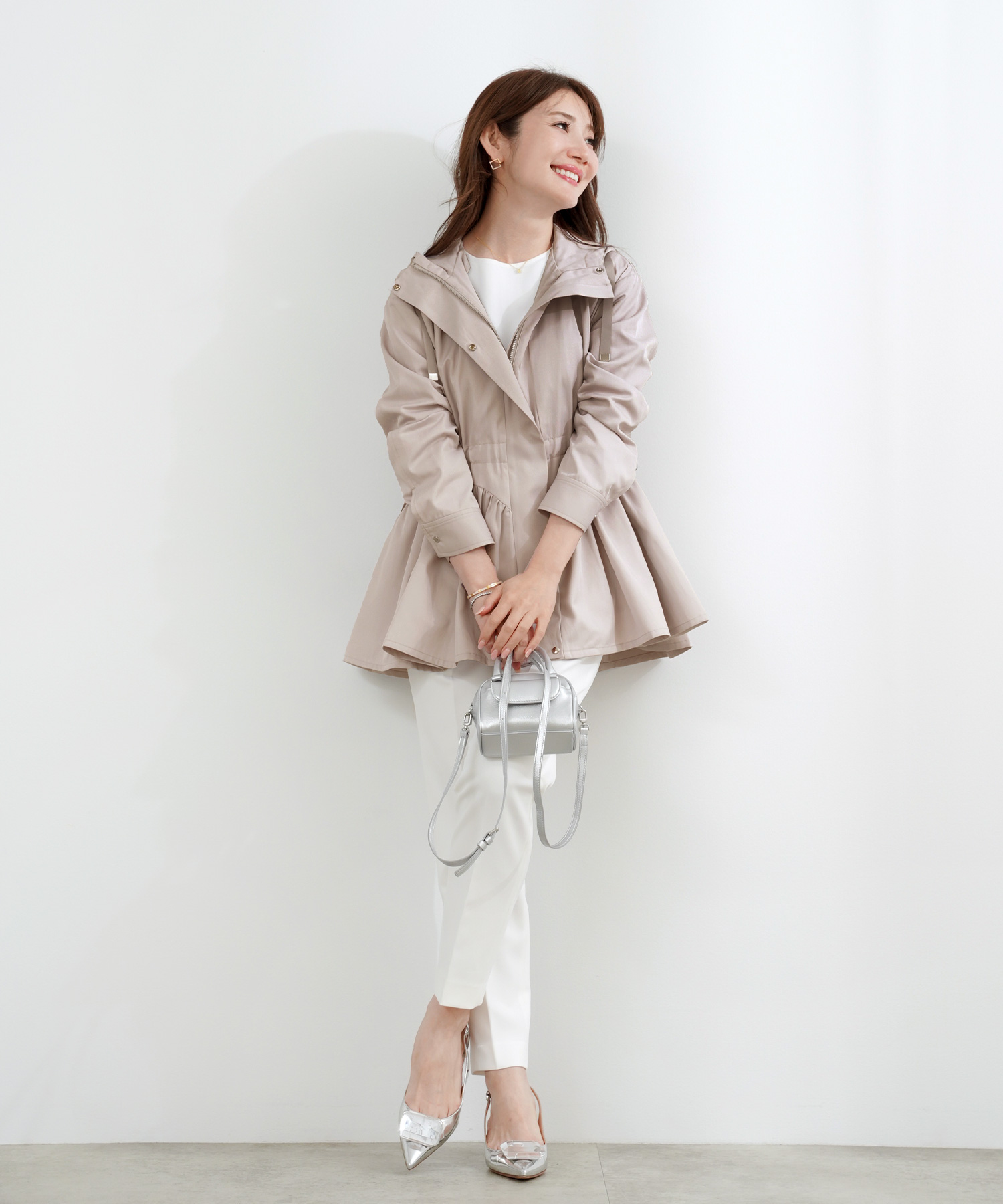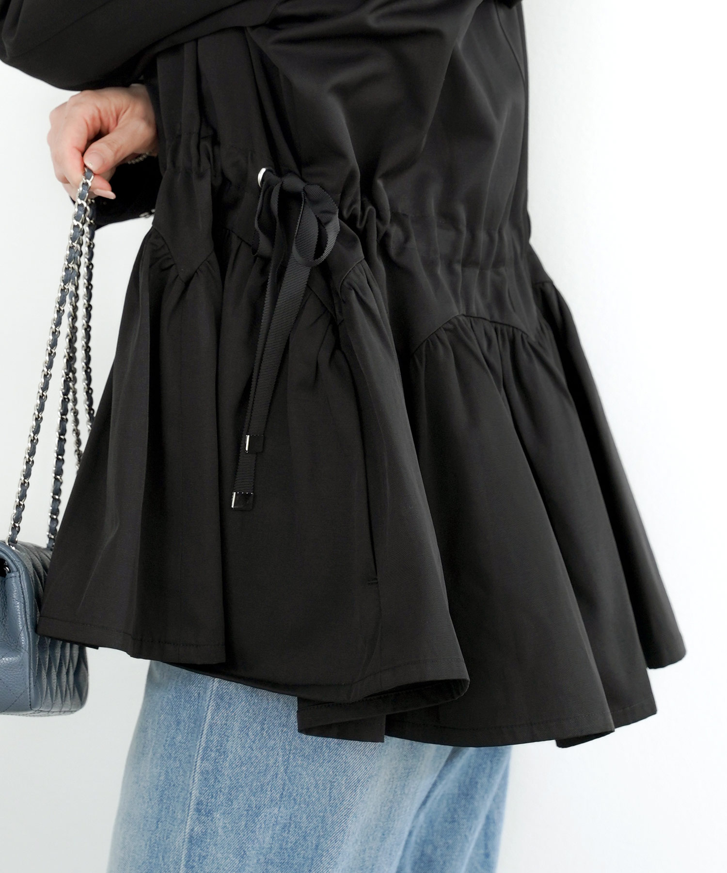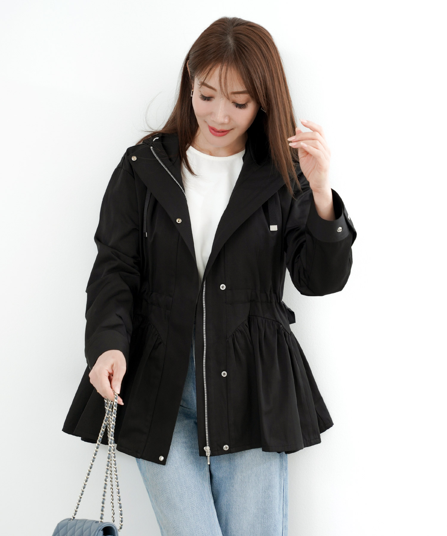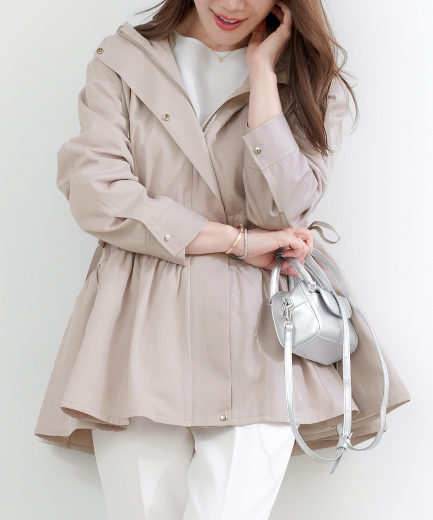 軽やかな生地とティアードの程よい甘さで、羽織るだけで表情が出るライトアウターです。表面がさらりとして花粉や汚れが付きにくく、小雨程度なら水滴を弾きやすい素材感で外出時も安心。前開きの2way仕様でさっと着脱でき、しわ戻りがよく軽量だから持ち運びにも便利です。※防水ではありません。雨天時は傘等をご併用ください。