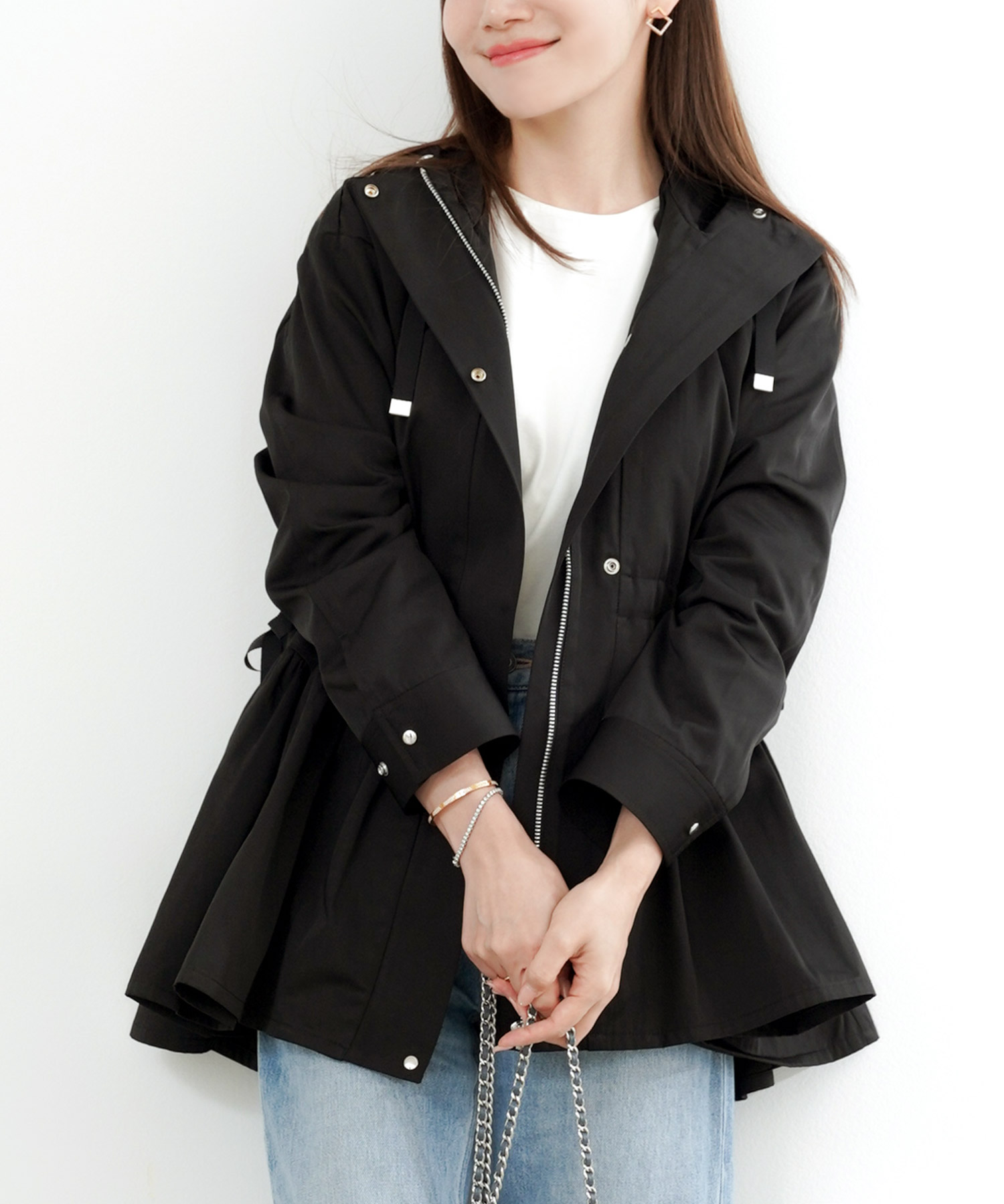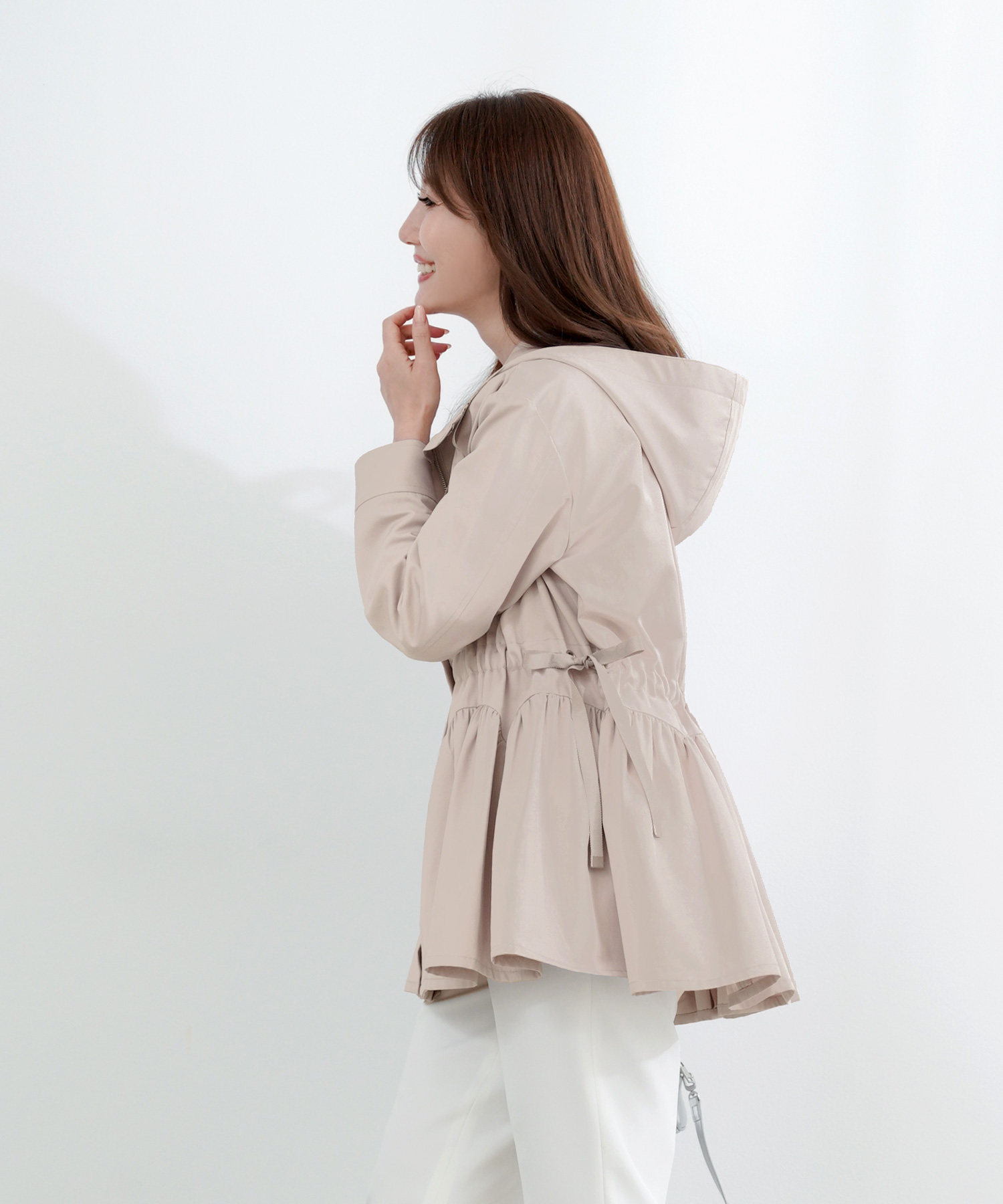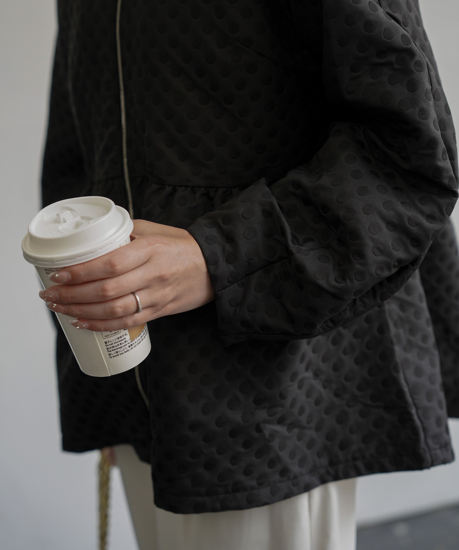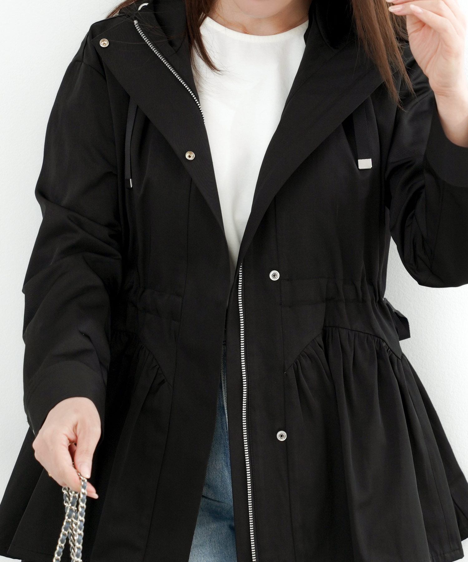 軽やかな生地とティアードの程よい甘さで、羽織るだけで表情が出るライトアウターです。表面がさらりとして花粉や汚れが付きにくく、小雨程度なら水滴を弾きやすい素材感で外出時も安心。前開きの2way仕様でさっと着脱でき、しわ戻りがよく軽量だから持ち運びにも便利です。※防水ではありません。雨天時は傘等をご併用ください。