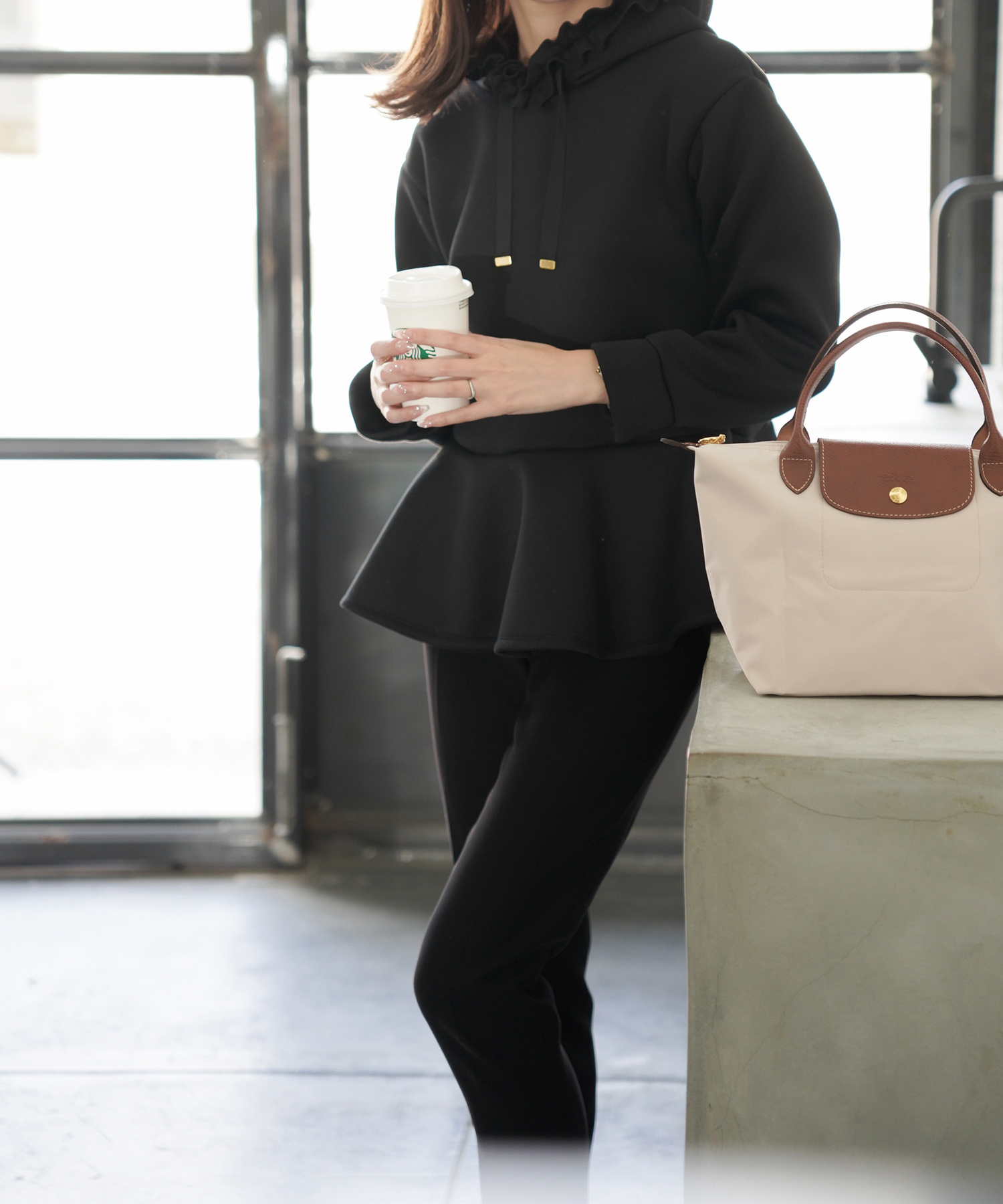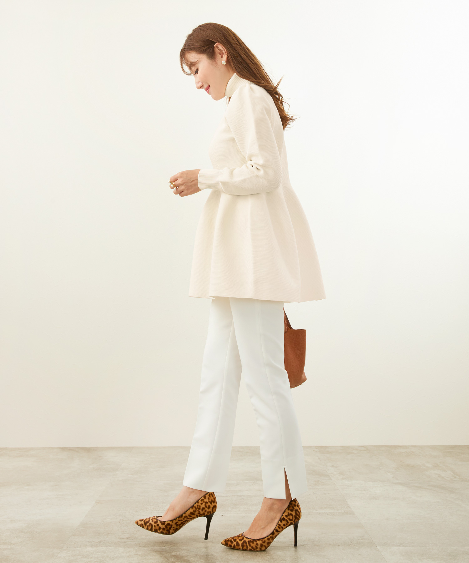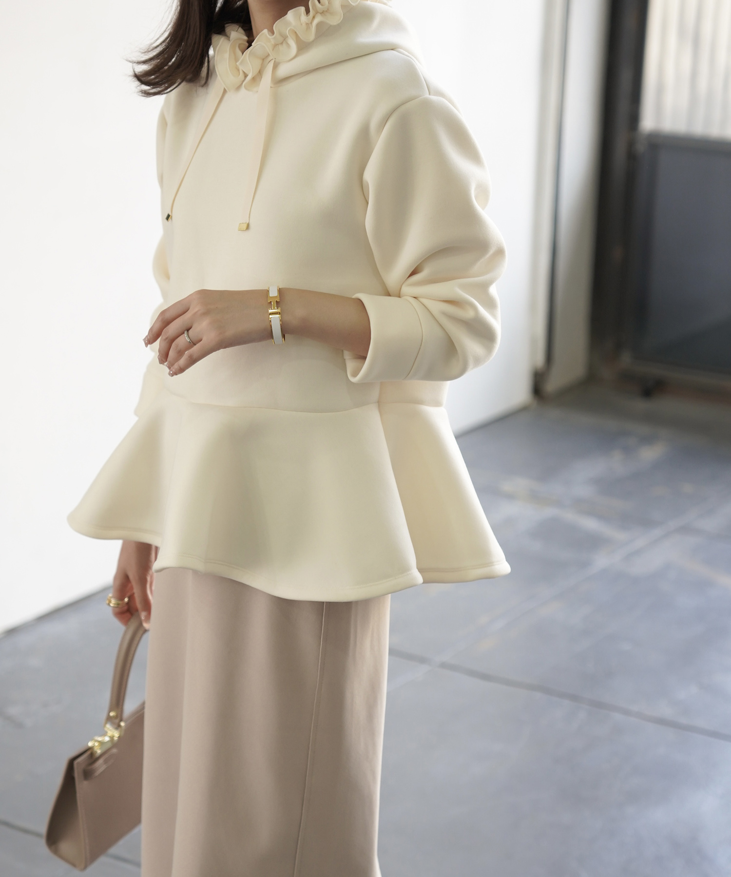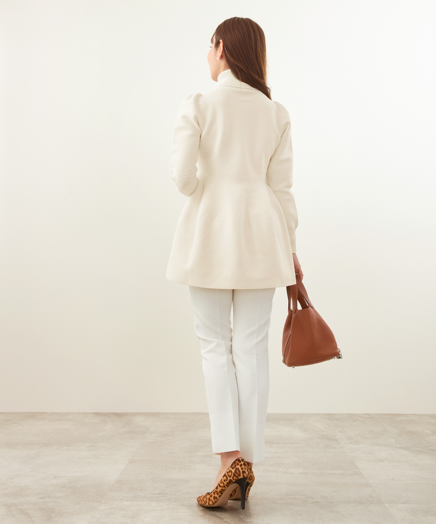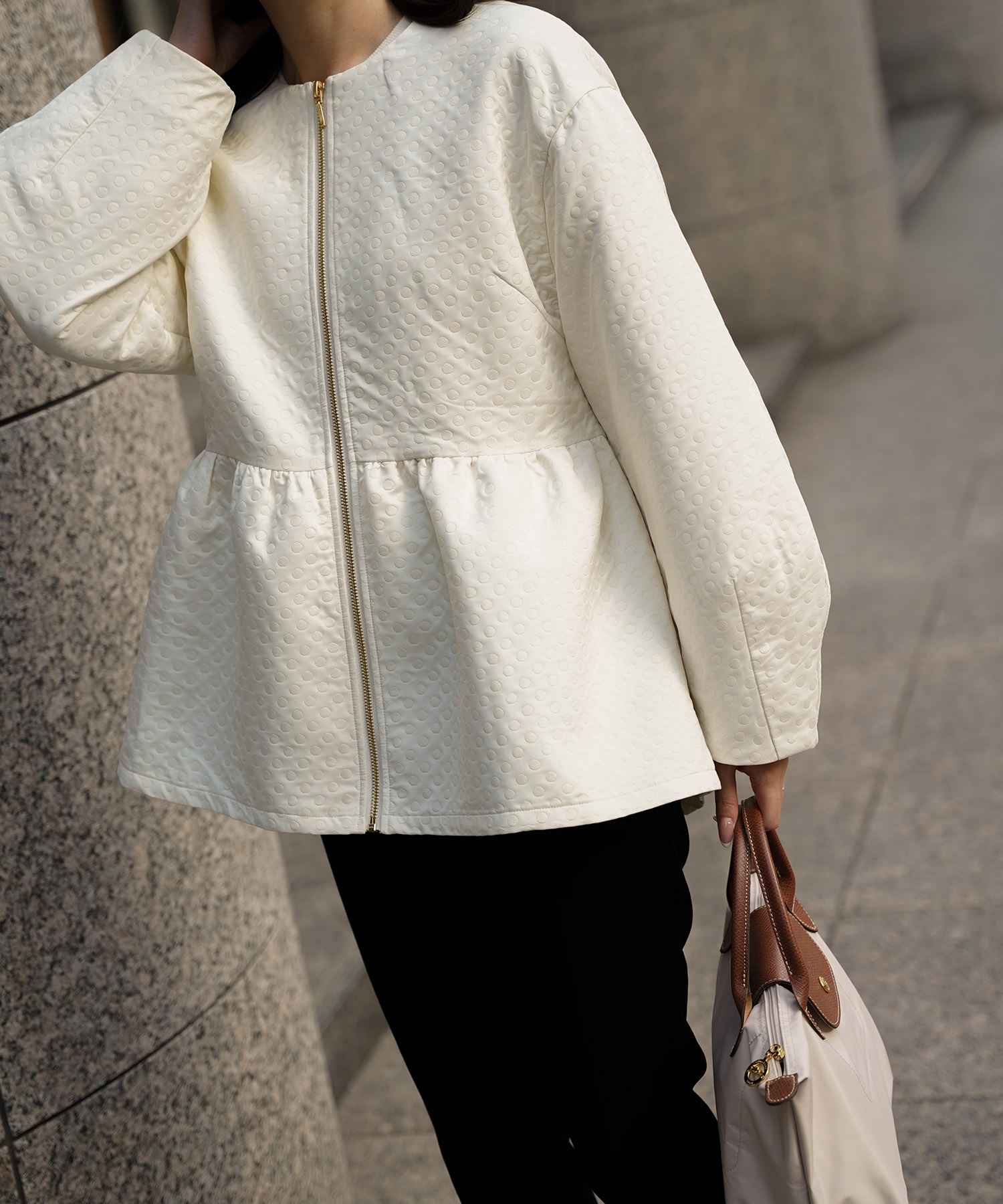 ダンボールニットの程よいハリと2段フリルのペプラムで腰位置が高く見え、着膨れせずすっきり。ほんのり中綿が体幹をやさしく保温し、16〜19℃の肌寒さにも対応します。ノーカラーはストールが巻きやすく、夜はタイツやインの薄手ニットを重ねれば一日中快適です。