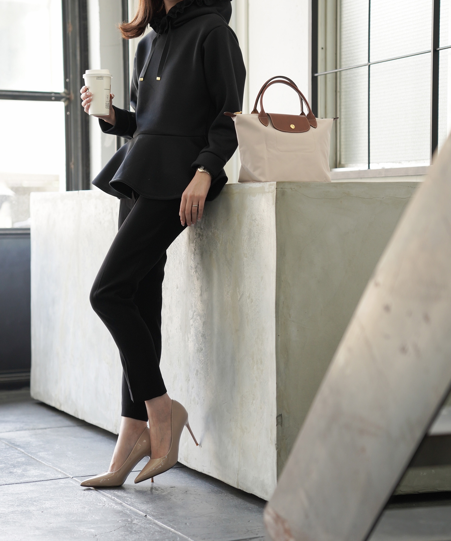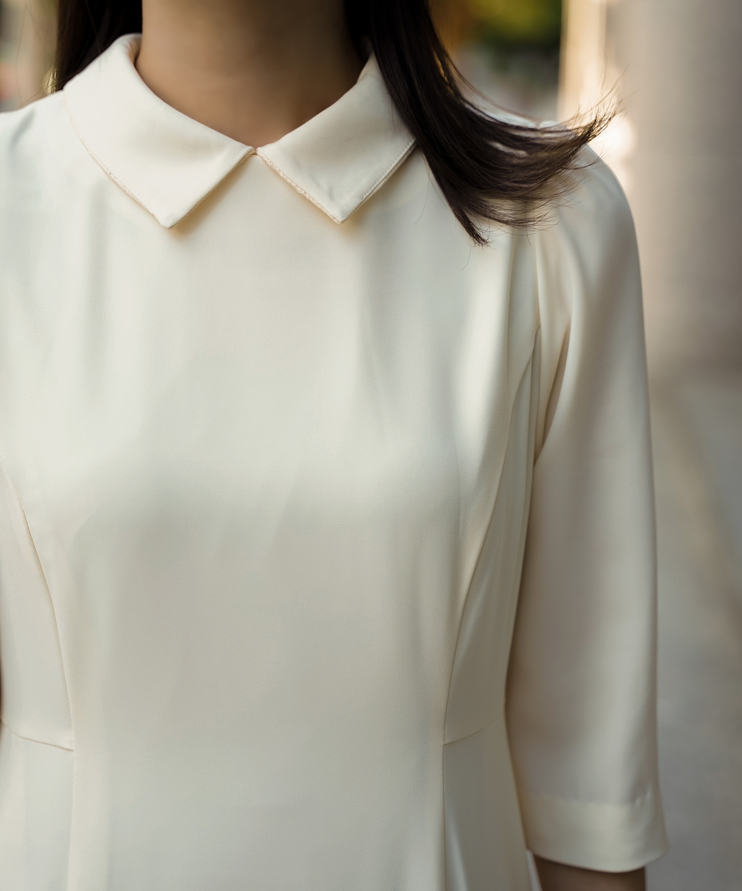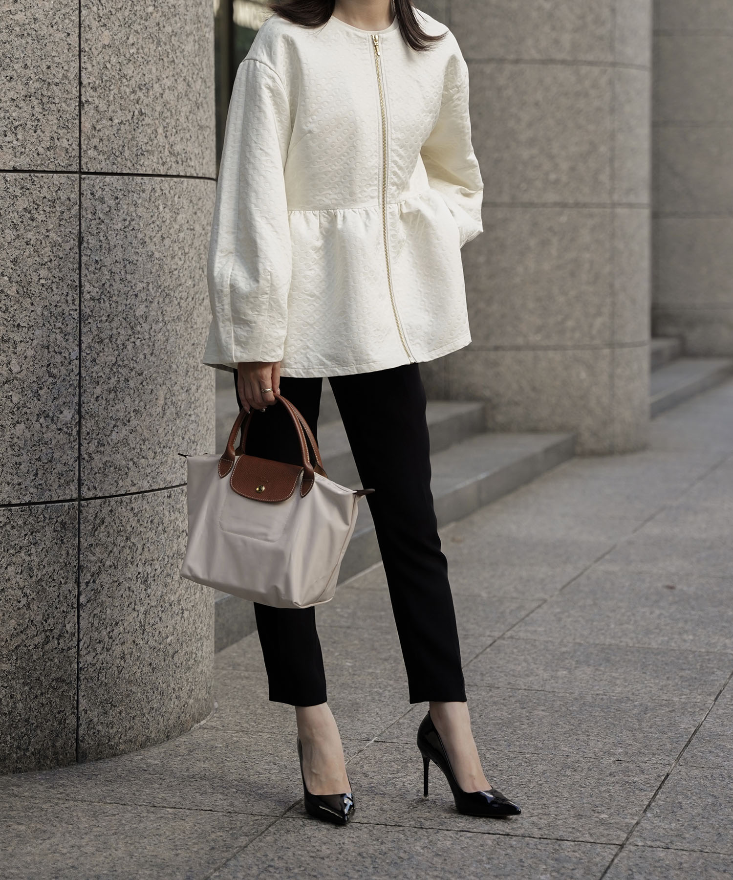 ふんわりパフスリーブとペプラムの切り替えで、着るだけで「きちんと見え」と女性らしいメリハリが両立。8分袖は手首がすっきり見え、ジャケットやジレのインにももたつかず快適です。会議から外回りまで一日中印象よく、ボトムを選ばない万能ブラウス。