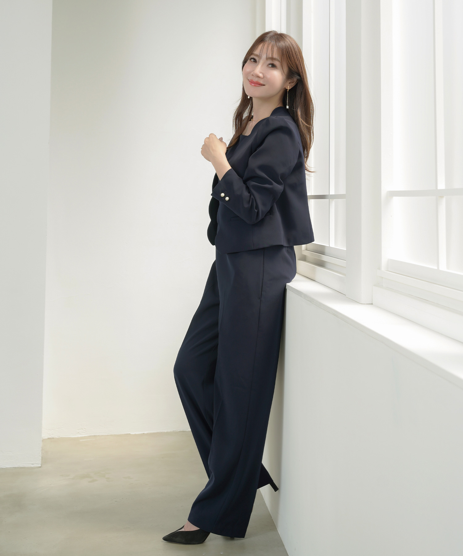 艶のある上品な表面感と適度なハリで、重ねてもすっきり見えるノーカラージャケットです。軽やかでやや伸びのある生地は長時間の移動や会議でも動きやすく、袖口スリットでロールアップもスマート。フロントホックとポケット付きで実用性も高く、ご自宅で手洗いできるからデイリーからオケージョンまで頼れます。