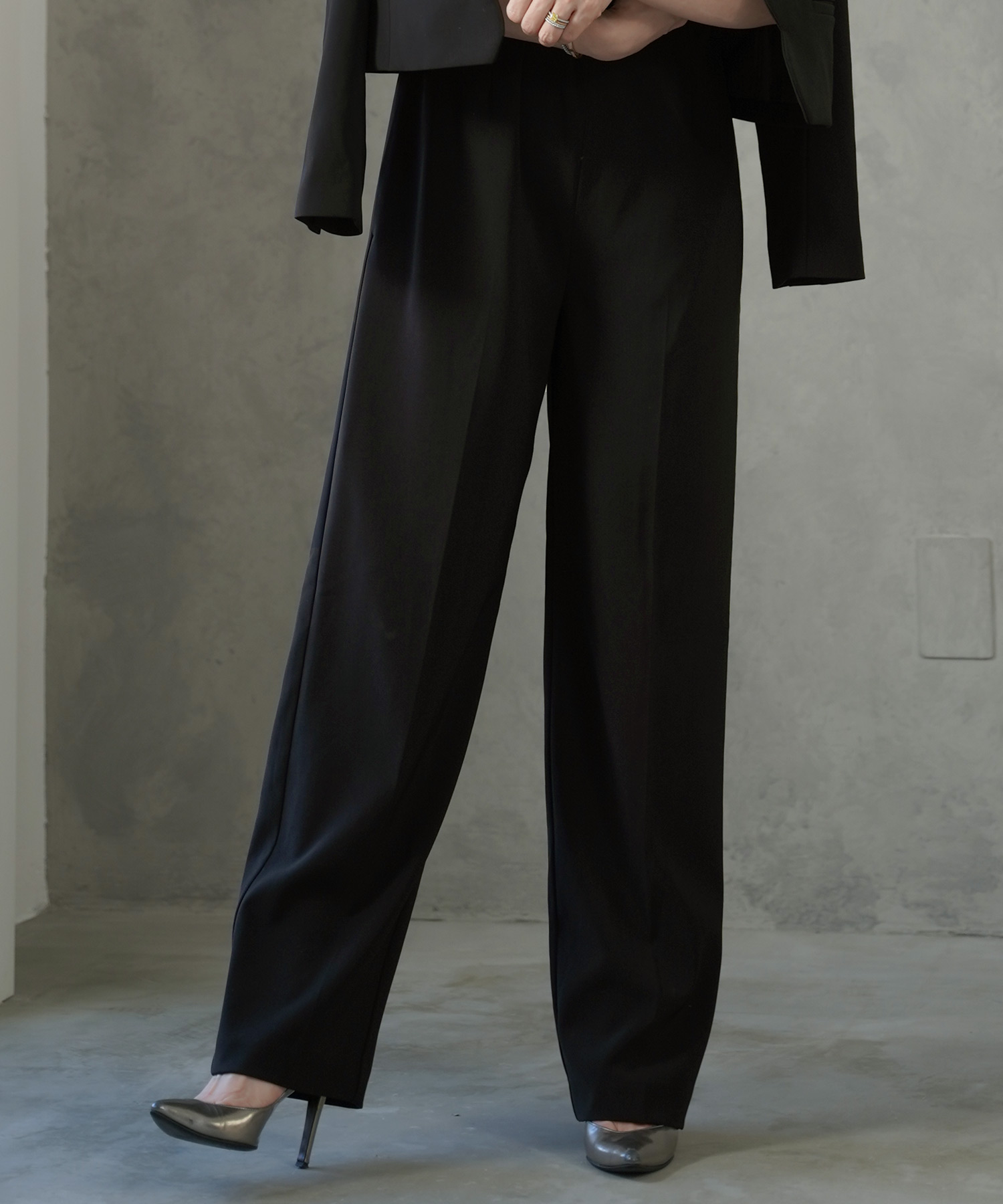 センタープレスが縦のラインを強調し、すっきりとした美脚印象に。ウエストのドロストでフィット感を調整でき、通勤も長時間のデスクワークも快適です。ほどよい伸縮性で動きやすく、フラットにもヒールにも合う万能一本。