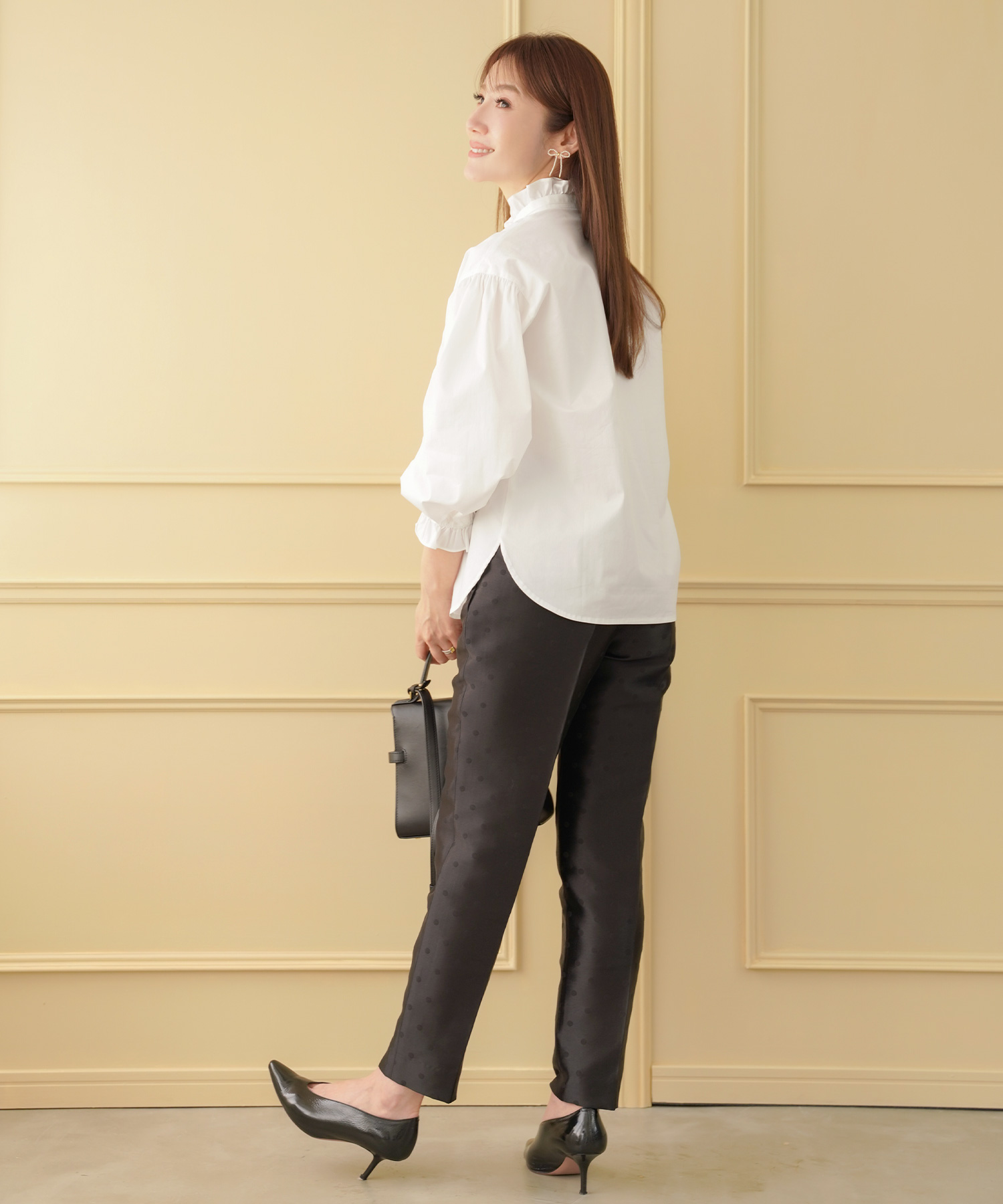バンドカラーと控えめフリルで、着るだけで「きちんと見え」する一着。日中は軽やかに、朝晩や会議室の冷えには羽織を重ねればすっきり整います。薄手でレイヤードしてももたつきにくく、快適な着心地です。