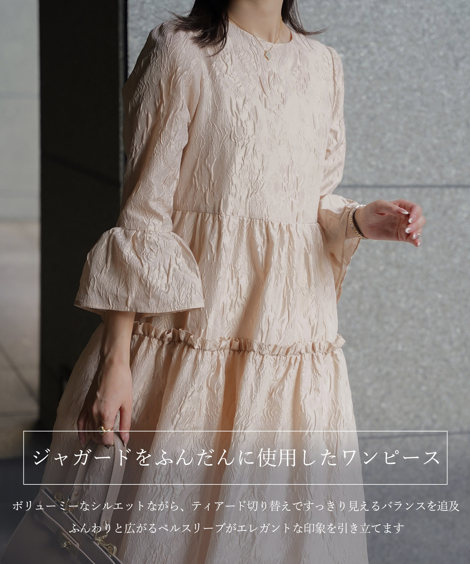 格式のあるホテルでの忘年会には、リッチ感のあるジャガード素材のワンピースがよく映えます。立体感のある織り柄が自然な華やかさをプラスしてくれるので、派手に盛らなくても「きちんと感」と「特別感」を両立できるのが魅力です。ウエスト位置がやや高めの切り替えデザインなら、スタイルアップ効果も期待できます。袖はベルスリーブなど、ほどよいボリュームのあるデザインを選ぶと、着席時も手元が上品に見えて写真映えも◎。足元はシンプルなパンプスと控えめなアクセサリーを合わせるだけで、大人のエレガントなホテル忘年会コーデが完成します。