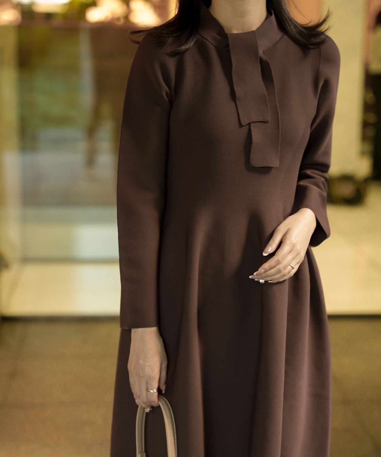 同窓会を兼ねた忘年会は、久しぶりに会う同級生に「きれいになったね」と思ってもらえるような、清潔感と親しみやすさを両立したい場です。ボウタイ付きのニットワンピースは、一枚で顔まわりにポイントができるため、写真に写ったときにも上半身が華やかに見えます。結び方次第で、少し甘めにも、きりっとした印象にも調整できるのも魅力。色はネイビーやグレージュ、ボルドーなど、大人の肌になじむ落ち着いたトーンがおすすめです。アクセサリーは耳元か手首のどちらか一方に絞って、全体がうるさくならないように整えると、上品で好印象な同窓会コーデに仕上がります。