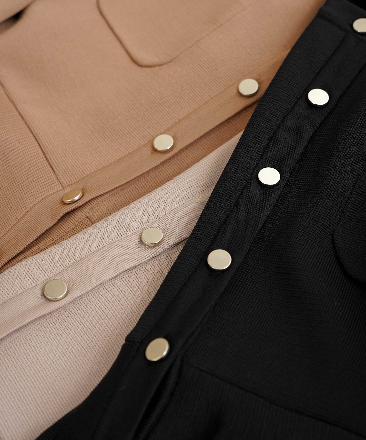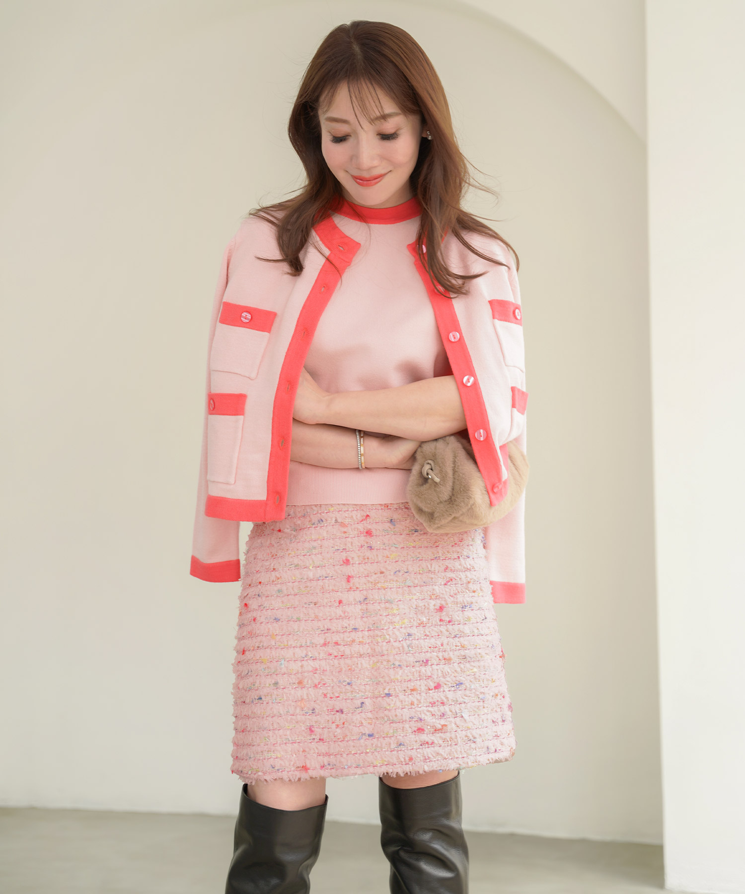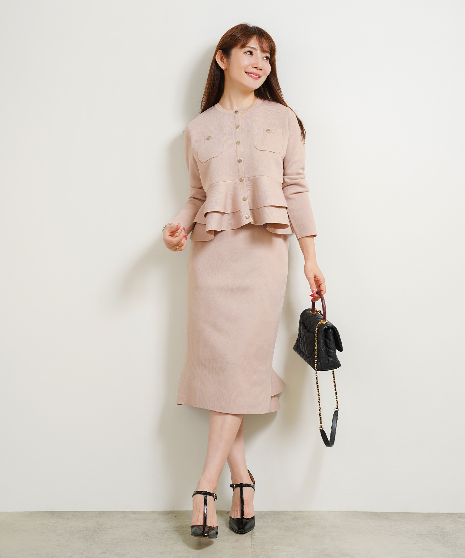 取引先との忘年会は、ビジネスの場とリラックスした社交場が融合した特別なシーン。そんな場では、きちんと感を保ちつつ親しみやすさを感じさせるスタイルが求められます。カーディガンとタイトスカートのニットセットアップは、上品さと快適さを兼ね備え、好印象を与えるのに最適。ニット素材はリラクシーに着用でき、張りのあるミラノリブ素材を選ぶことでカジュアルになり過ぎず、ビジネスシーンにもマッチします。