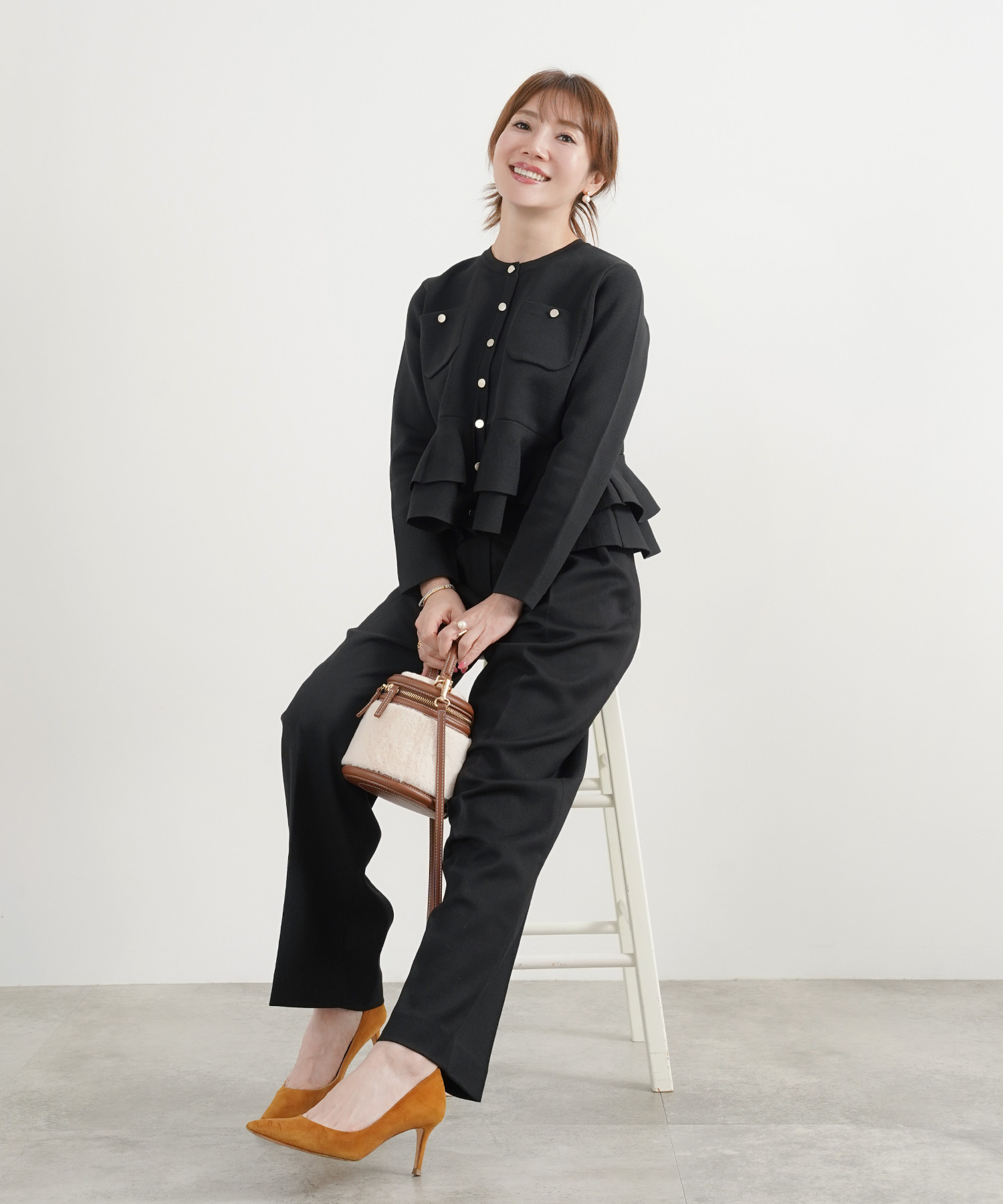 30代・40代のパーティーシーン|ブラックのジャケット×パンツで大人っぽく