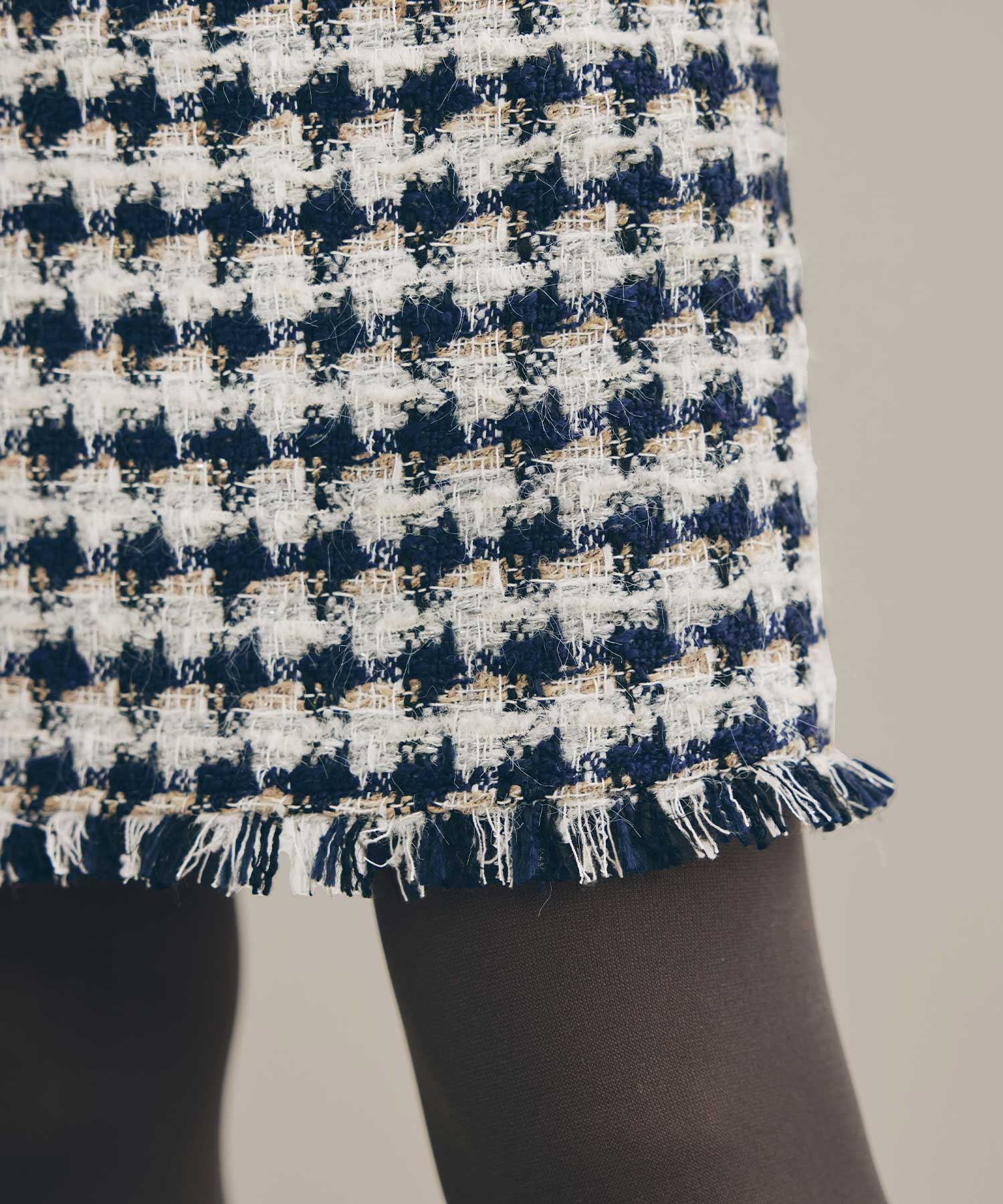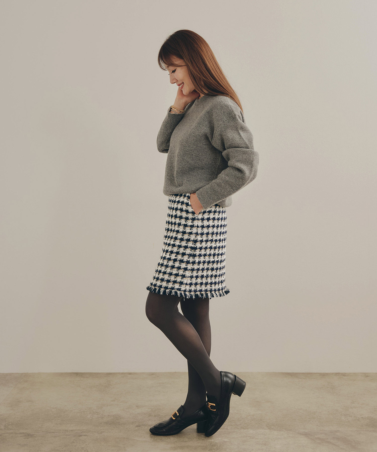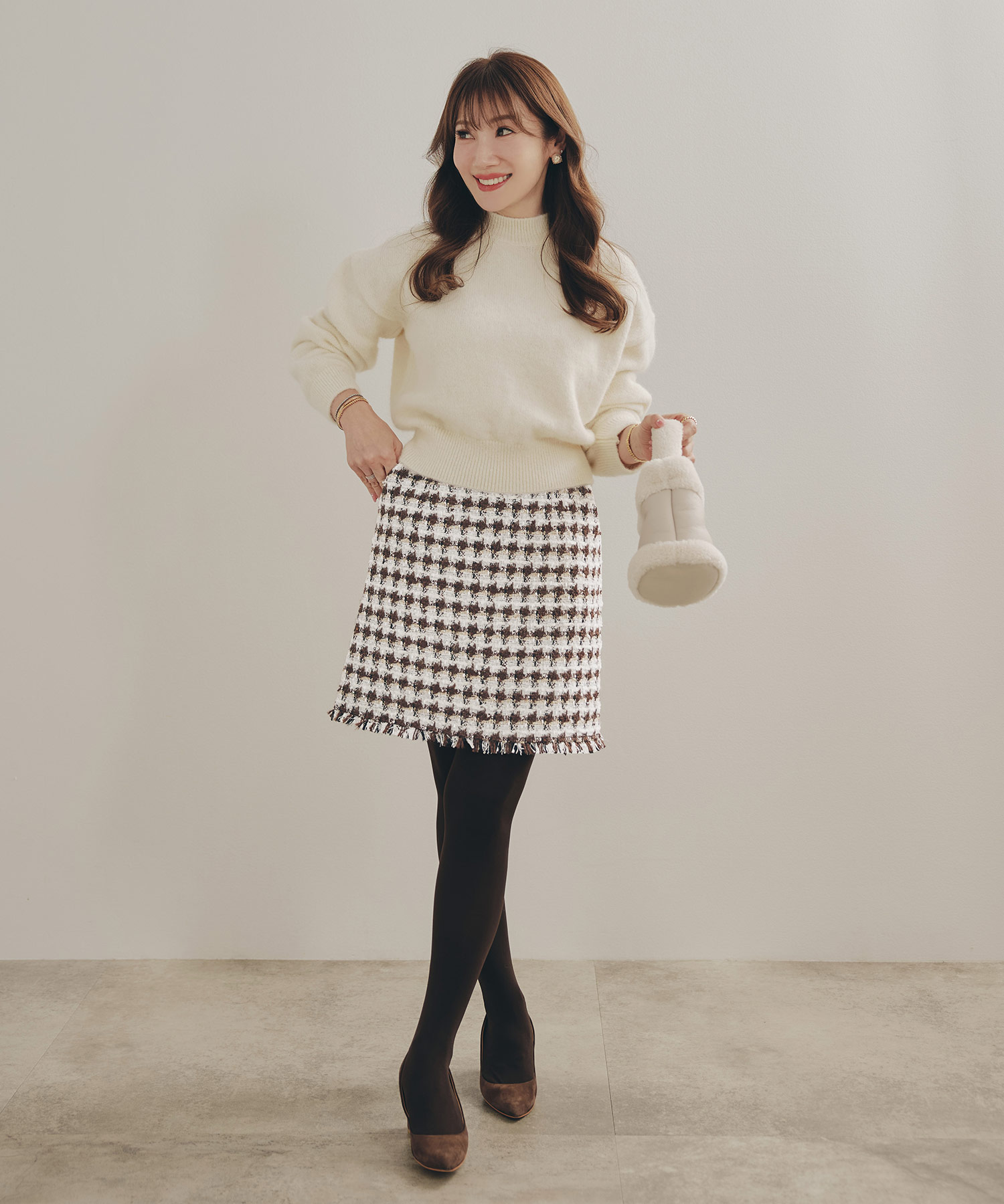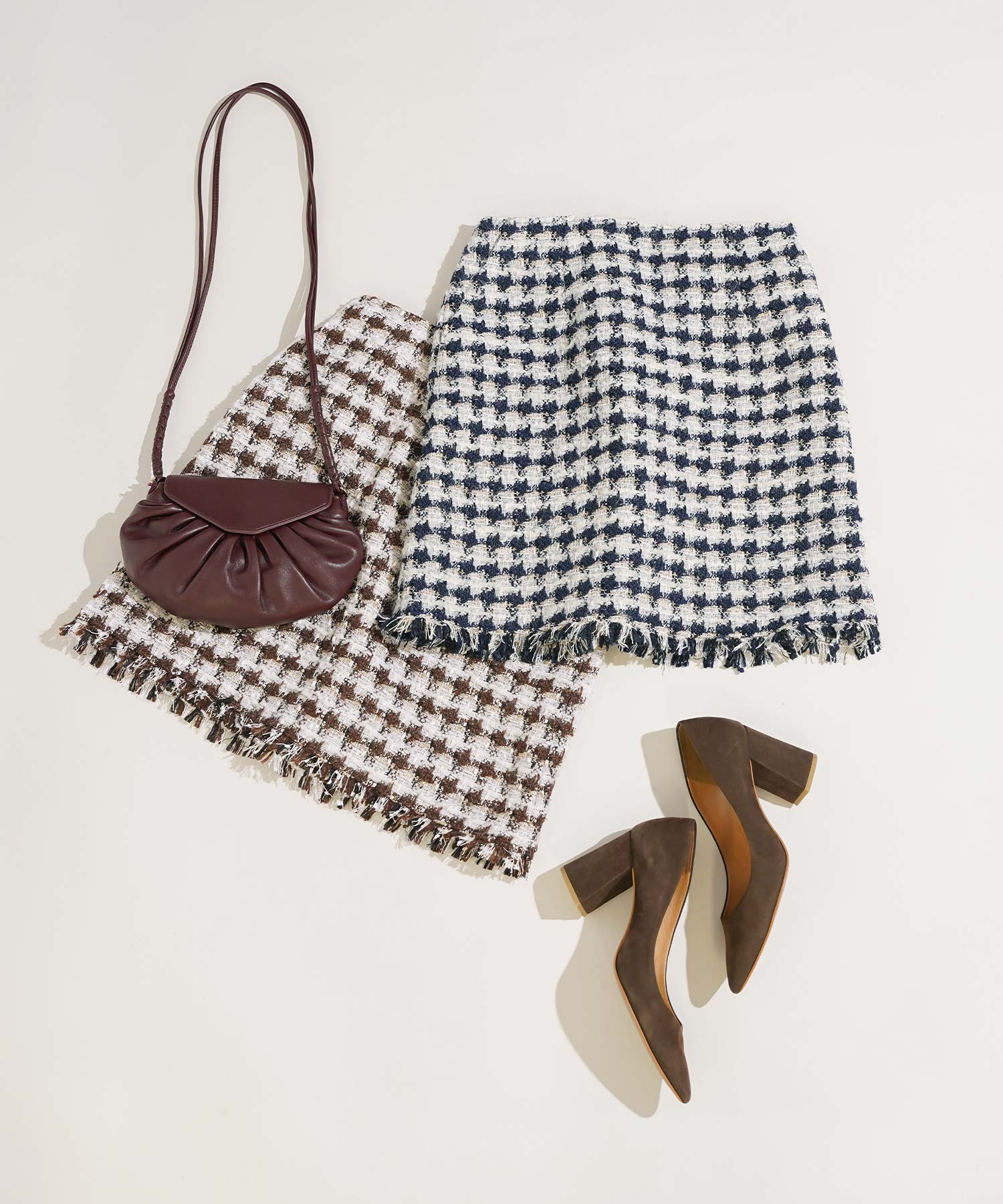 ざっくりとした糸で織り上げたツイードの千鳥柄が、クラブやバーのライトに映える華やかな一枚。裾のフリンジが揺れて、動くたびに表情が生まれます。程よく広がる台形シルエットが太ももまわりをさりげなくカバーしてくれるので、ミニ丈でも大人っぽく着こなせ、ロングブーツ合わせの忘年会コーデにぴったり。