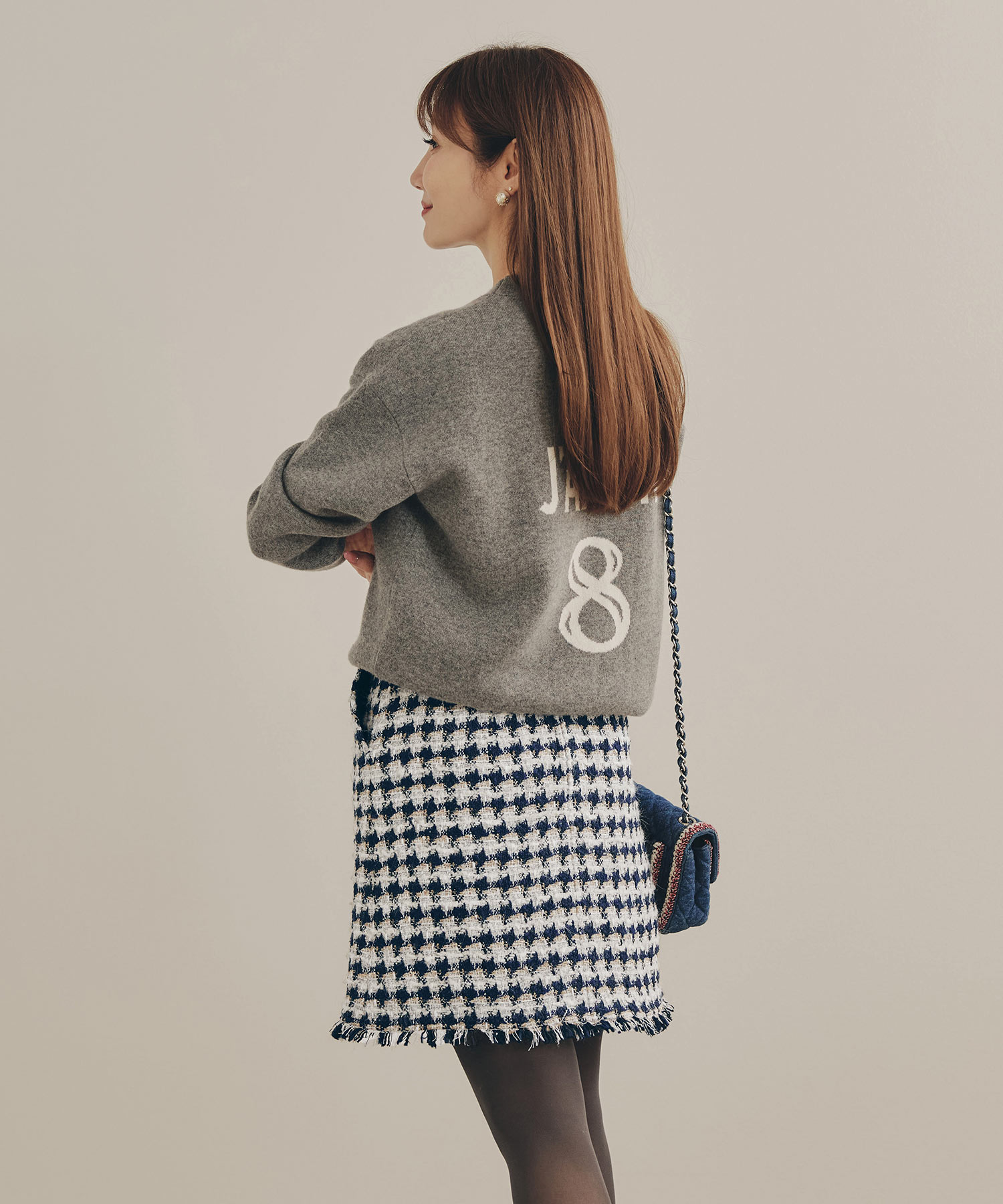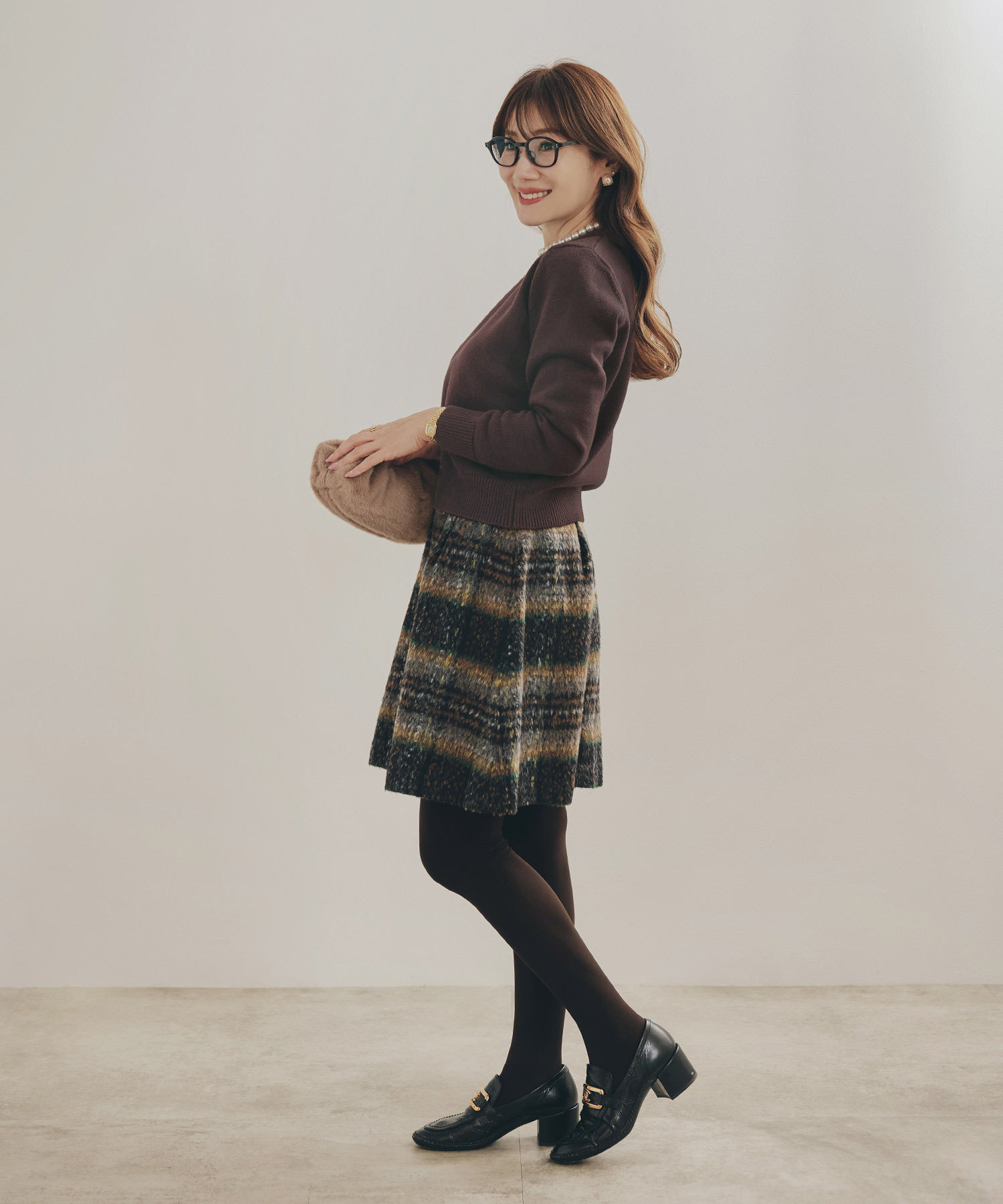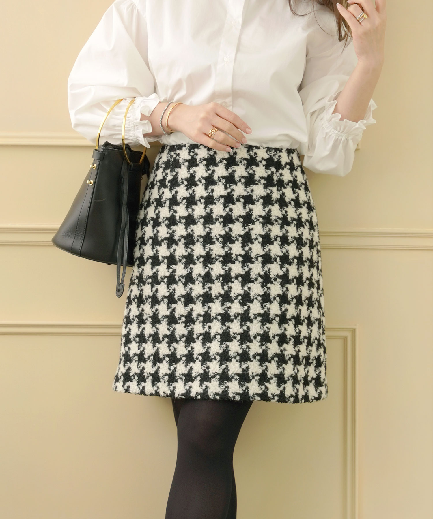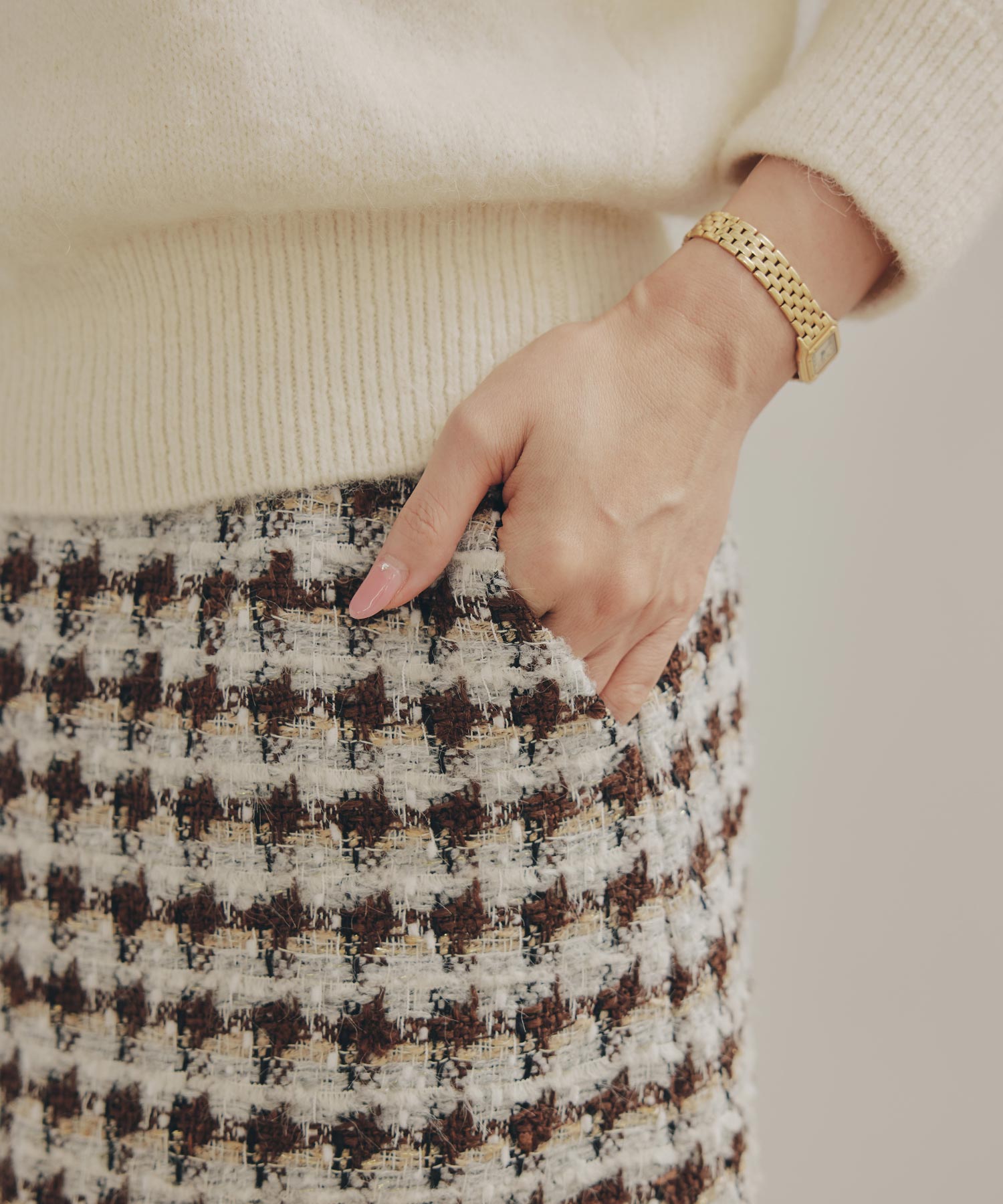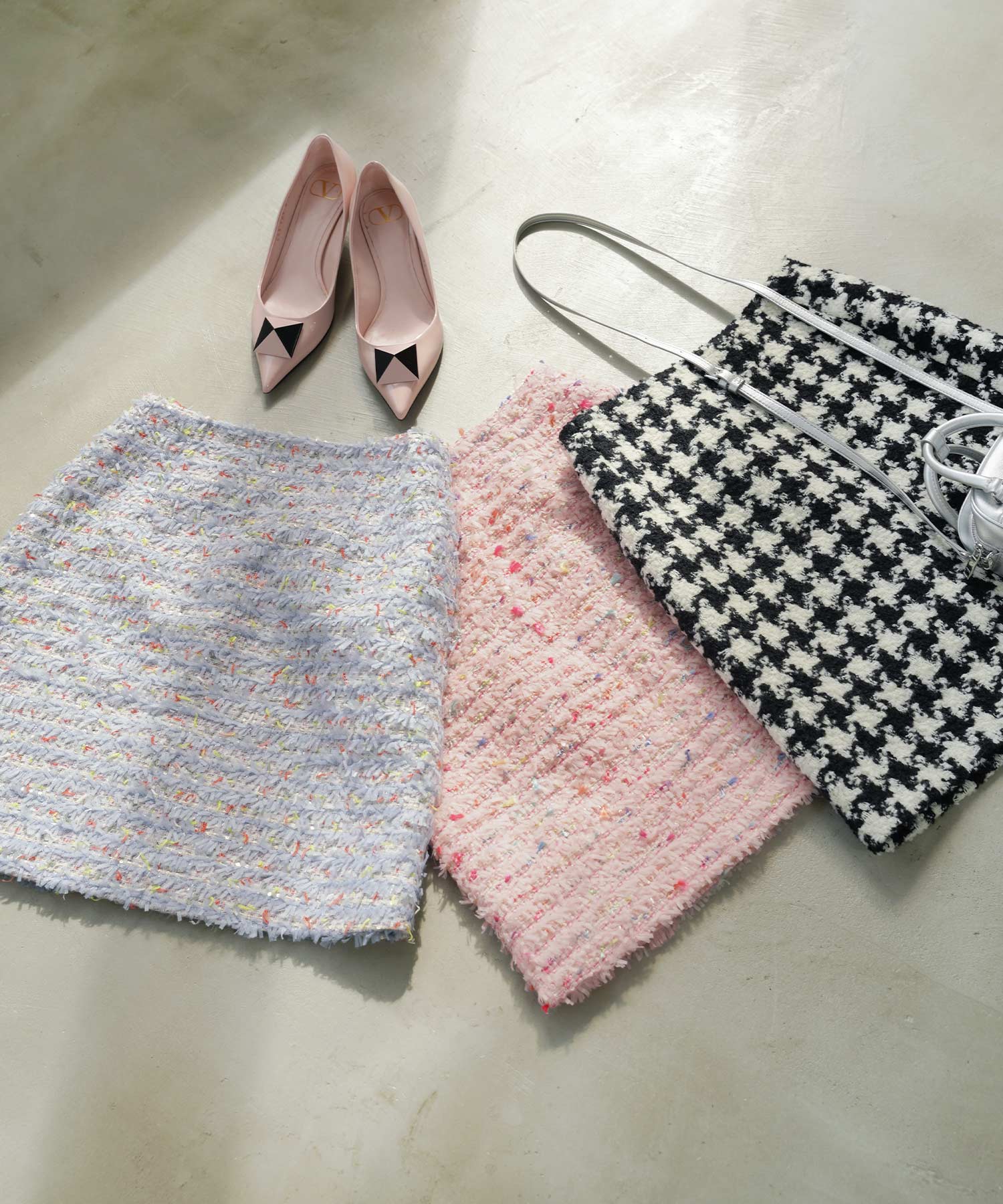 ざっくりとした糸で織り上げたツイードの千鳥柄が、クラブやバーのライトに映える華やかな一枚。裾のフリンジが揺れて、動くたびに表情が生まれます。程よく広がる台形シルエットが太ももまわりをさりげなくカバーしてくれるので、ミニ丈でも大人っぽく着こなせ、ロングブーツ合わせの忘年会コーデにぴったり。