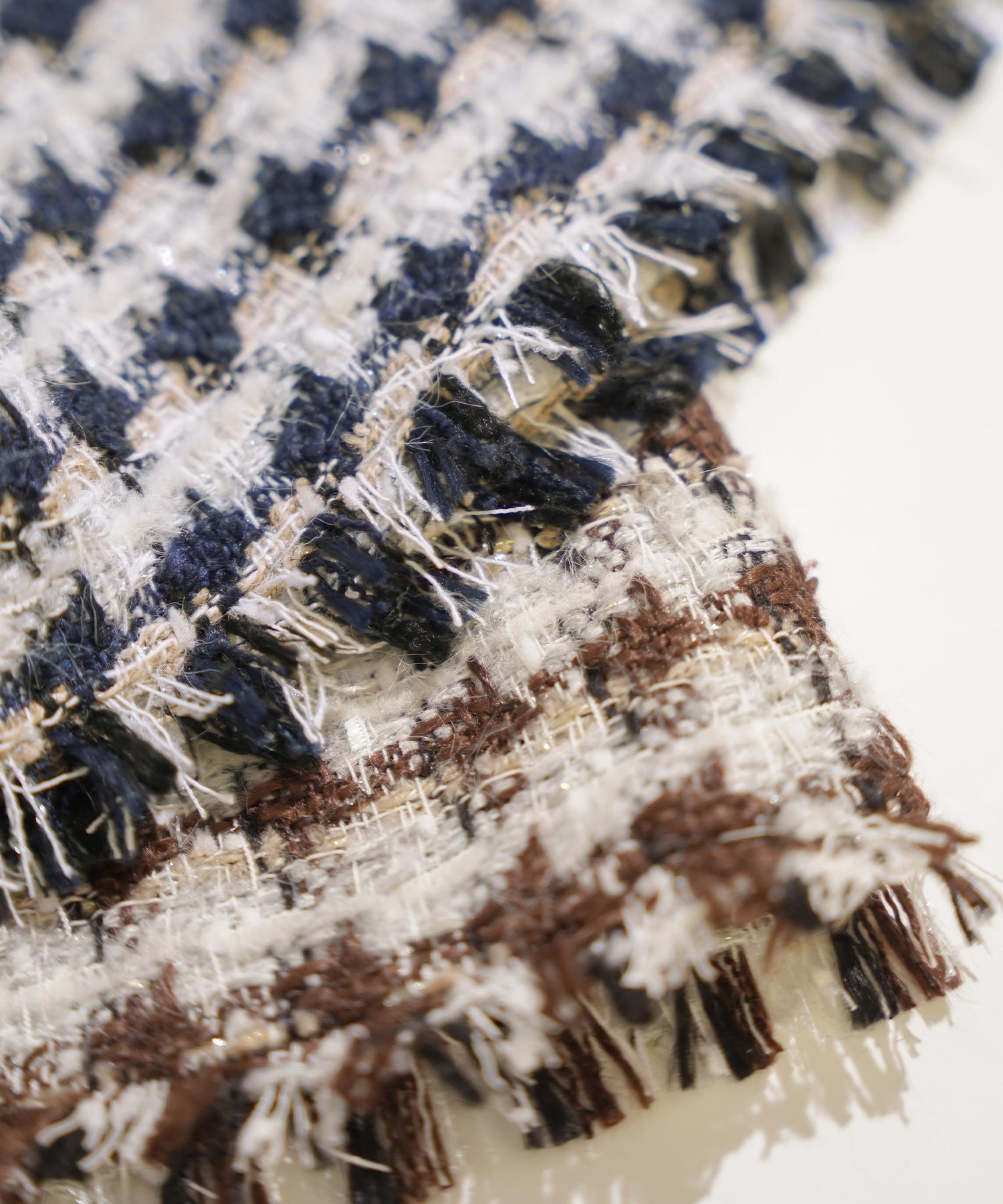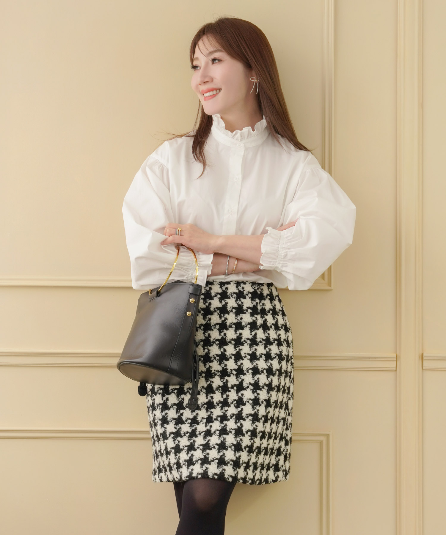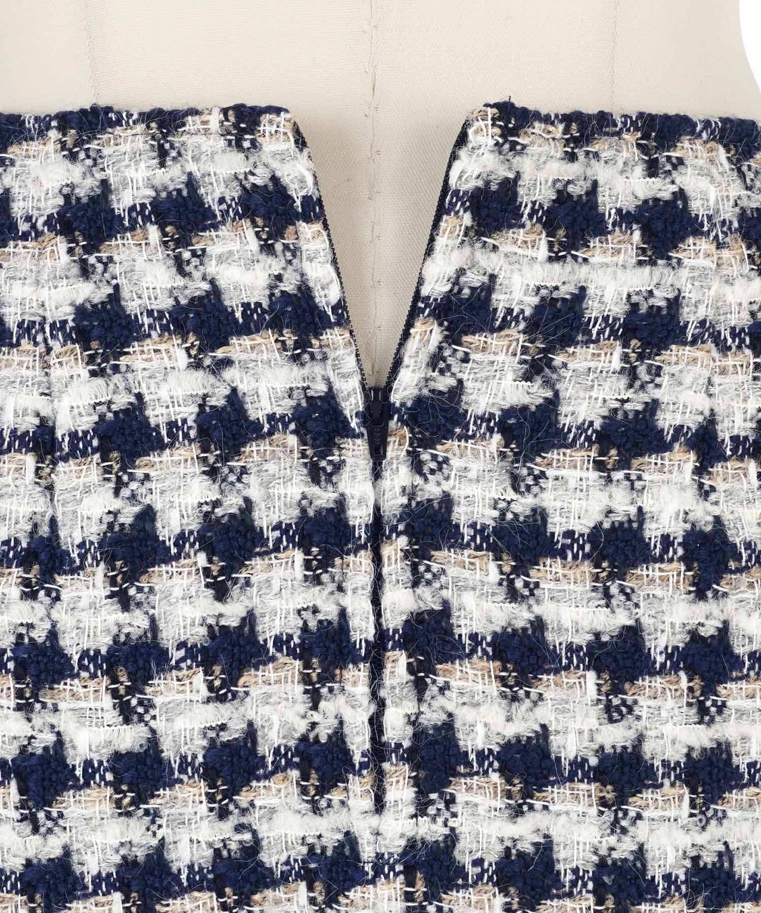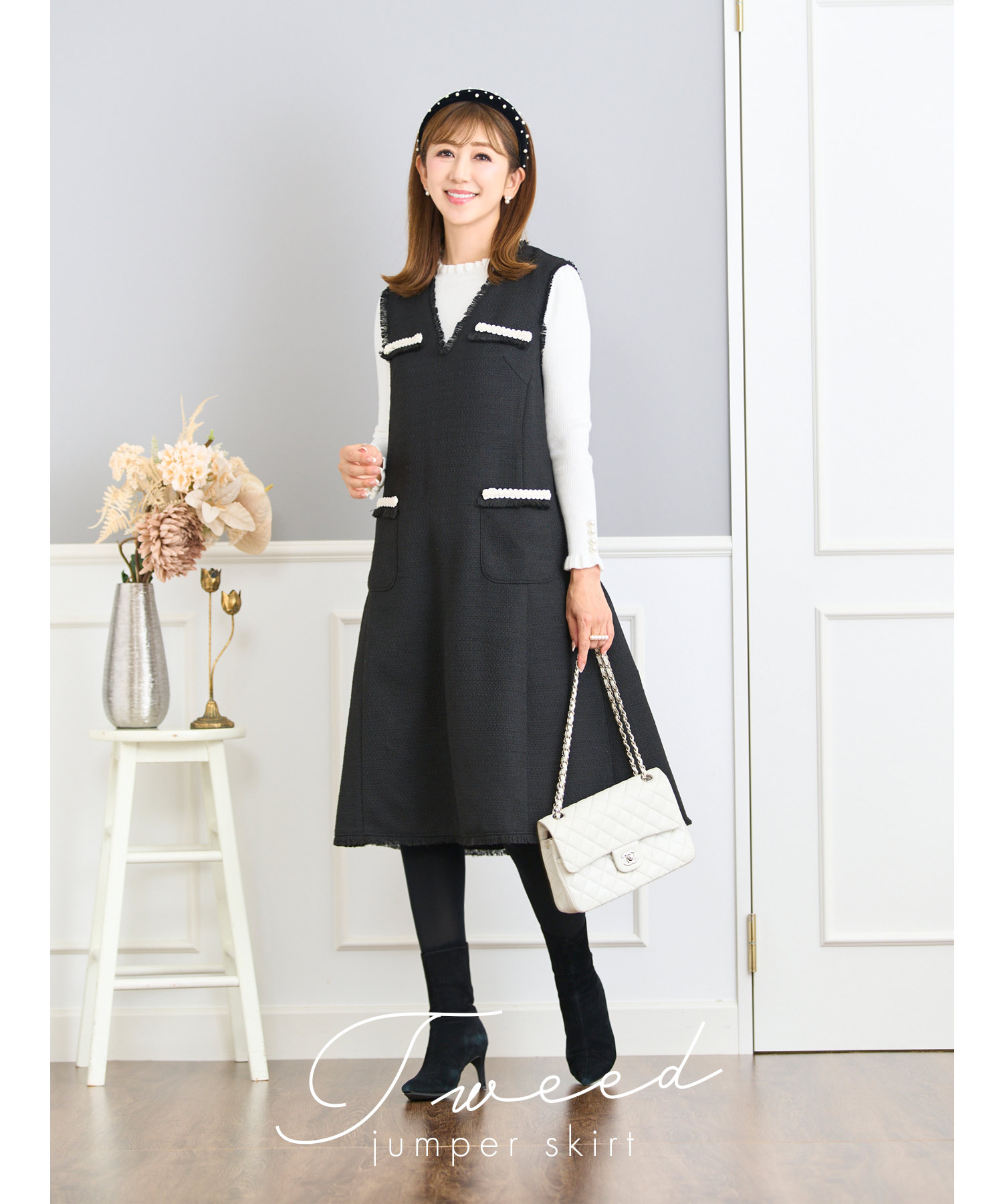 ざっくりとした糸で織り上げたツイードの千鳥柄が、クラブやバーのライトに映える華やかな一枚。裾のフリンジが揺れて、動くたびに表情が生まれます。程よく広がる台形シルエットが太ももまわりをさりげなくカバーしてくれるので、ミニ丈でも大人っぽく着こなせ、ロングブーツ合わせの忘年会コーデにぴったり。