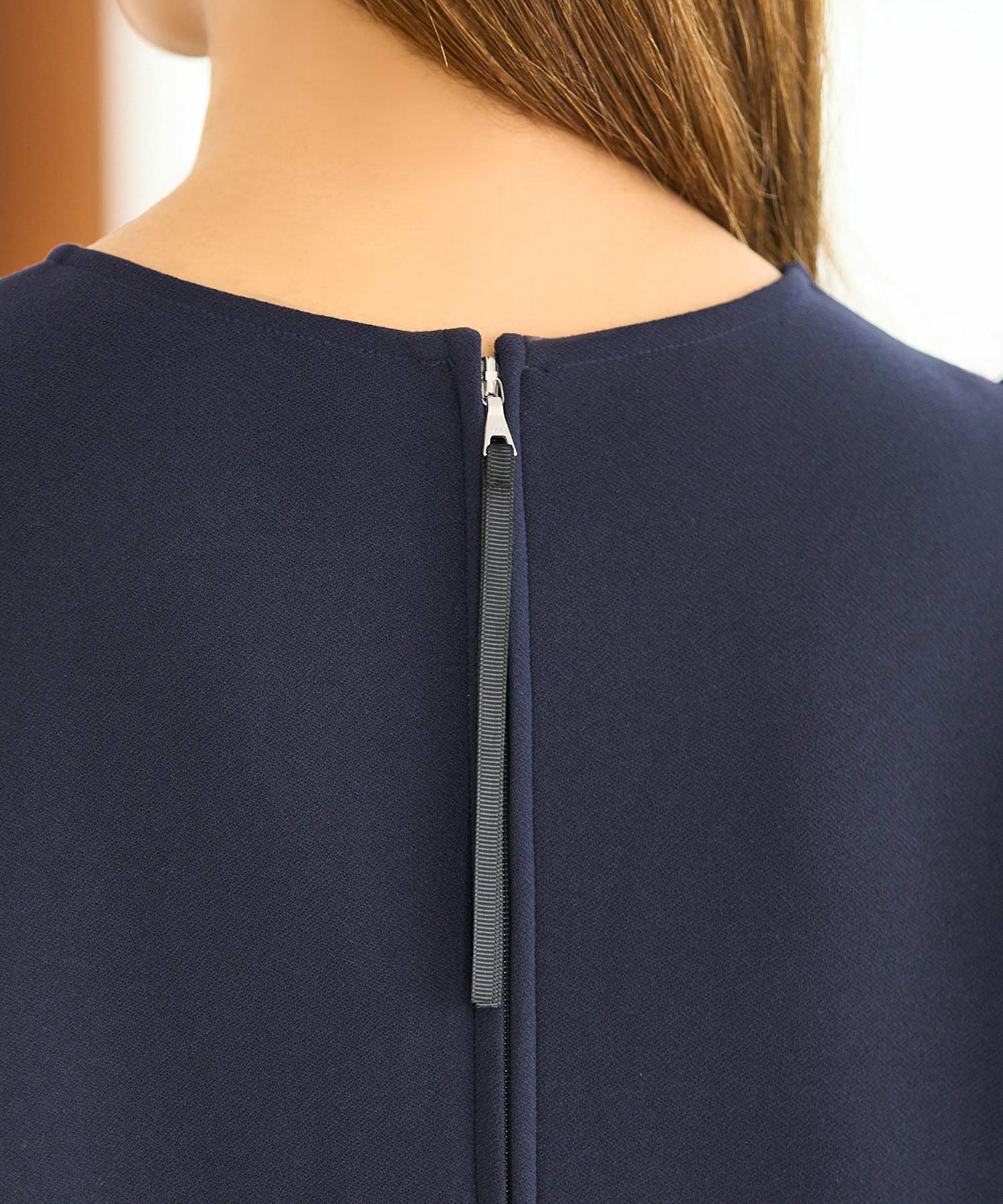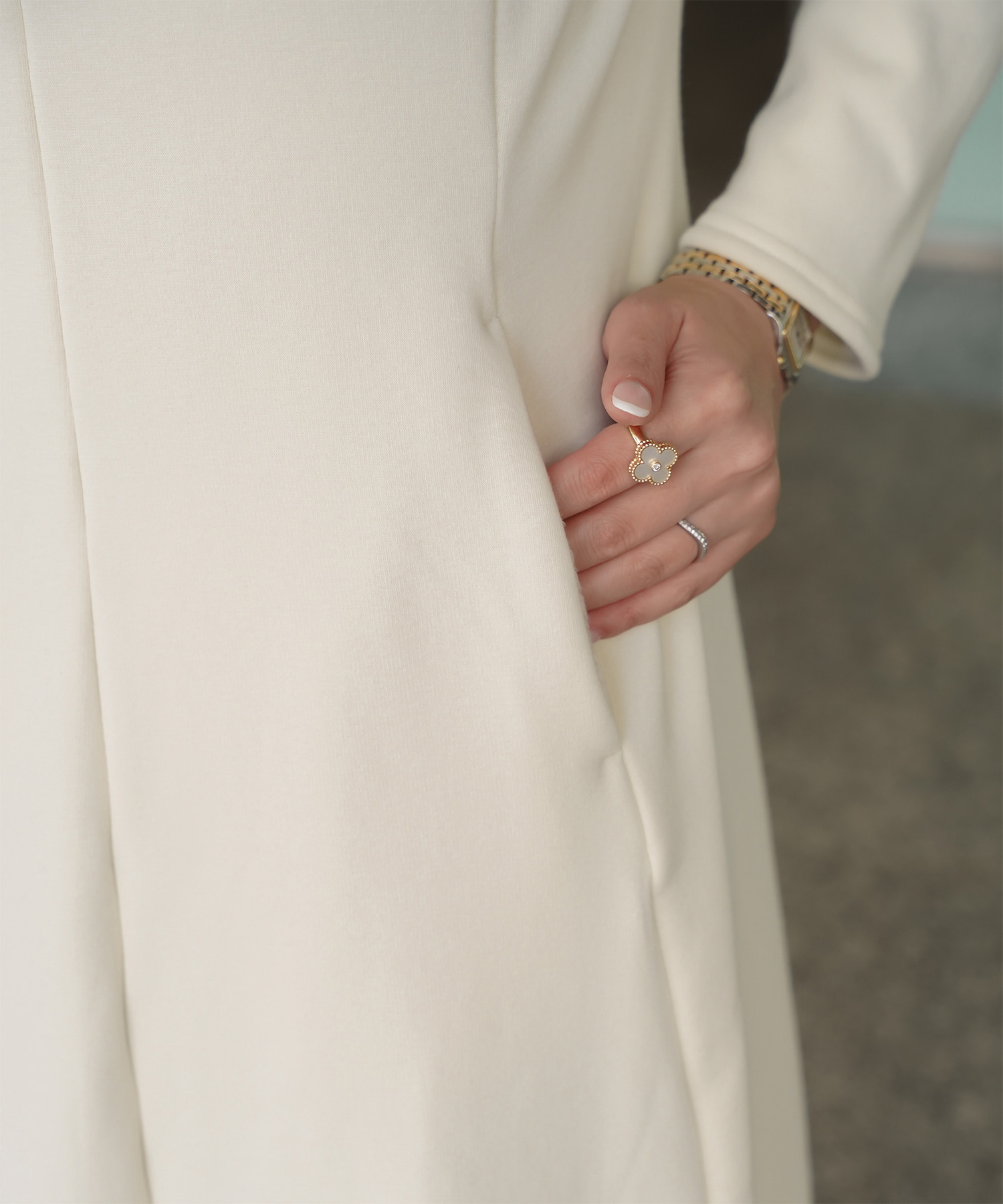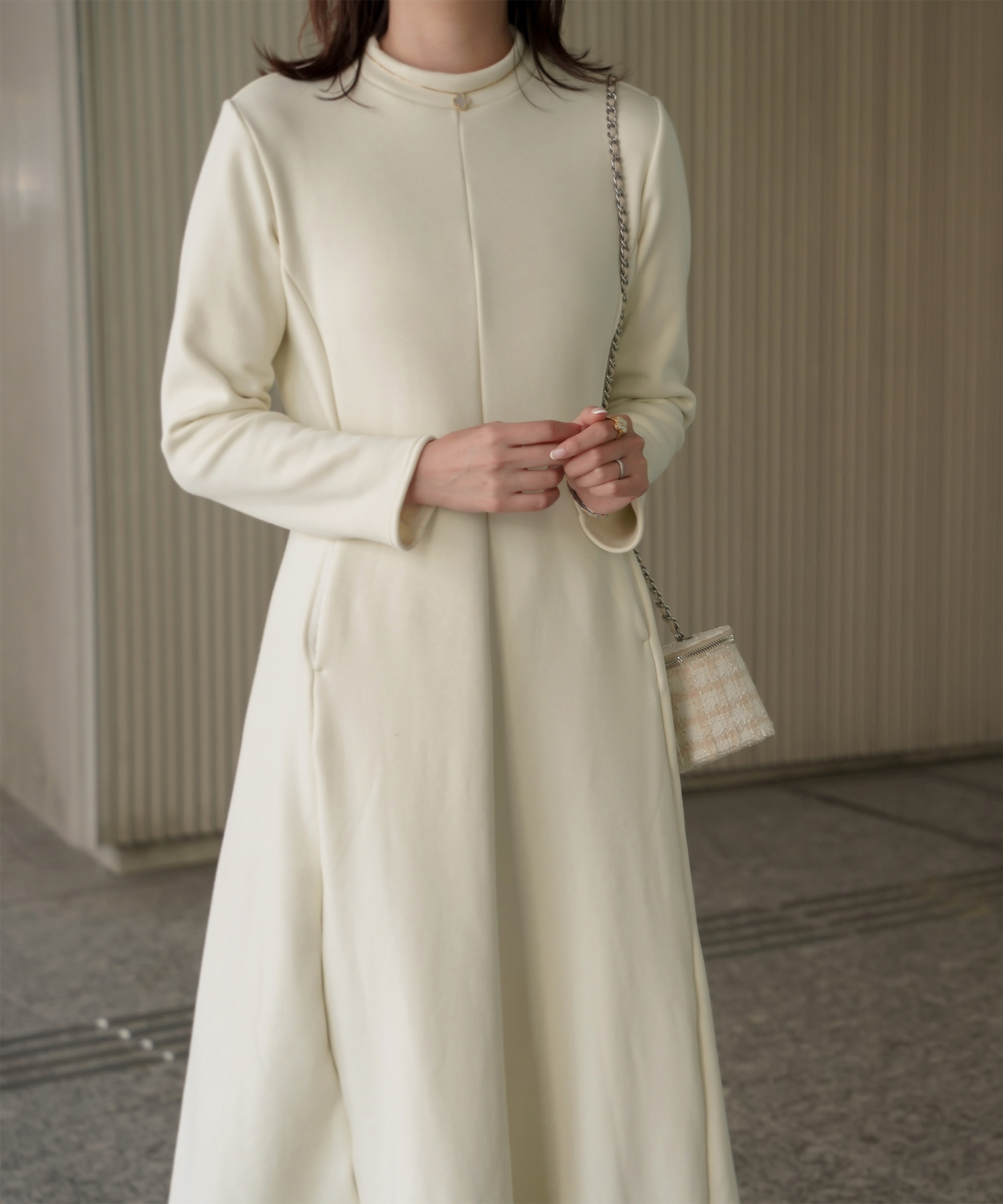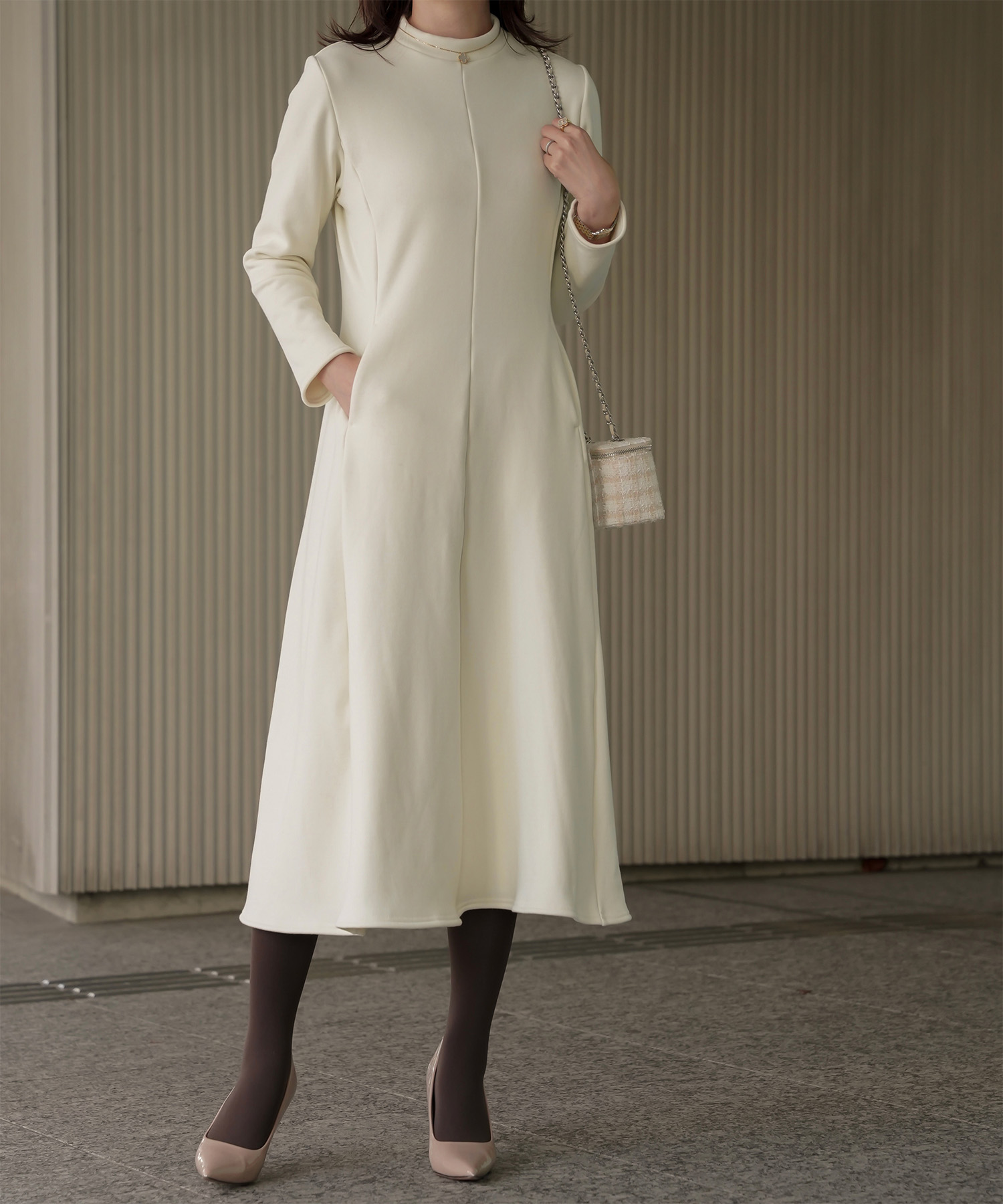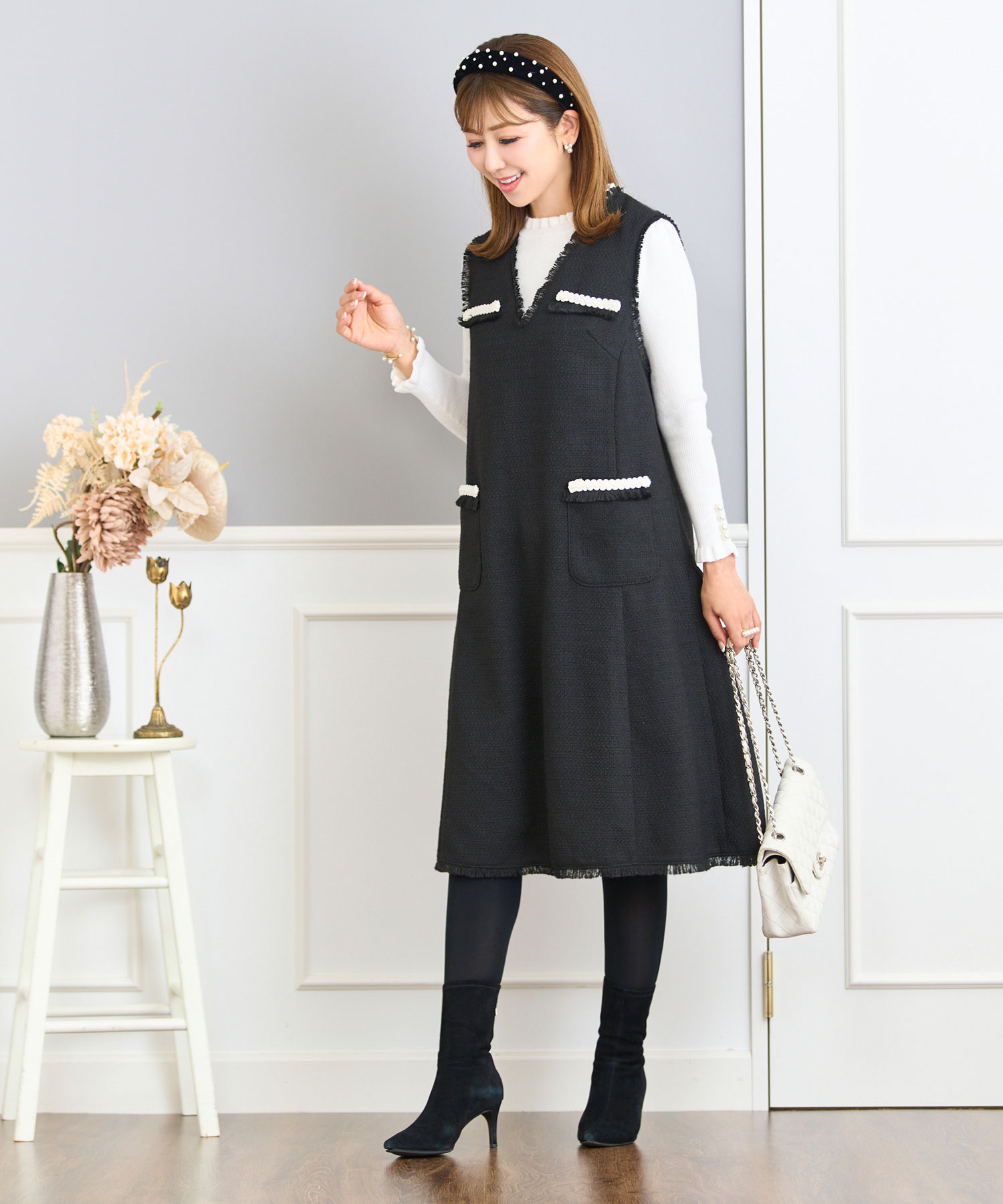イタリアンやフレンチなどレストランで過ごす忘年会には、着るだけで程よく華やかさが出るツイードワンピースがおすすめ。トップス部分はストレッチ性のあるカットジョーゼットで、長時間座っていても肩まわりが動かしやすく、スカート部分はミックスツイードをバイアス使いにして縦のラインを強調し、すっきりとしたシルエットに見せてくれます。異素材のコンビでも同系色でまとめているので派手になりすぎず、きちんと感とエレガントさを両立。ベージュトーンなら柔らかな印象で、レストランのあたたかな雰囲気になじむ大人のきれいめコーデが完成します。