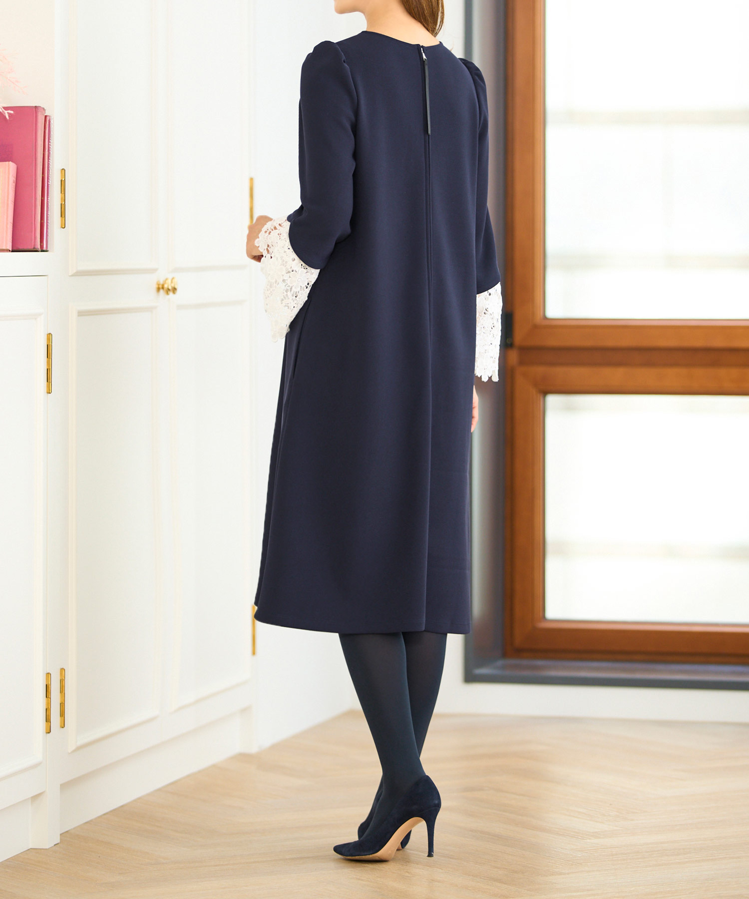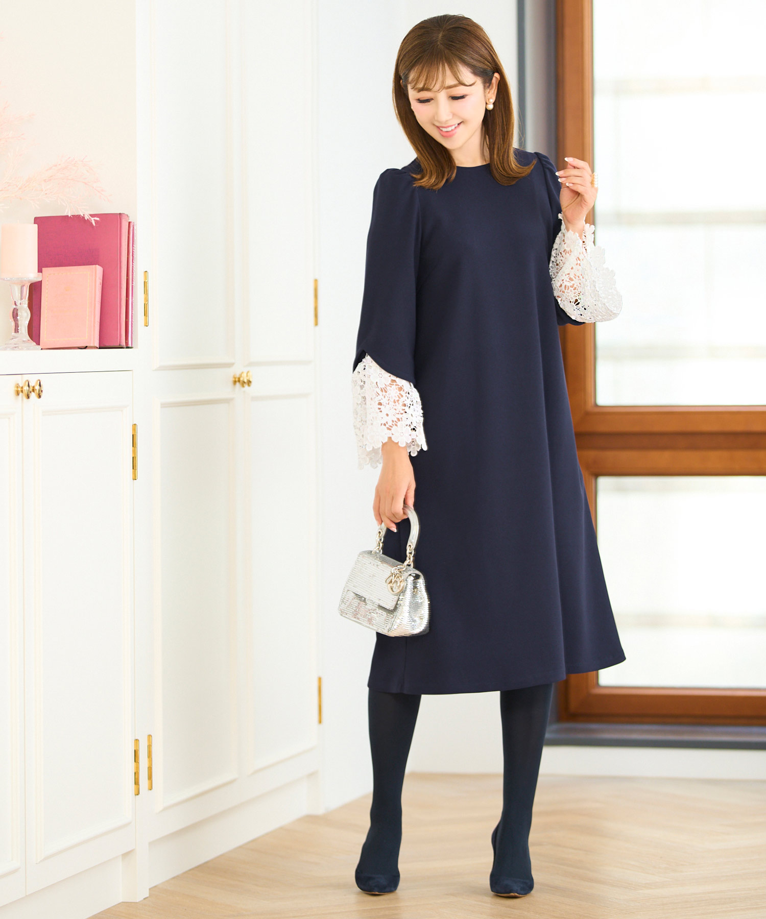 和の雰囲気が漂う料亭や落ち着いた和食店では、色使いとシルエットで控えめな上品さを意識するのが安心です。深みのあるネイビーのワンピースは、和の空間に自然になじみながらも、きちんとした印象を与えてくれます。袖口にレースやさりげないディテールがあしらわれたデザインなら、座っている時間が長くても手元に華やかさが宿り、地味に見えません。アクセサリーは小ぶりのピアスや華奢なネックレスなど、主張しすぎないものを選ぶと上品さが引き立ちます。足元は黒やネイビーのタイツにシンプルなパンプスを合わせ、全体のトーンをそろえると、落ち着いた大人の和食コーデが完成します。