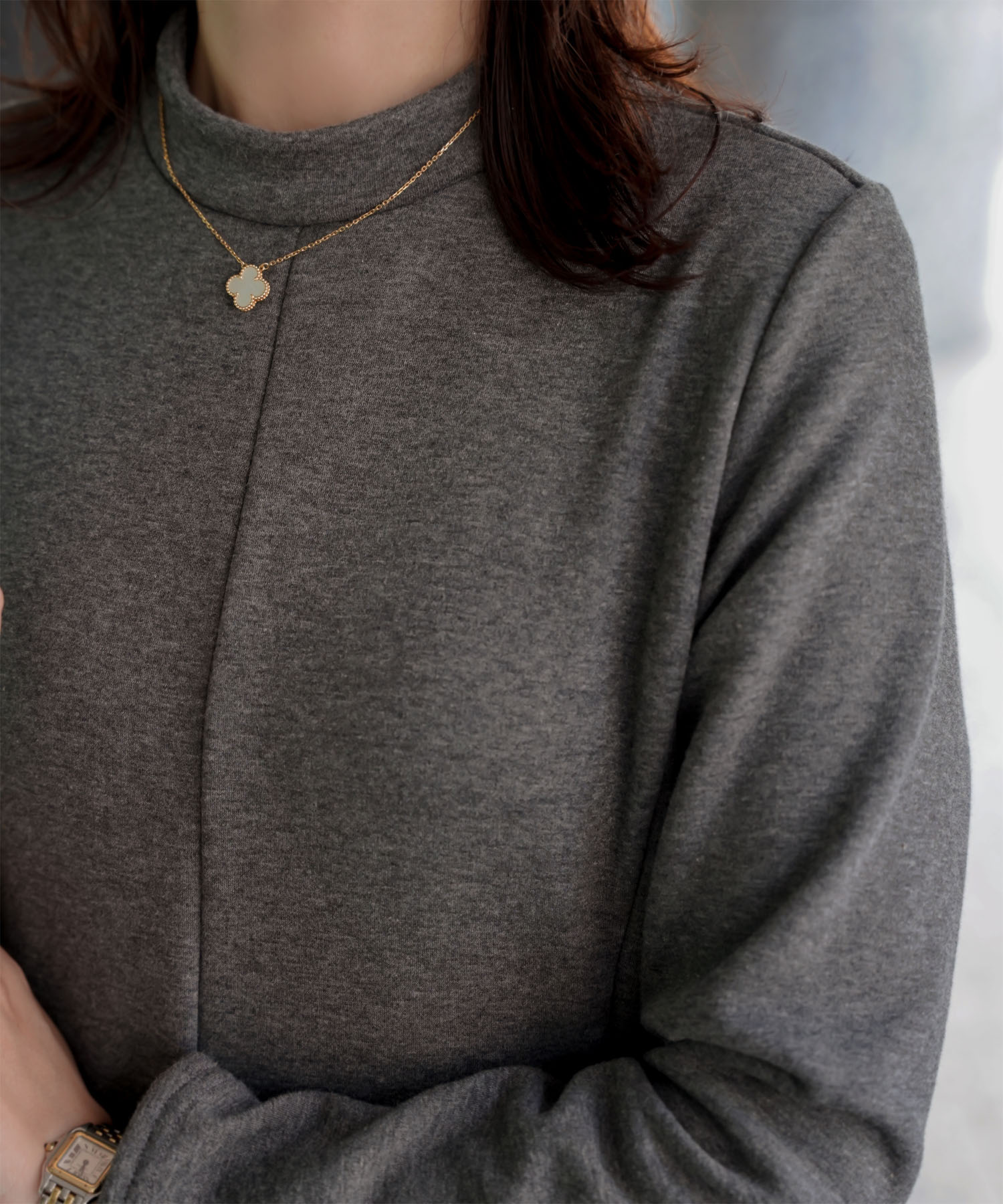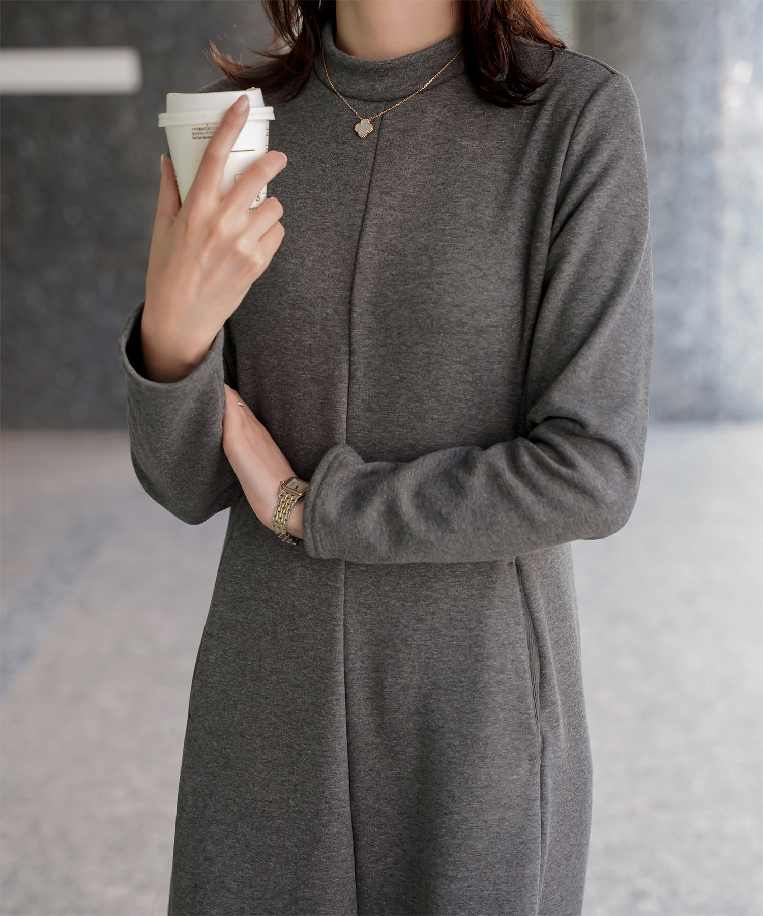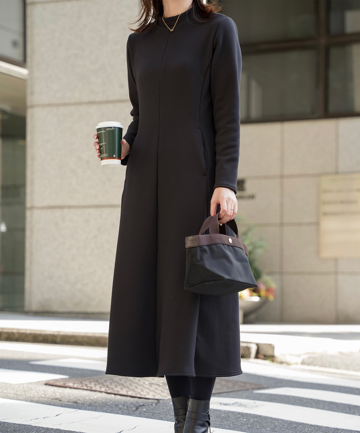 ボンバーヒート素材を使ったワンピースは、まさに「着る毛布」感覚で楽しめる一枚。裏起毛のぬくもりがしっかりありつつ、Aラインシルエットで全身をすっきり見せてくれます。ややスタンド気味の襟元が首まわりを優しく包み、カットソー素材でもきちんと見えが叶うデザイン。両サイドのポケットも実用的で、寒い日の居酒屋忘年会でも、あたたかくリラックスして過ごしたい方におすすめです。