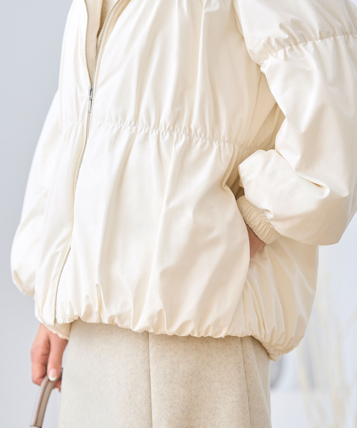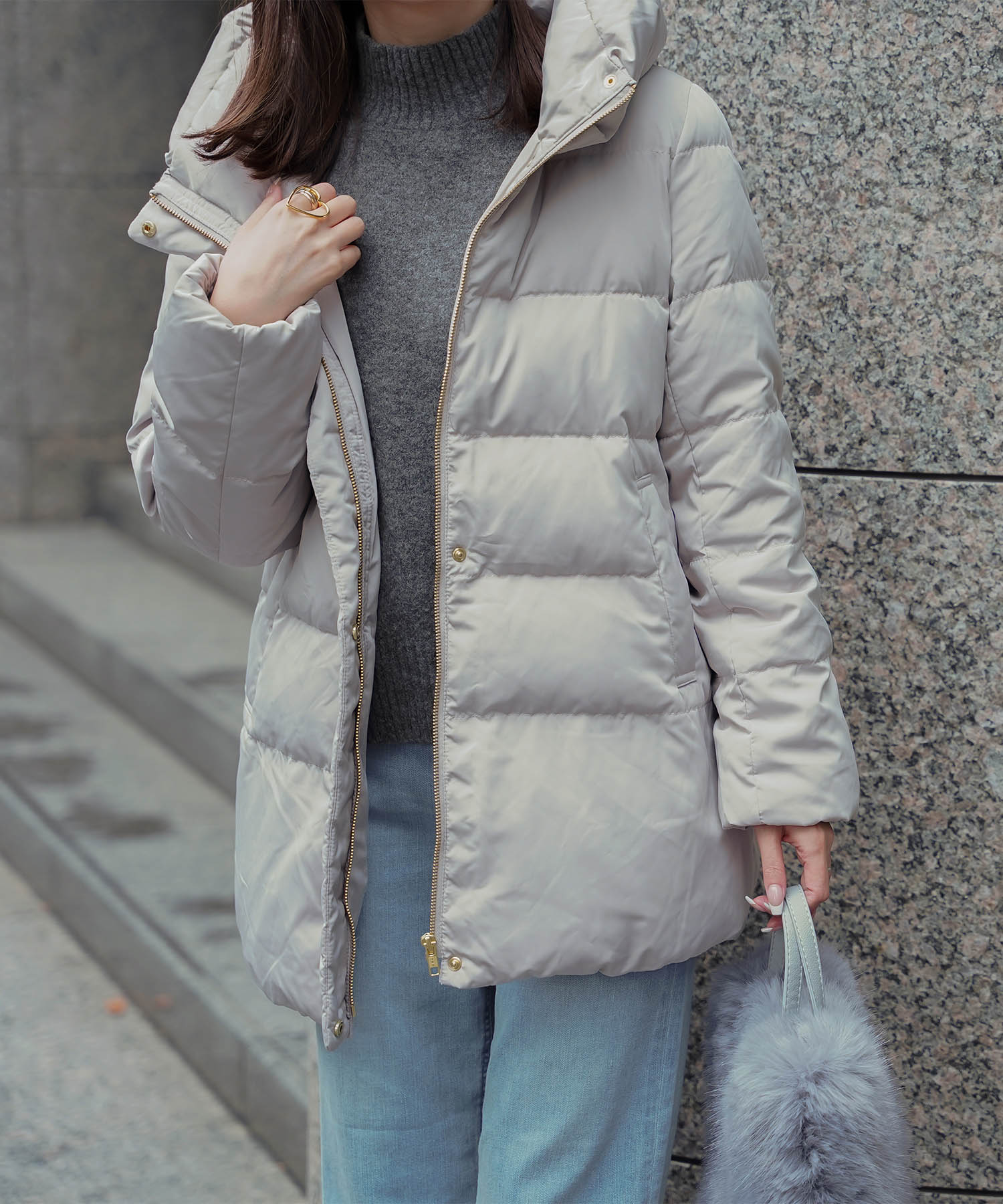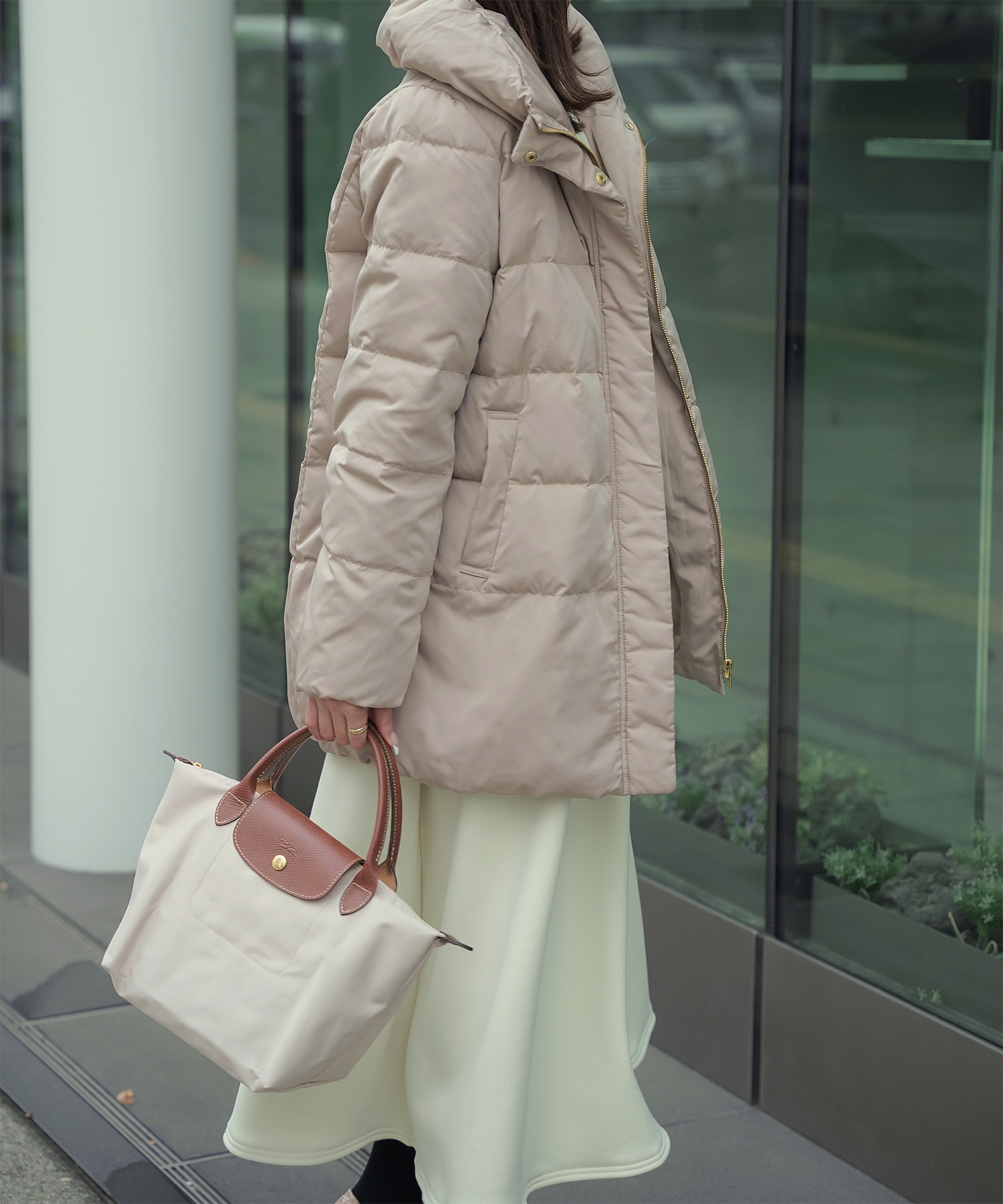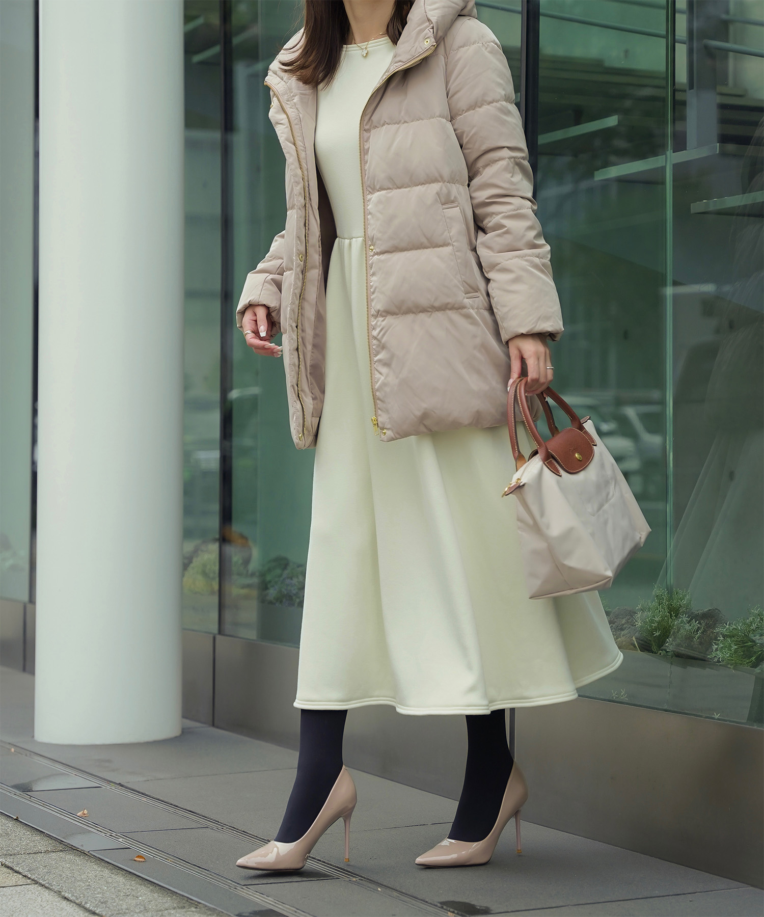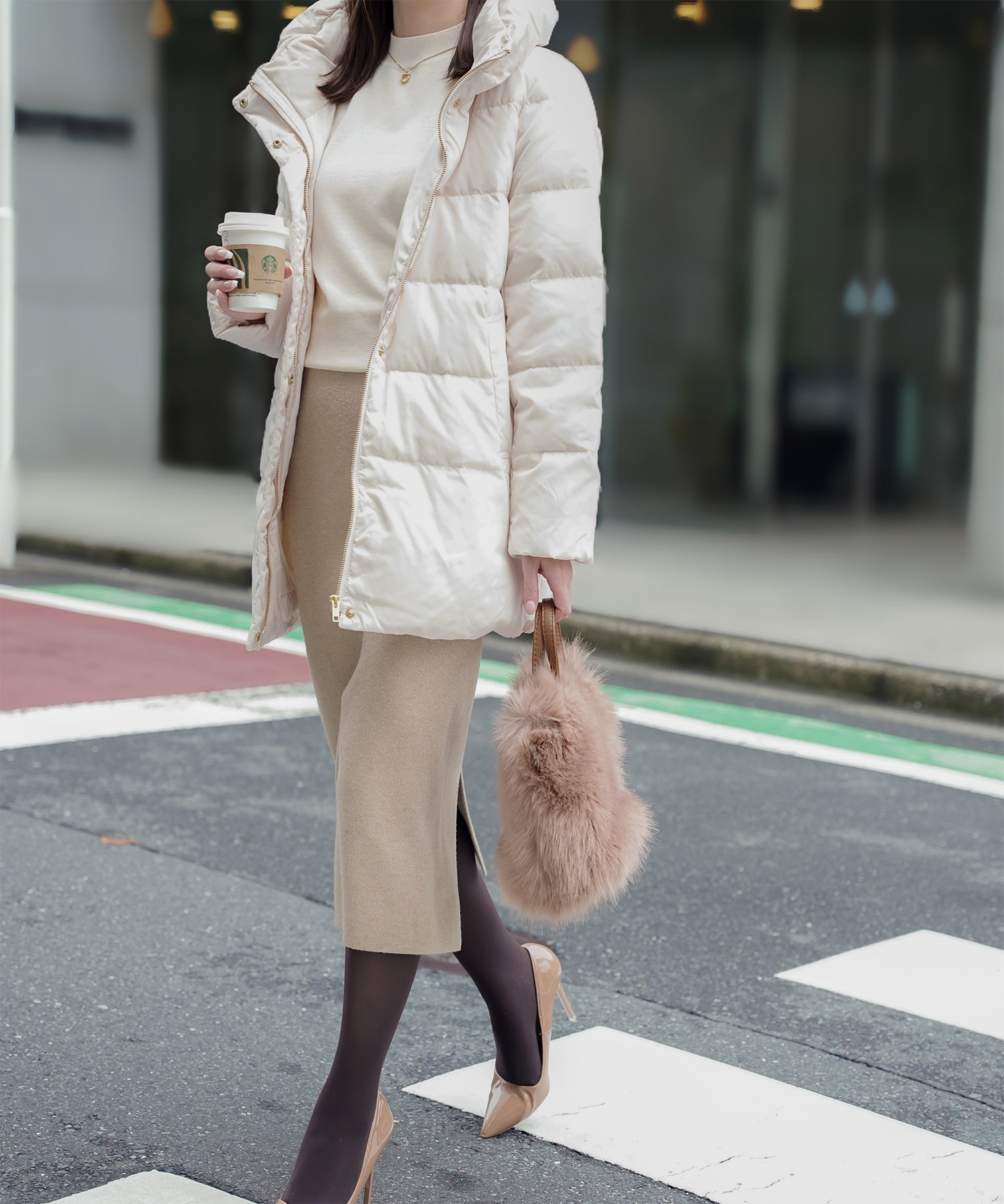 優しいニュアンスカラーのベージュは、大人女子の冬コーデに欠かせない鉄板カラー。ほんのり起毛感があり、ピーチスキンのしっとりとした肌触りと柔らかな表面感が、大人女子のコーディネートにぴったりマッチします。フェザー入りで本格的に暖かく、軽量なので、寒い季節でも快適に過ごせます。お尻をすっぽり隠す着丈が、暖かさをしっかりと保証。アイボリーのワンピースと合わせて、柔和な色合いのカラーコーディネートを楽しんで。