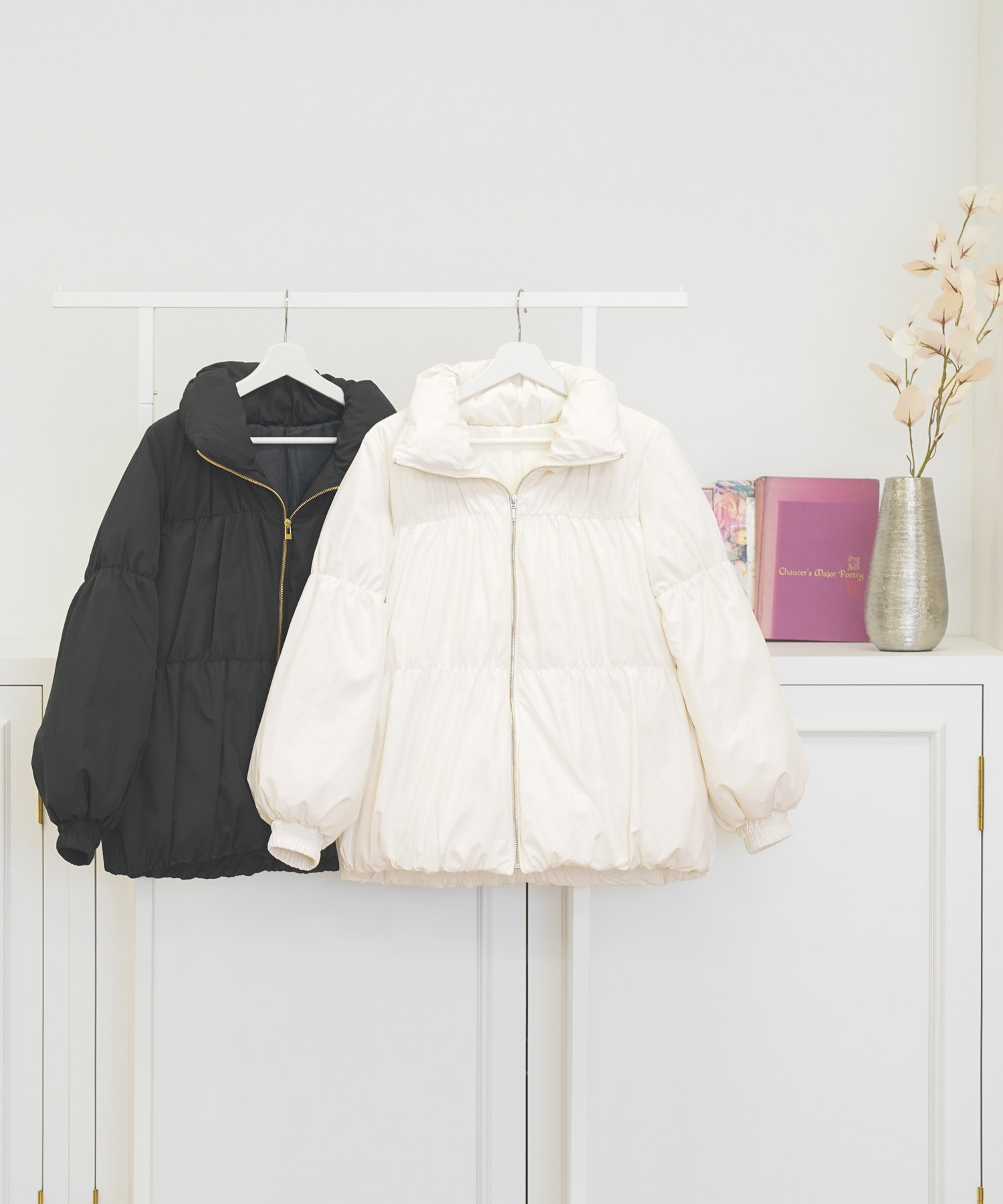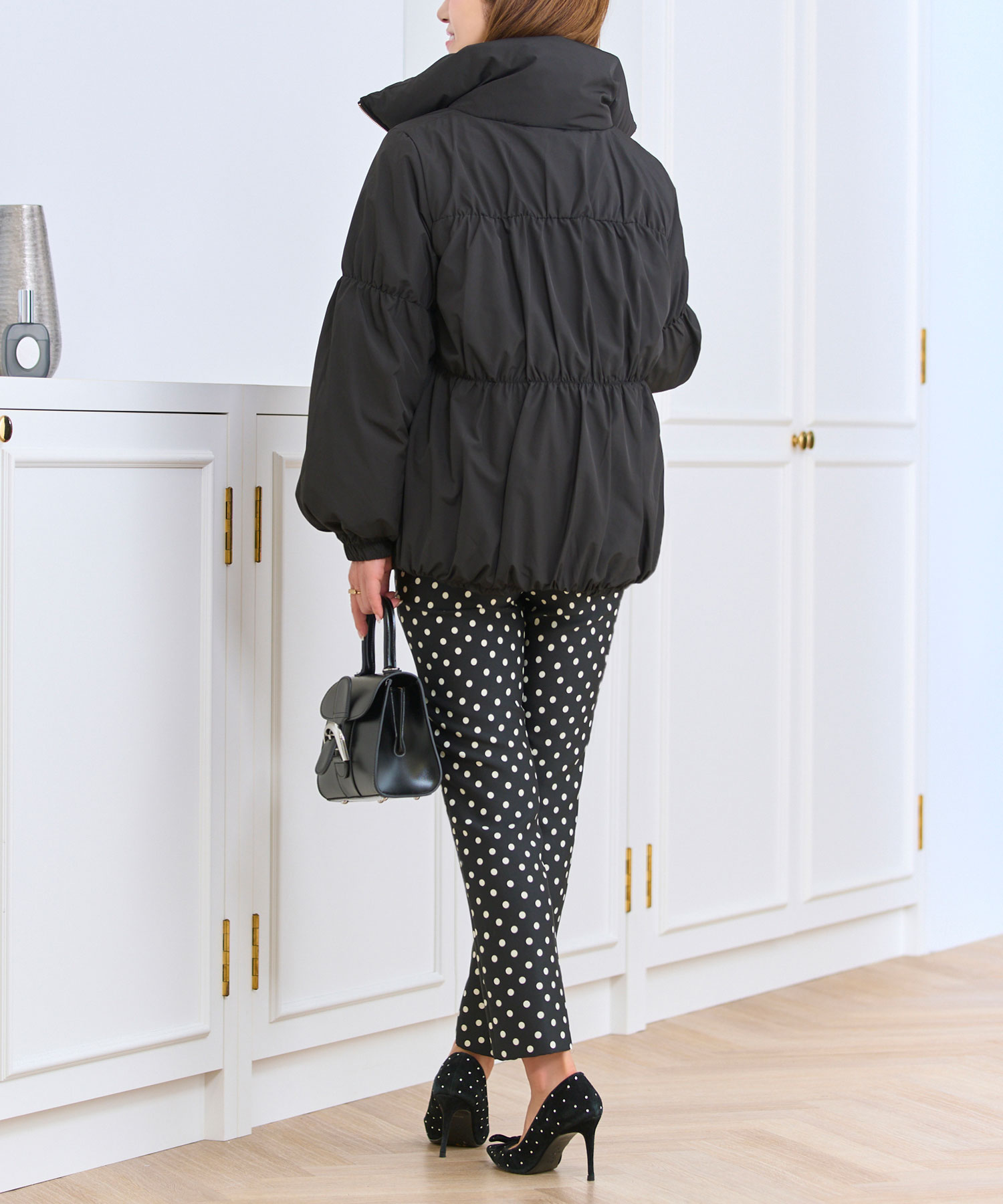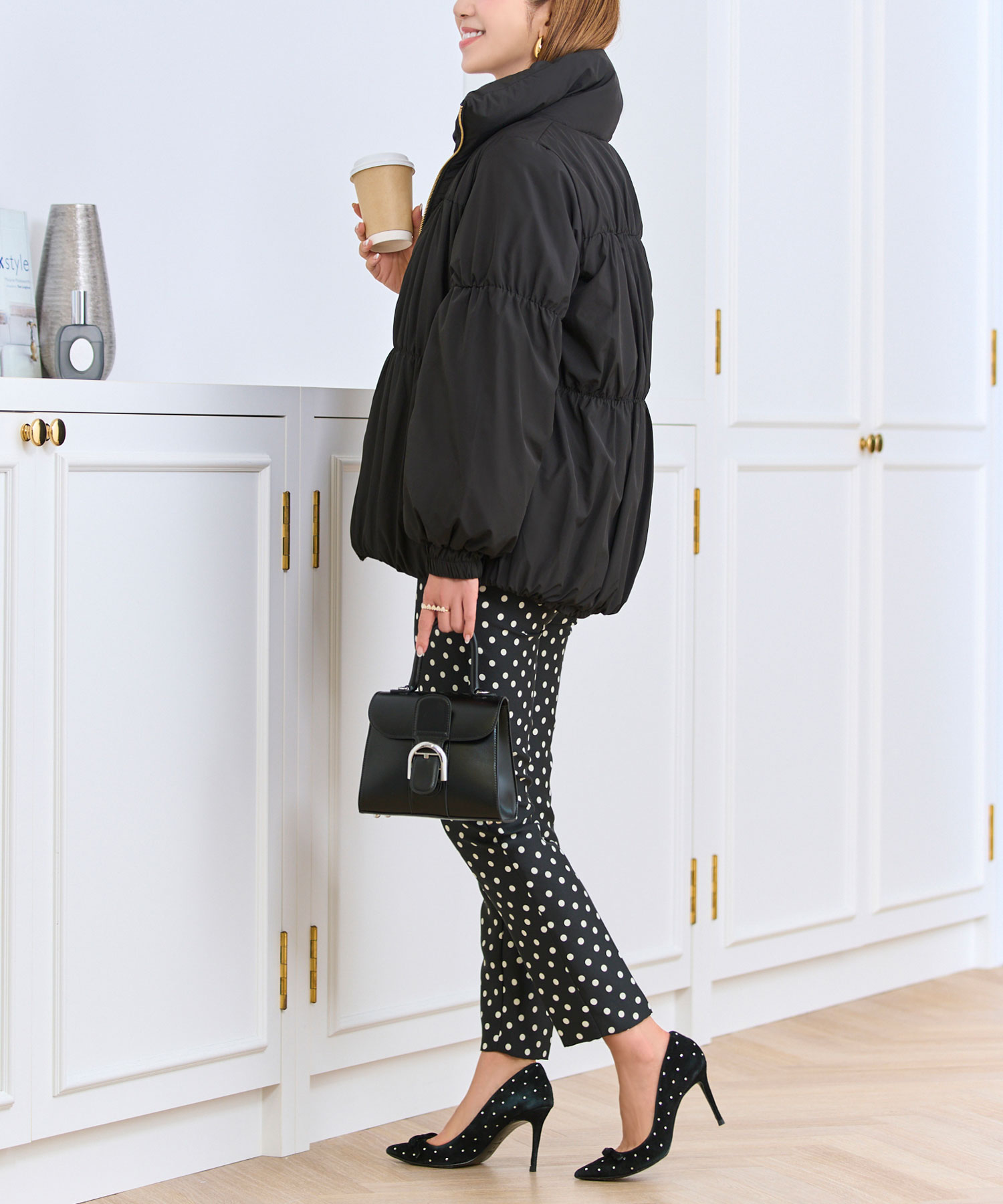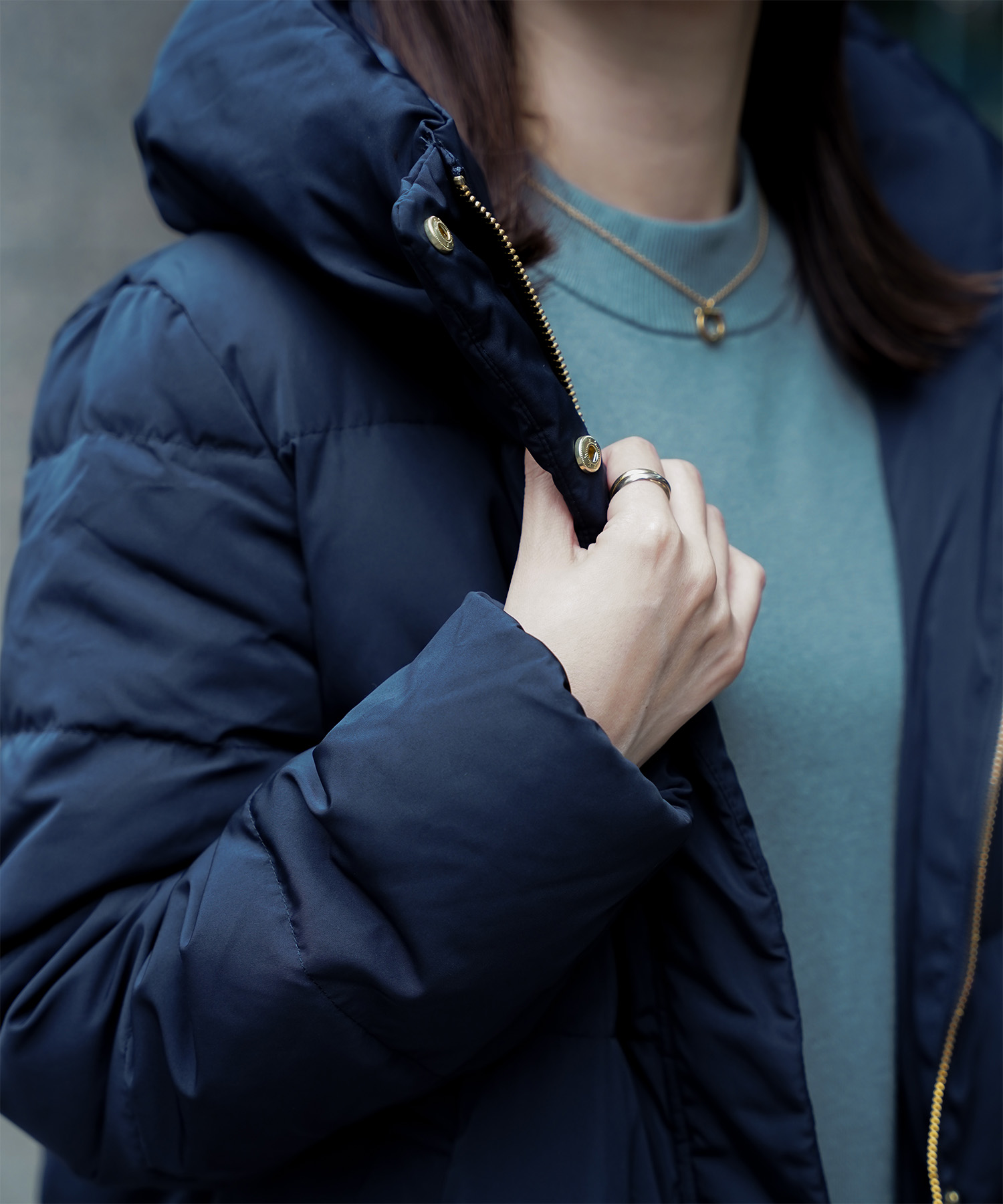 襟元にボリュームを持たせつつ、すっきりとしたスリムシルエットが叶うダウンコート。軽くて暖かく、着膨れしがちなダウンが苦手な女性にもおすすめの一枚です。細やかなギャザーがアクセントとなり、シンプルながらも華やかさを演出。通勤から休日のお出かけまで、毎日の冬コーデに取り入れたくなる万能アウターです。