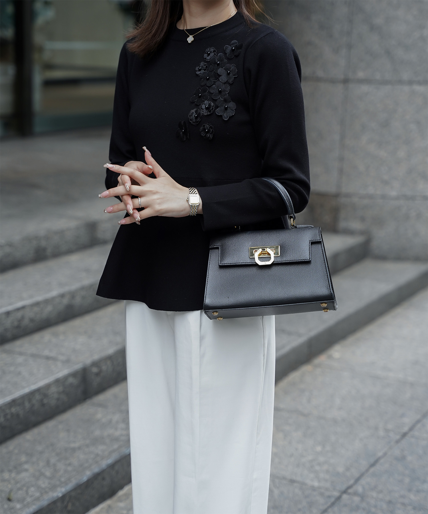 重くなりがちな冬のアウターコーデに軽やかさと可憐さをプラスするフラワーモチーフデザイン。アシンメトリーに配置されたモチーフには小粒のパールが散りばめられ、控えめながらも上品な輝きを演出します。華やかすぎずデイリーコーデにも馴染む絶妙なデザインがポイント。忘年会や新年の挨拶など、特別な冬のシーンにも活躍する一着です。冬のレディースコーデをワンランク上に引き上げる、洗練されたアイテムです。
