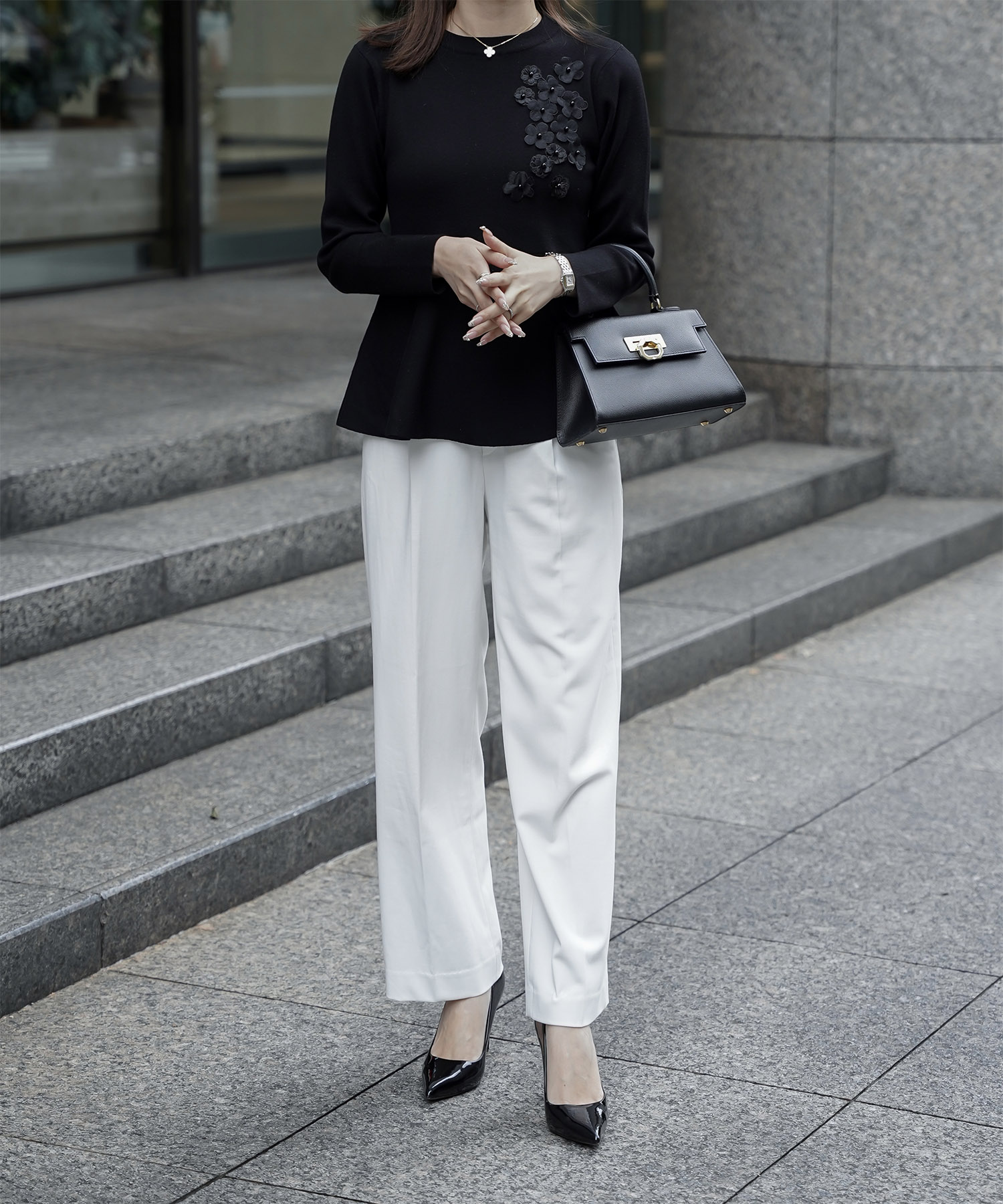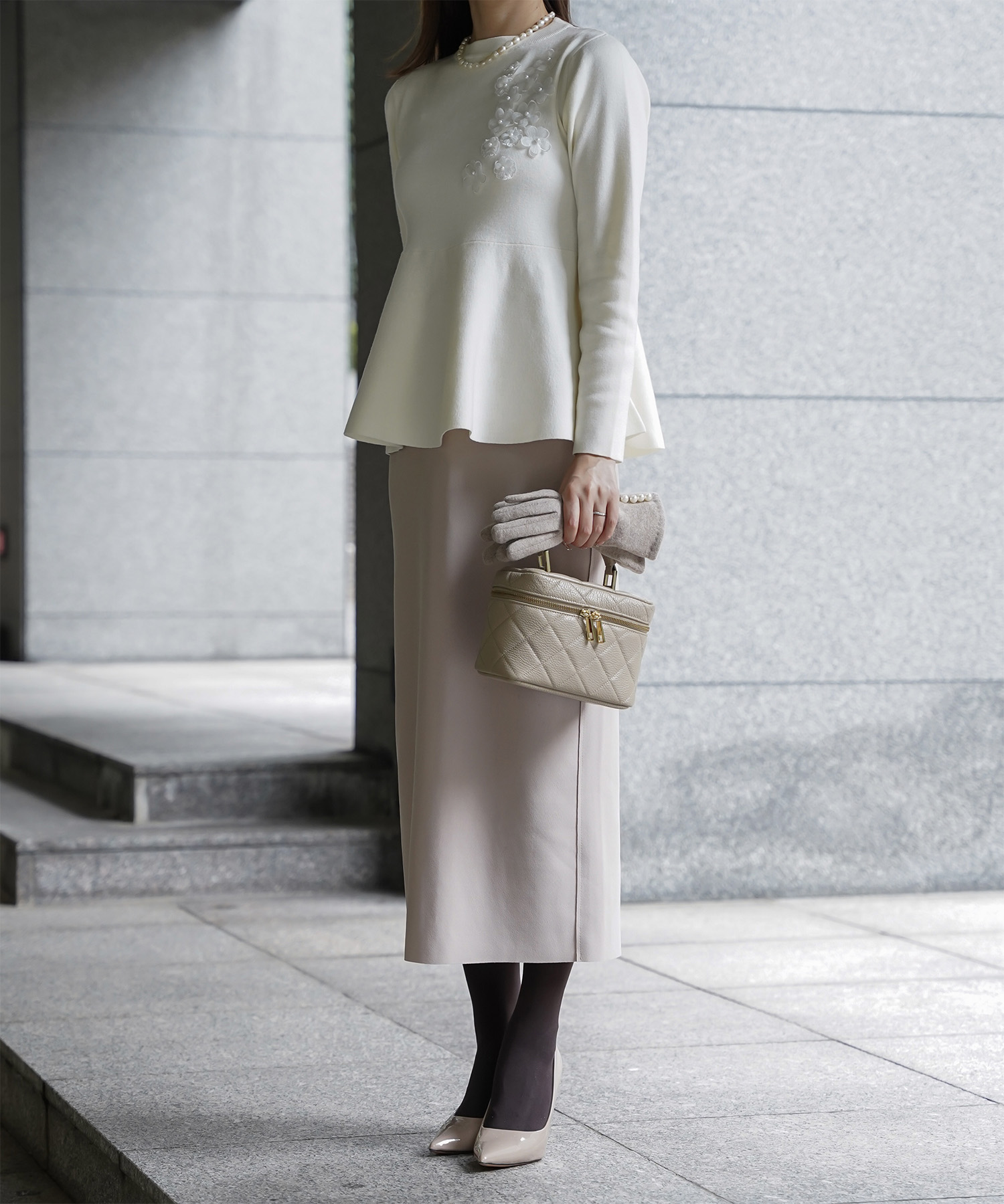 華やかなフラワーモチーフがポイントの、冬のおしゃれをワンランクアップさせてくれるニット。アイボリーのニット×淡いベージュのタイトスカートを組み合わせれば、ホワイトからベージュの優しいグラデーションが完成。冬らしいニュアンスカラーで女性らしさを引き立て、ビュッフェやホテルランチなど、華やかなシーンにもマッチするコーディネートです。