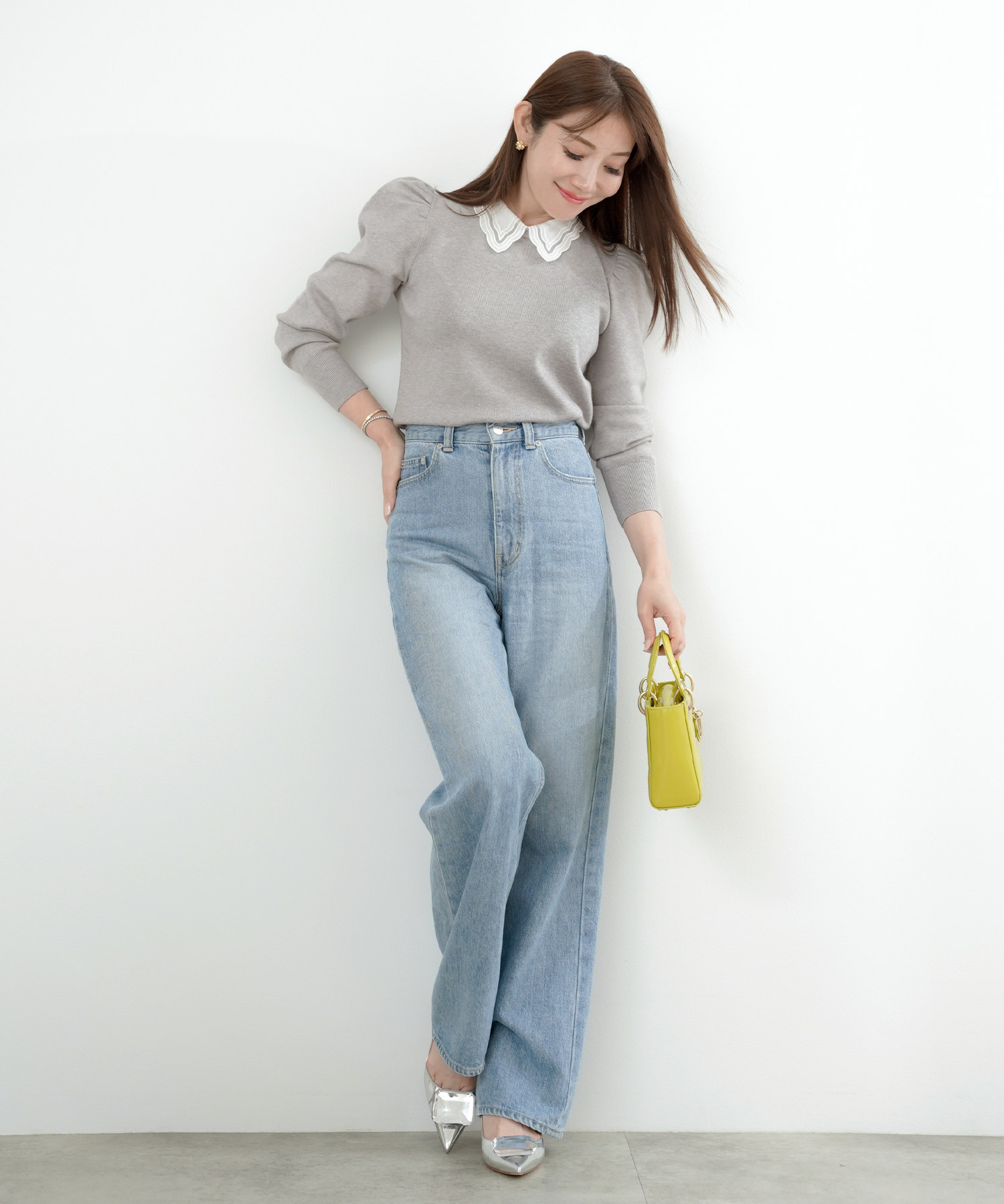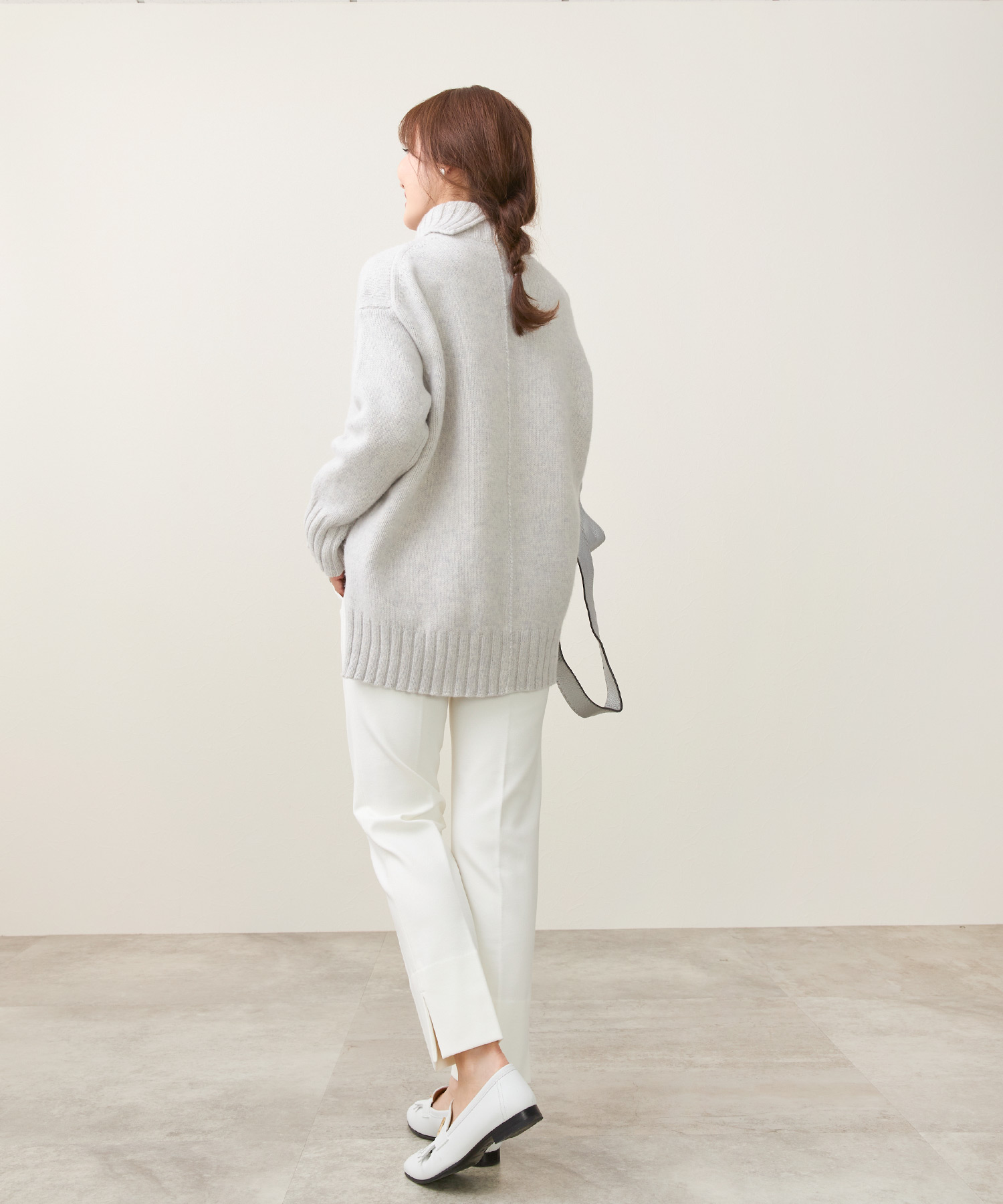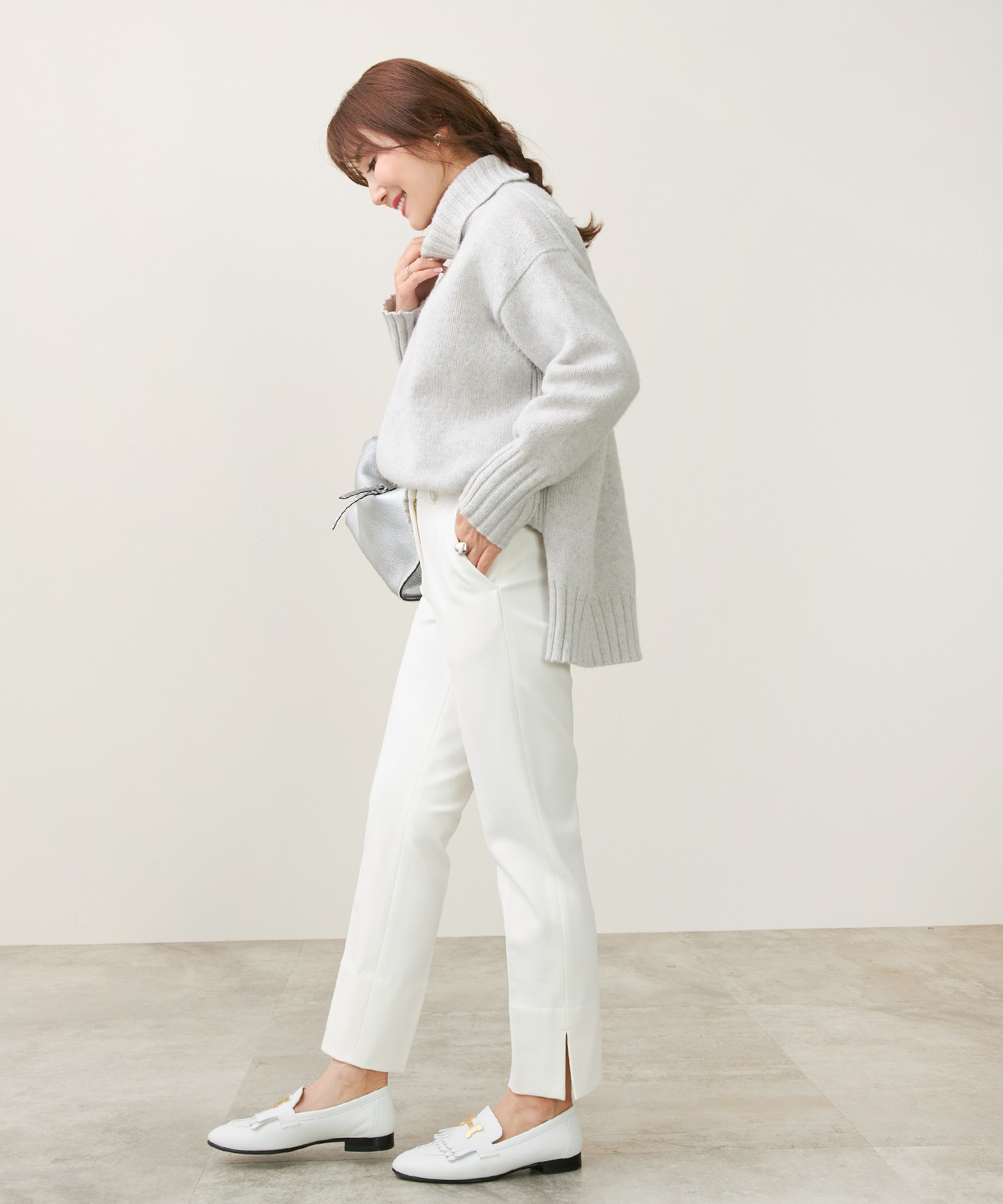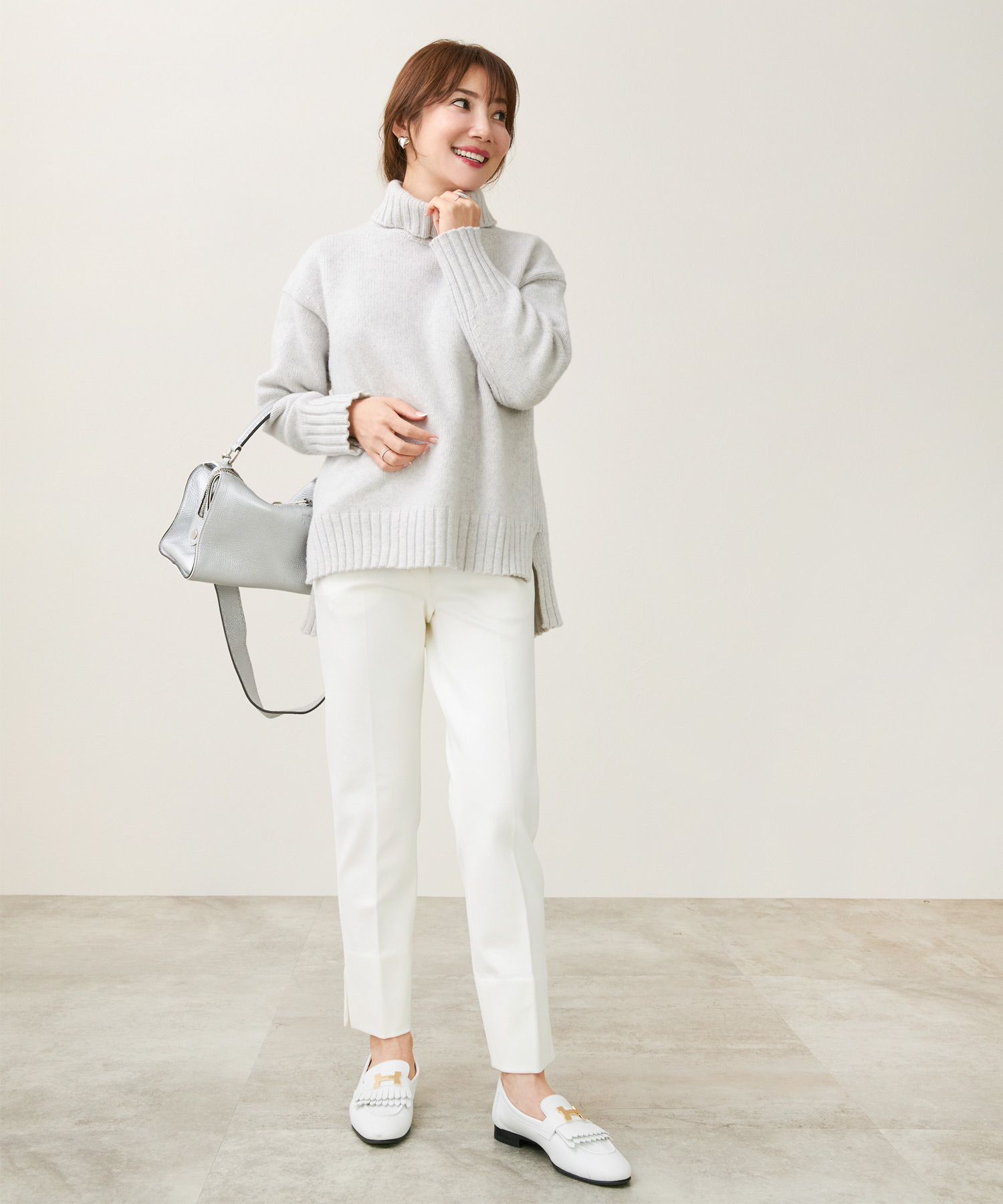 デイリー使いにぴったりのボウタイ付きトップスは、ウール調素材で冬の寒さをしっかり防ぎます。フェミニンなデザインながらグレーなら甘すぎずトライしやすいカラー。軽やかに仕上げるならボトムスにホワイトのパンツ合わせることですっきり感が増し、クリーンで重たくならない冬の装いが楽しめます。