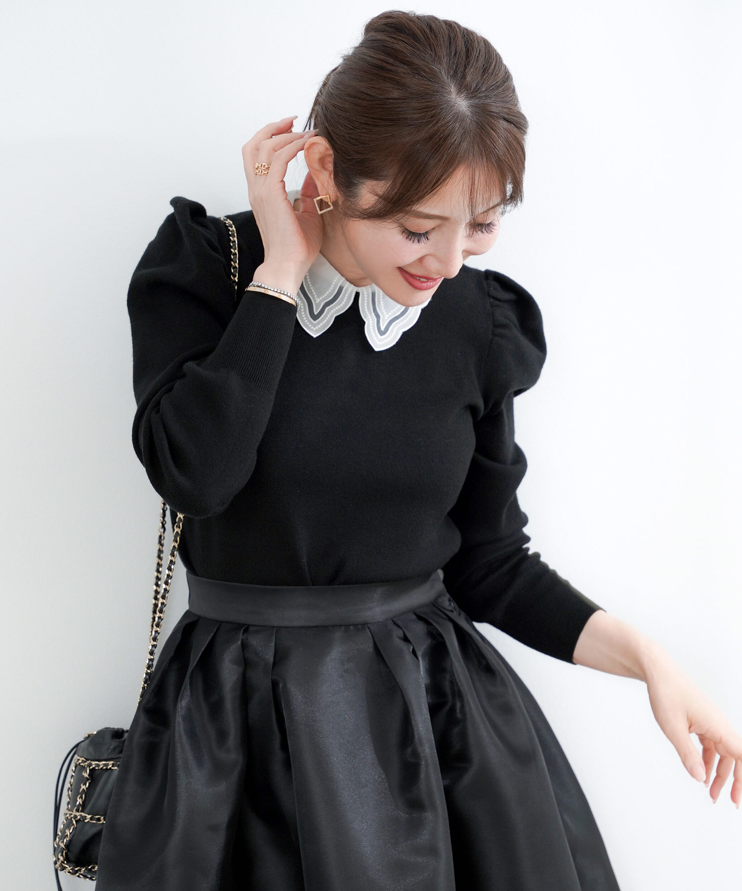 冬のイベントシーズンにぴったりな2wayデザインの黒ニット。オーガンジーレース襟を着脱することで2通りのおしゃれが楽しめます。レース襟を付けたまま、オールブラックで全身をまとめればシックで洗練された雰囲気に。オンオフどちらでも使える万能アイテムで、冬のイベントをおしゃれに乗り切りましょう。