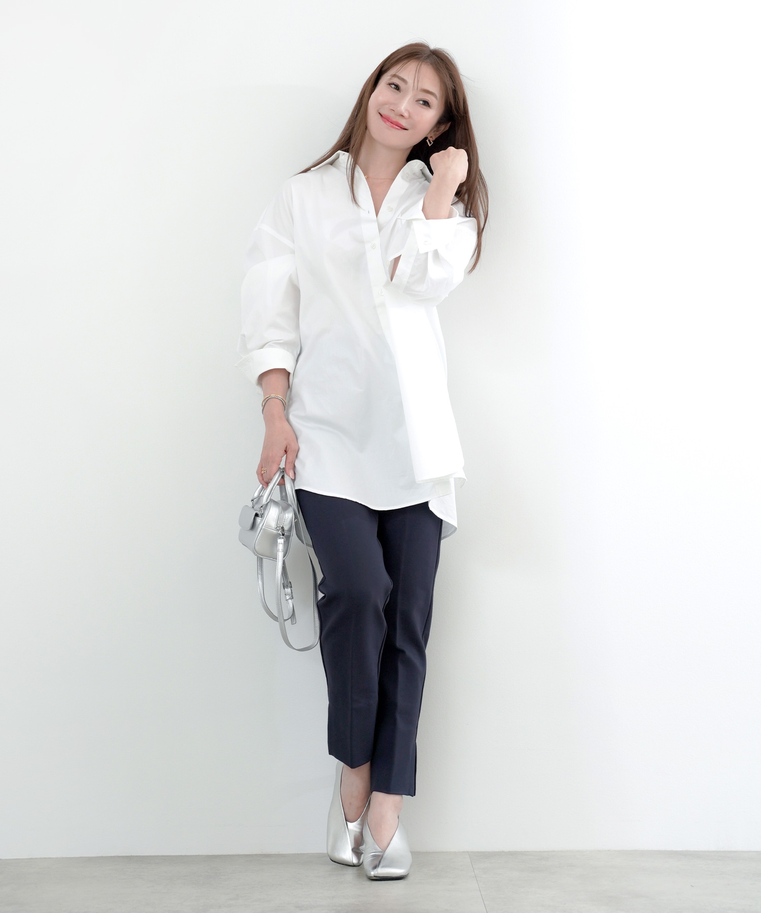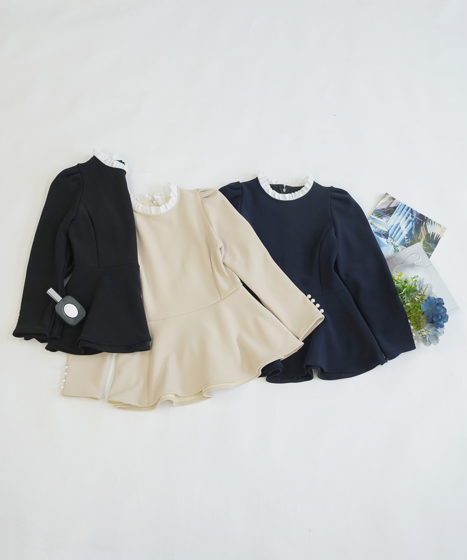 真冬の通勤スタイルにぴったりなあったか裏起毛素材のトップス。冷え込みが厳しい冬でも、温かさをしっかりキープしながらエレガントな印象を与えるデザインです。袖口にはパール、襟ぐりにはフリル襟をあしらい、シンプルながらも女性らしさをプラス。忙しい朝でも簡単にコーディネートが決まり、オフィスシーンで大活躍のアイテムです。