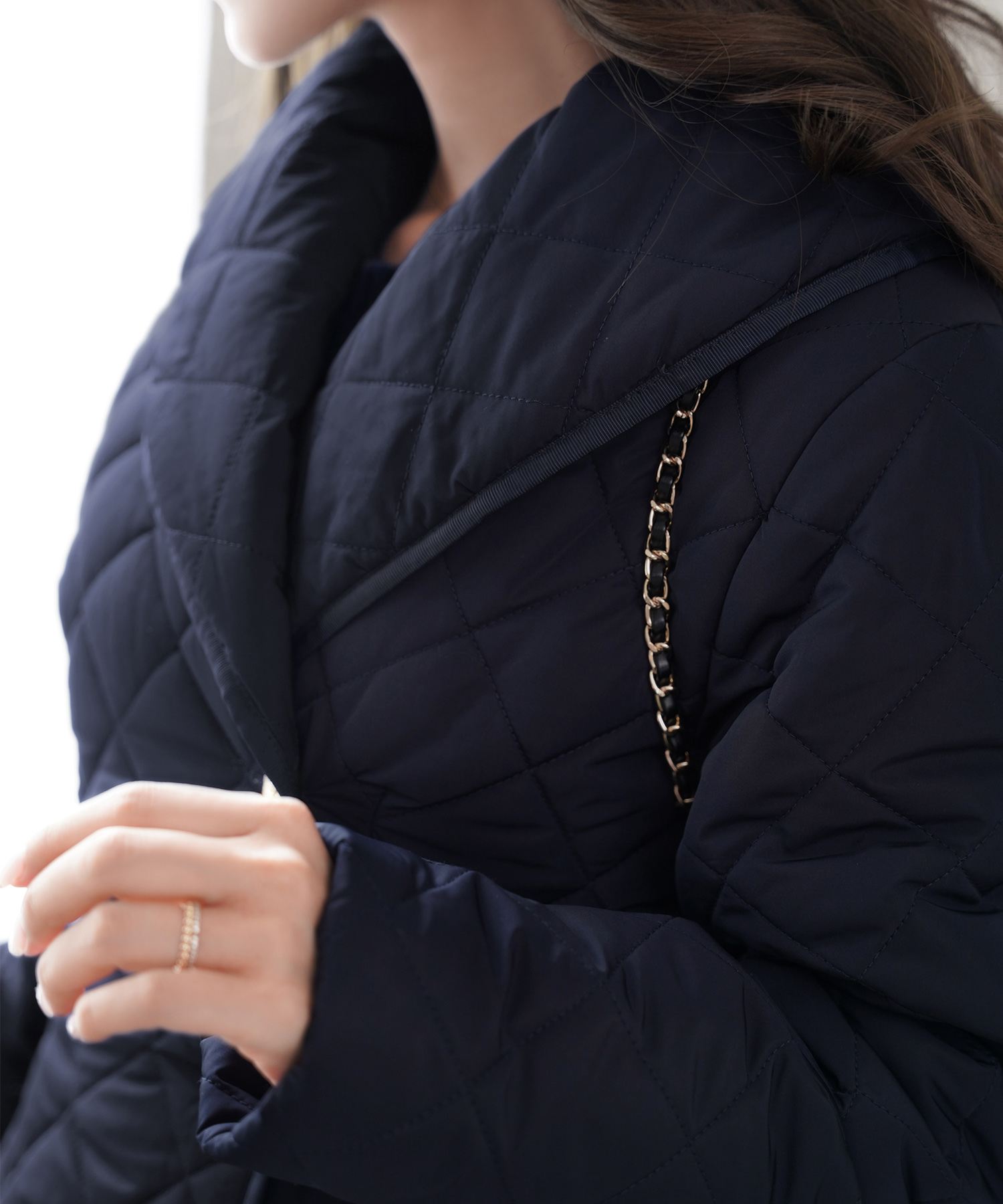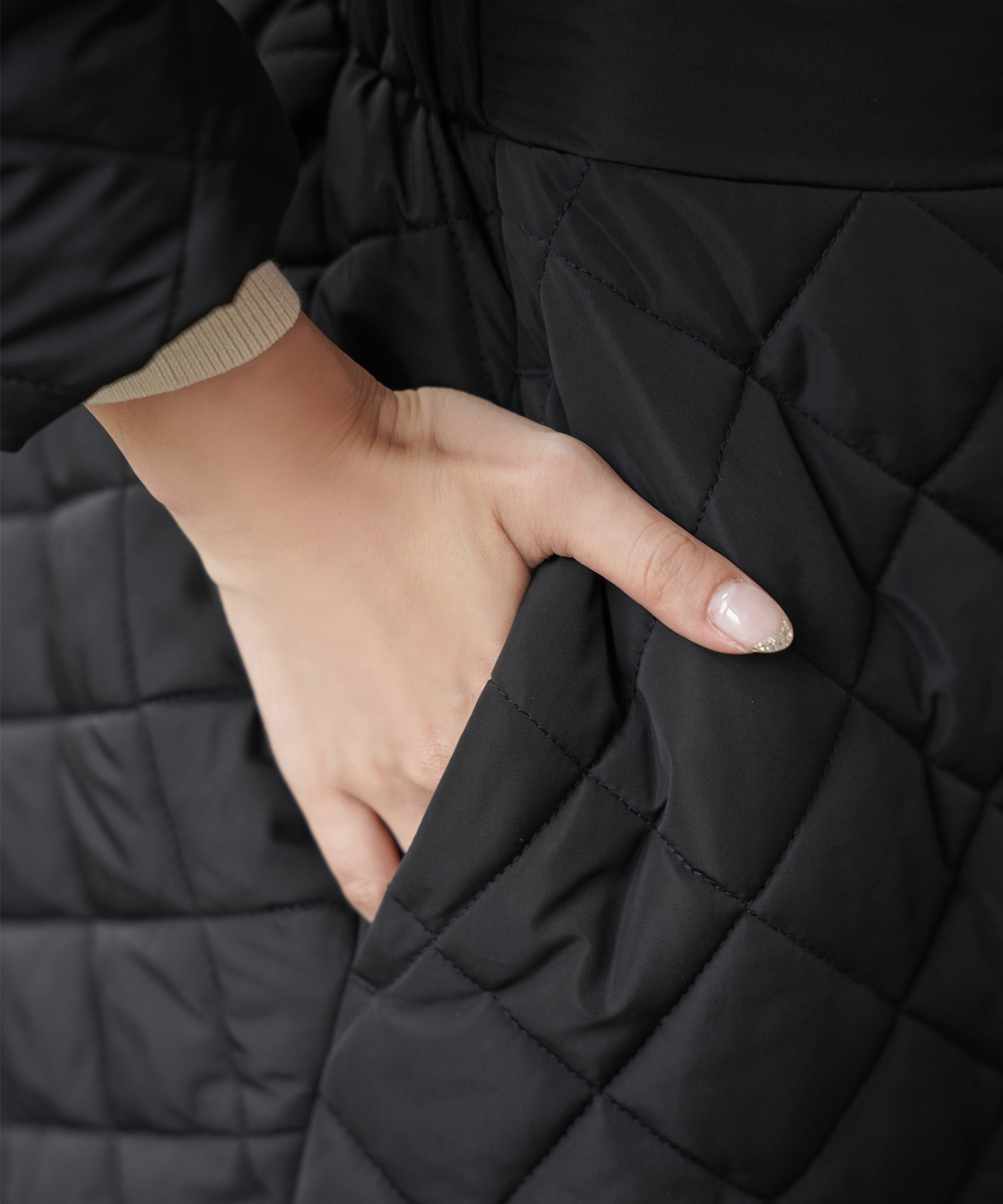 女性らしいシルエットが魅力のキルティングコートで、冬のお出かけを特別なものに。裾がふわりと広がるペプラムデザインとベルスリーブが、カジュアルな印象のキルティングを優雅な装いに格上げします。細身のパンツを合わせれば、美しいラインを活かした上品な冬コーデが完成。休日の街歩きやデートにぴったりの一着です。